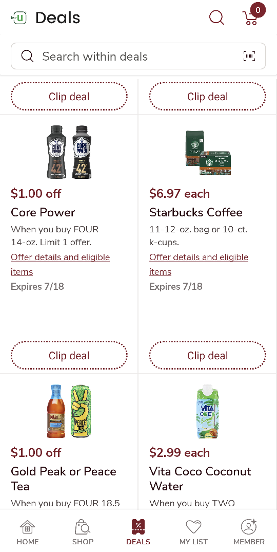 앱에서 로그인 후 보이는 쿠폰 페이지입니다. 하단 메뉴에서 Deals로 들어오세요. clip deal을 누르고 계산해야 할인 적용이 됩니다. when you buy two 라고 써있는 아이들은 복수구매를 해야 할인적용이 되요.