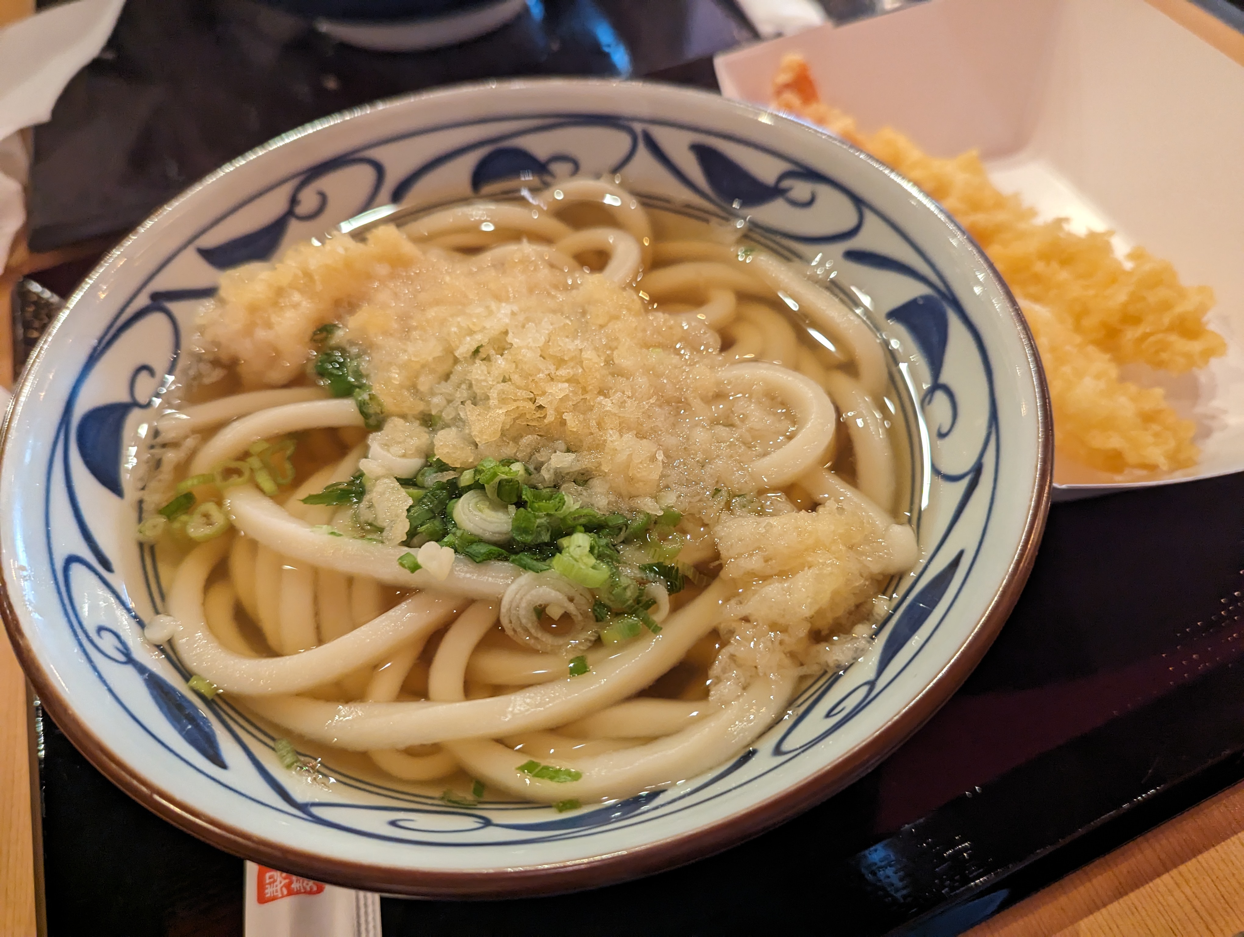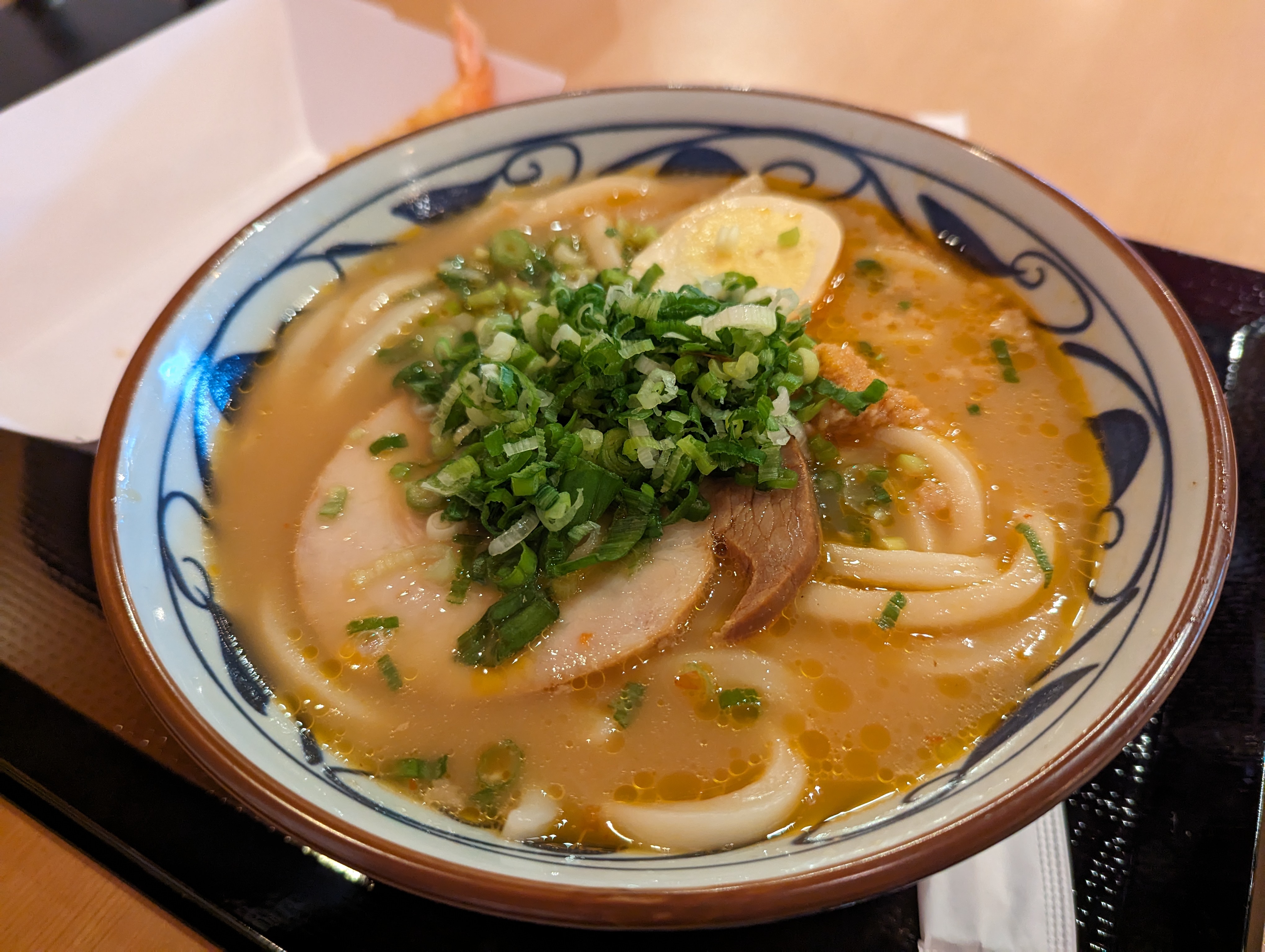 이건 돈코츠 라멘 국물에 우동면을 넣은 신기한 조합이에요. 사실 저는 일본에 사는 십여년동안 마루가메 제면에 가본 적이 없어서 현지 마루가메에 이 메뉴가 있는지도 모릅니다만 이 조합 자체를 일본 현지에서 본 적이 없어요. 일본에서 돈코츠 라멘은 라멘면으로만 먹으니까요. 아마 미국시장을 위해 개발한 메뉴가 아닐까 싶네요.