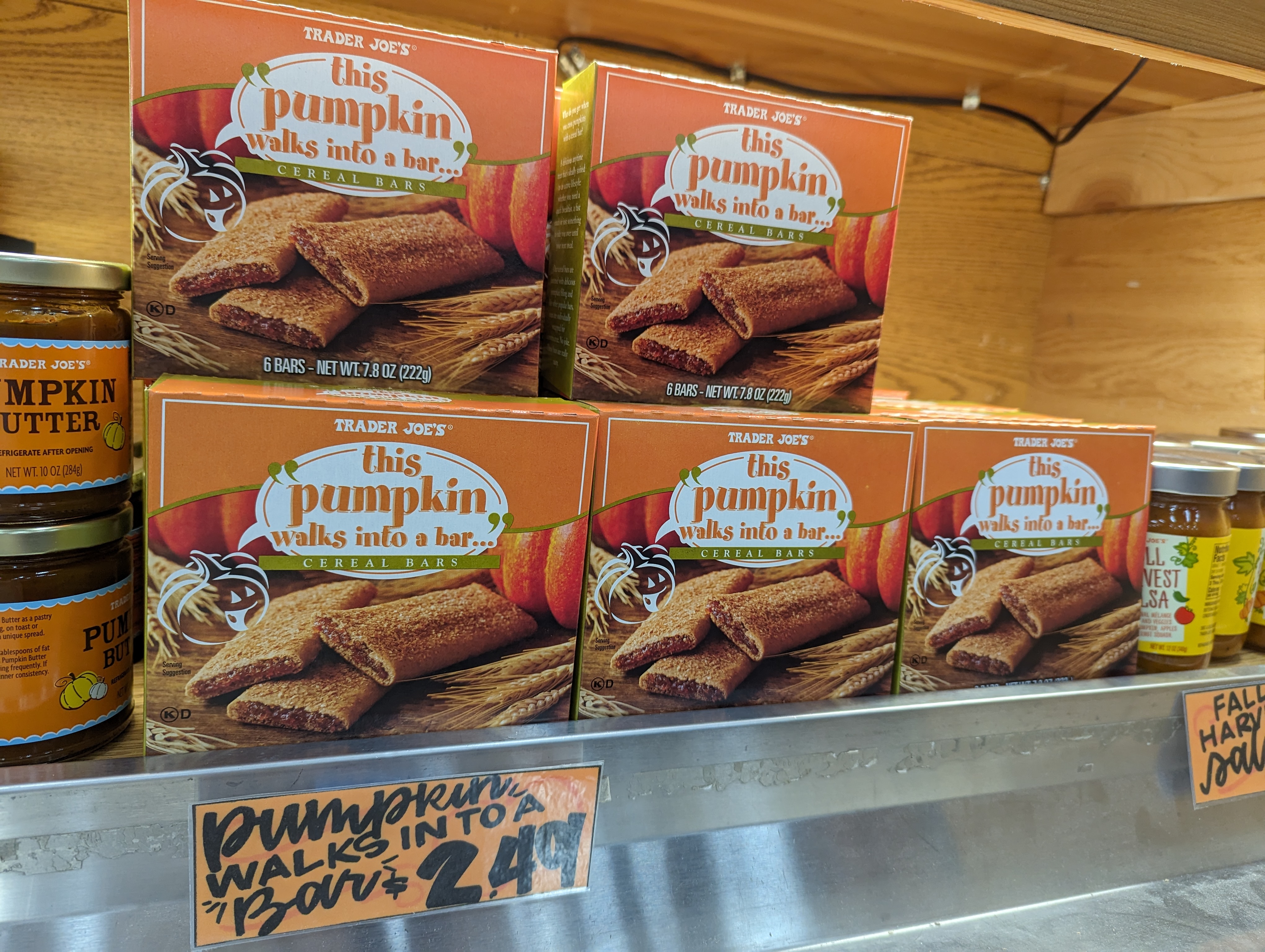 펌프킨 조조스, 펌프킨 스파이스 배톤, 펌프킨 모양 초콜렛, 펌프킨 스파이스 프렛첼, 펌프킨 그래놀라 바 등 펌프킨 좋아하시면 가을의 트레이더조스는 천국이죠.