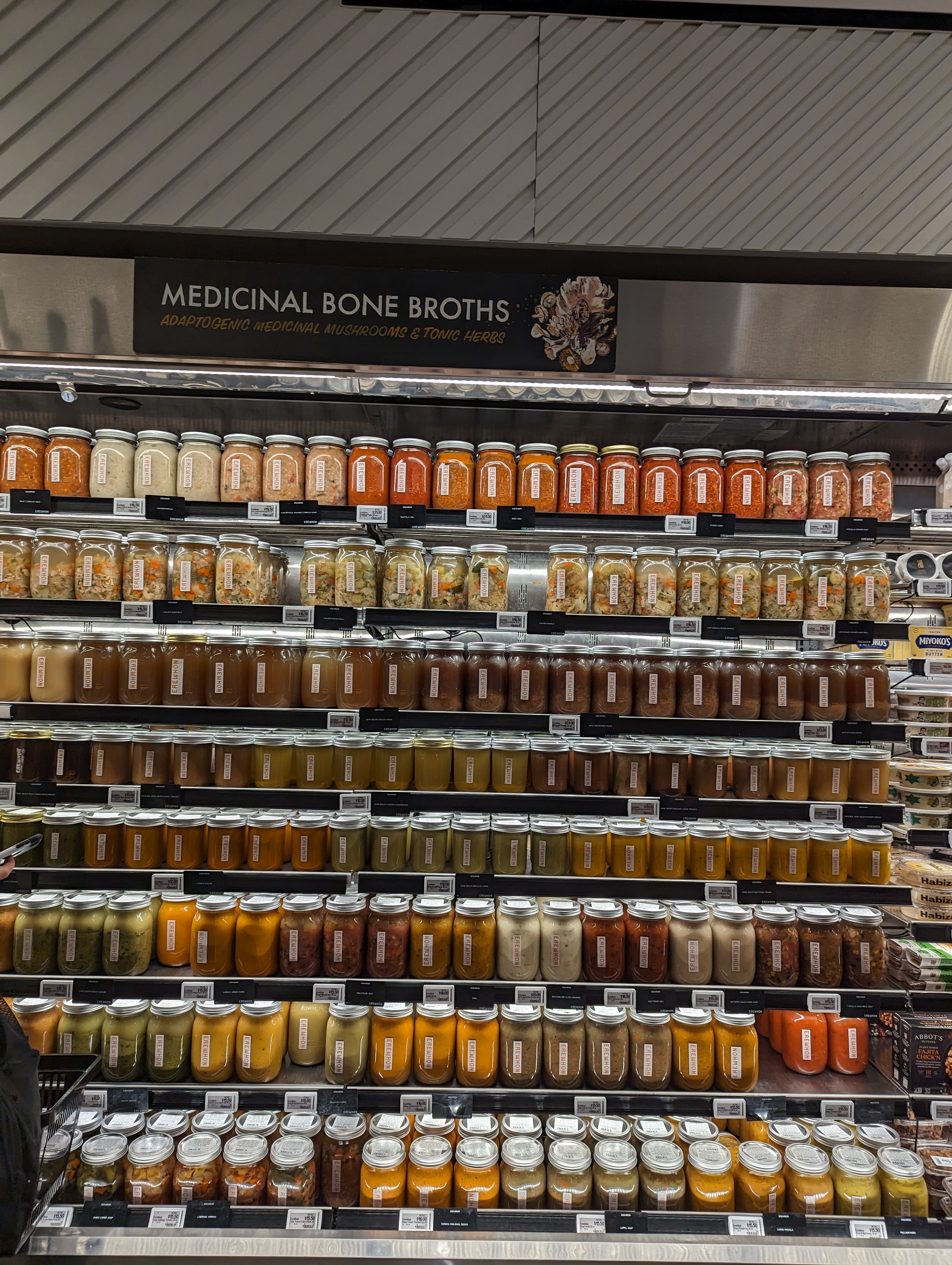 이날의 하이라이트입니다. Medicinal bone broth 코너가 있는데요, 쉽게 말하면 사골국 컬렉션이에요. 우리나라에서는 너무 흔하게 먹는 사골국이 여기서 이렇게 다양하게 개발되서 비싼 가격에 팔린다는 게 신기했는데요, 오뚜기나 비비고 등 우리나라 식품회사들이 이 좋은 기회를 잘 잡으셨으면 하는 바램입니다. 홀푸즈나 트레이더조스에 이렇게 사골국물을 입점해도 엄청 잘 나갈 것 같아요. 물론 medicinal이라는 타이틀에 걸맞는 성분을 좀 추가해서 말이죠.
