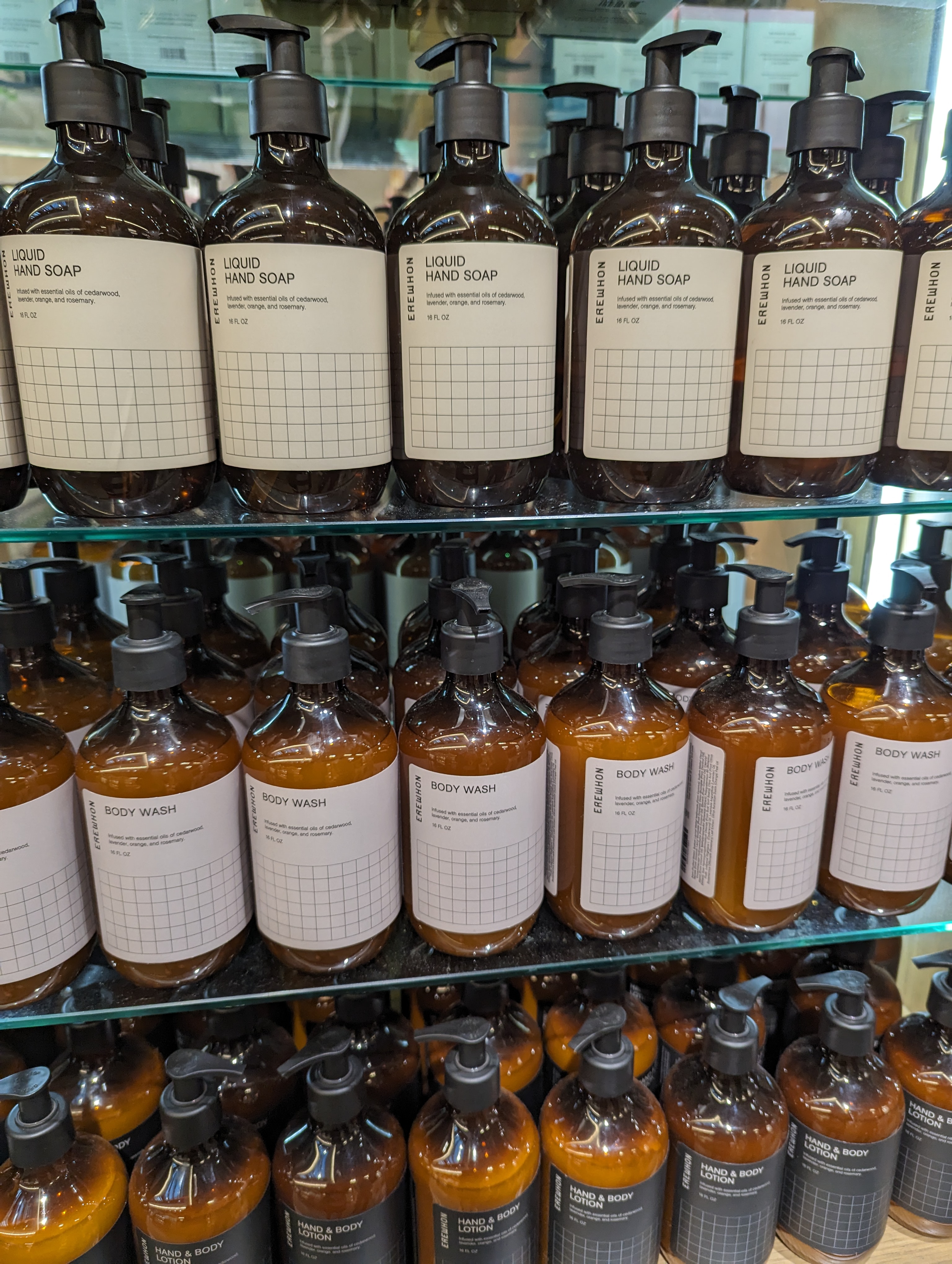 핸드워시 및 바디워시는 24달러정도 하네요. 홀푸즈만 가도 괜찮은 제품들 비싸봐야 15달러 정도에 살 수 있는데 별로 메리트가 느껴지지는 않아요. 디자인은 무난해요. 에이솝보다는 저렴하지만 여긴 보틀도 유리가 아닌 플라스틱이라서 좀 애매합니다. 캔들 및 비누도 팔아요.