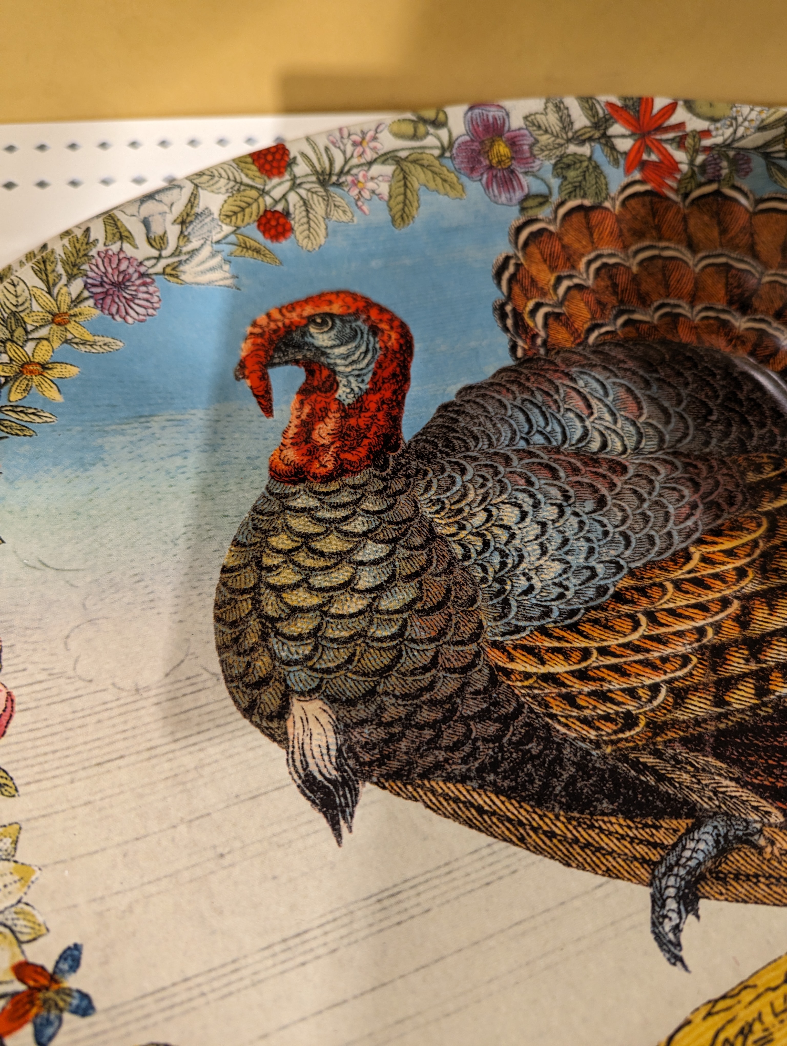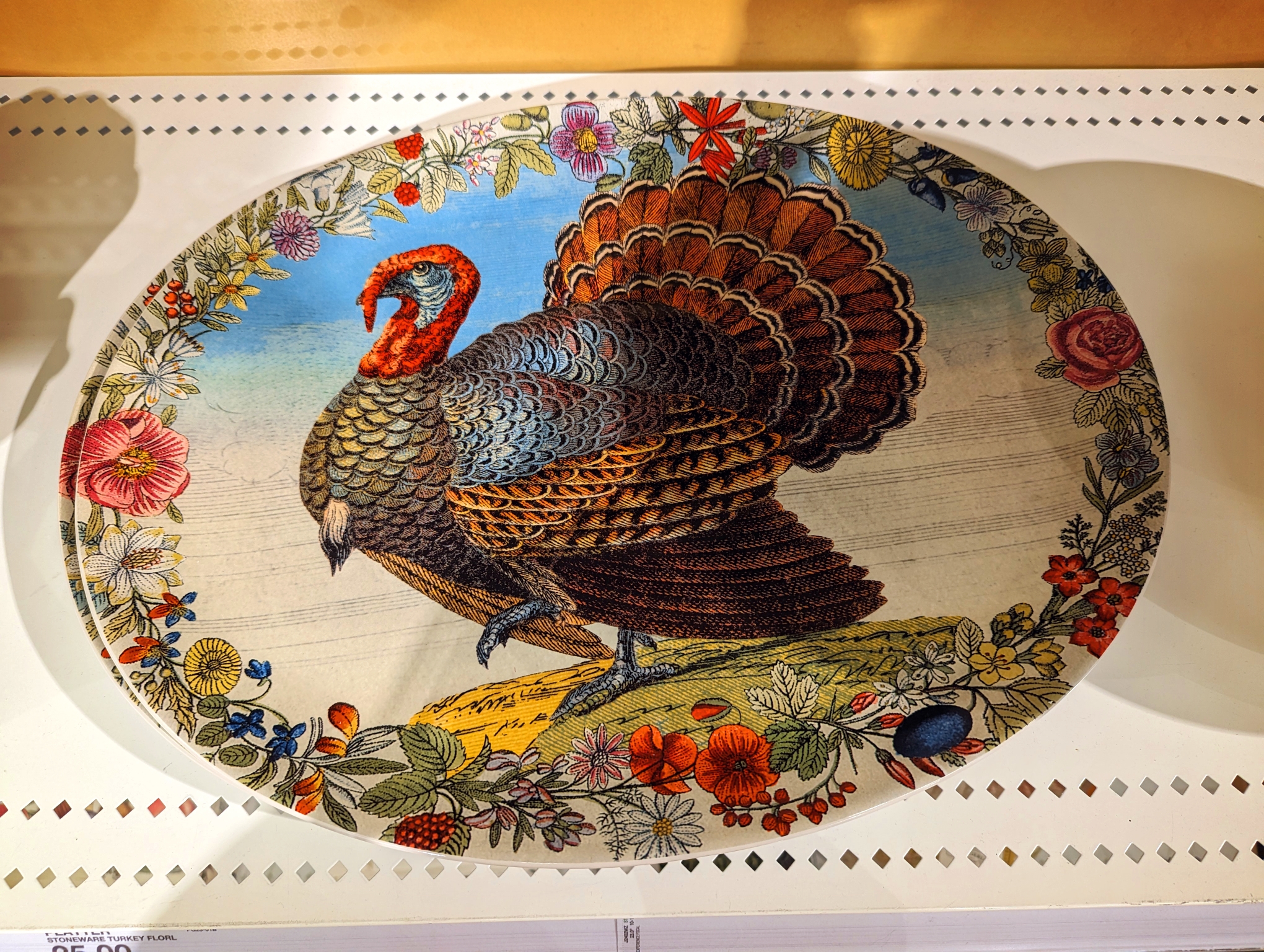 타겟에 가면 바로 이 John Derian이 디자인한 추수감사절 컬렉션을 50달러 이내에 만나보실 수 있는데요, 섬세한 터키 일러스트가 돋보이는 서빙 플레이트는 단돈 25달러에요. 솔직히 디자이너 이름이 없다고 해도 이렇게 고퀄리티 디자인 제품을 이 가격에 판다는 것 자체가 너무 신기한 것 같습니다. 이건 스톤웨어고요 실제로 보면 크기도 엄청 큽니다.
