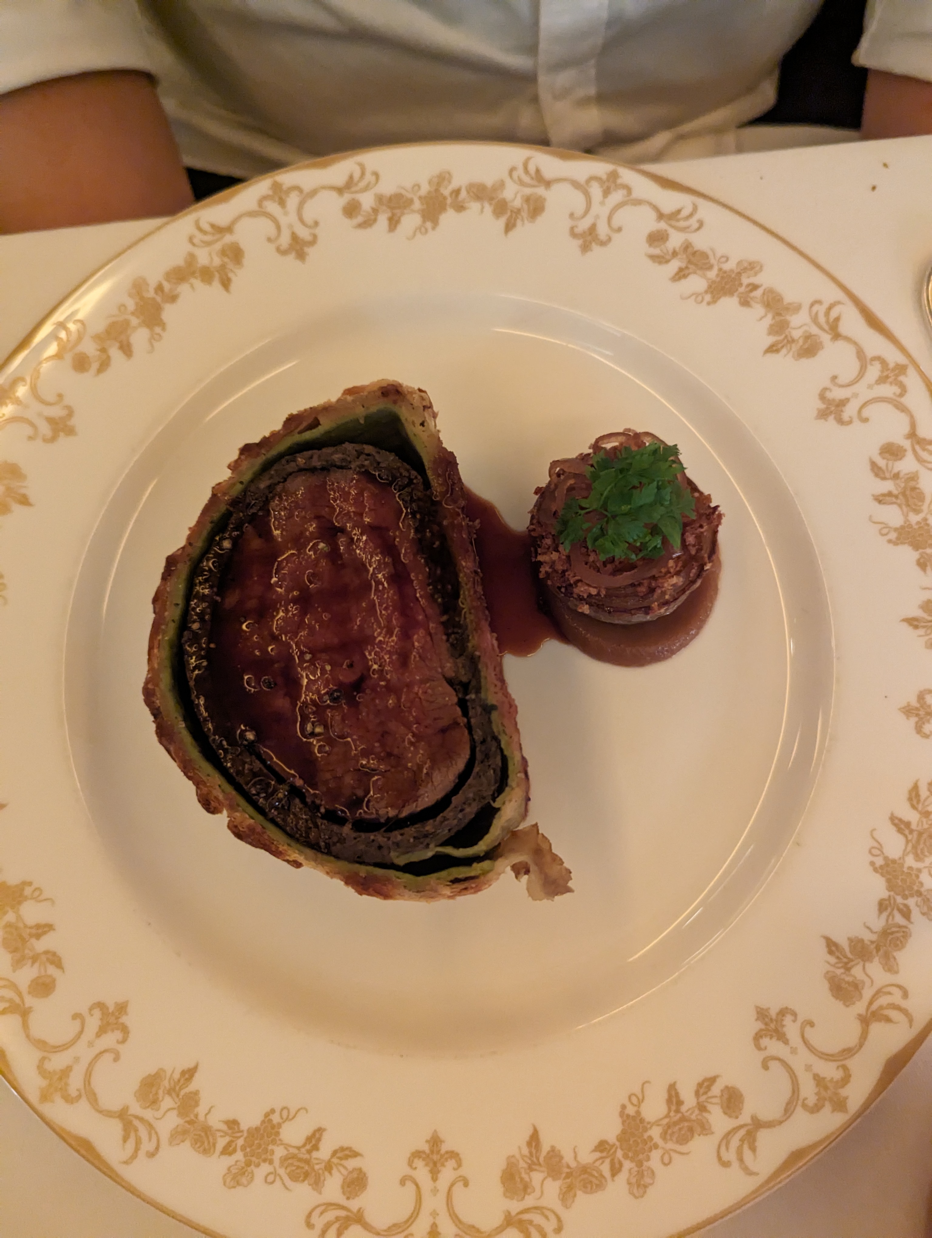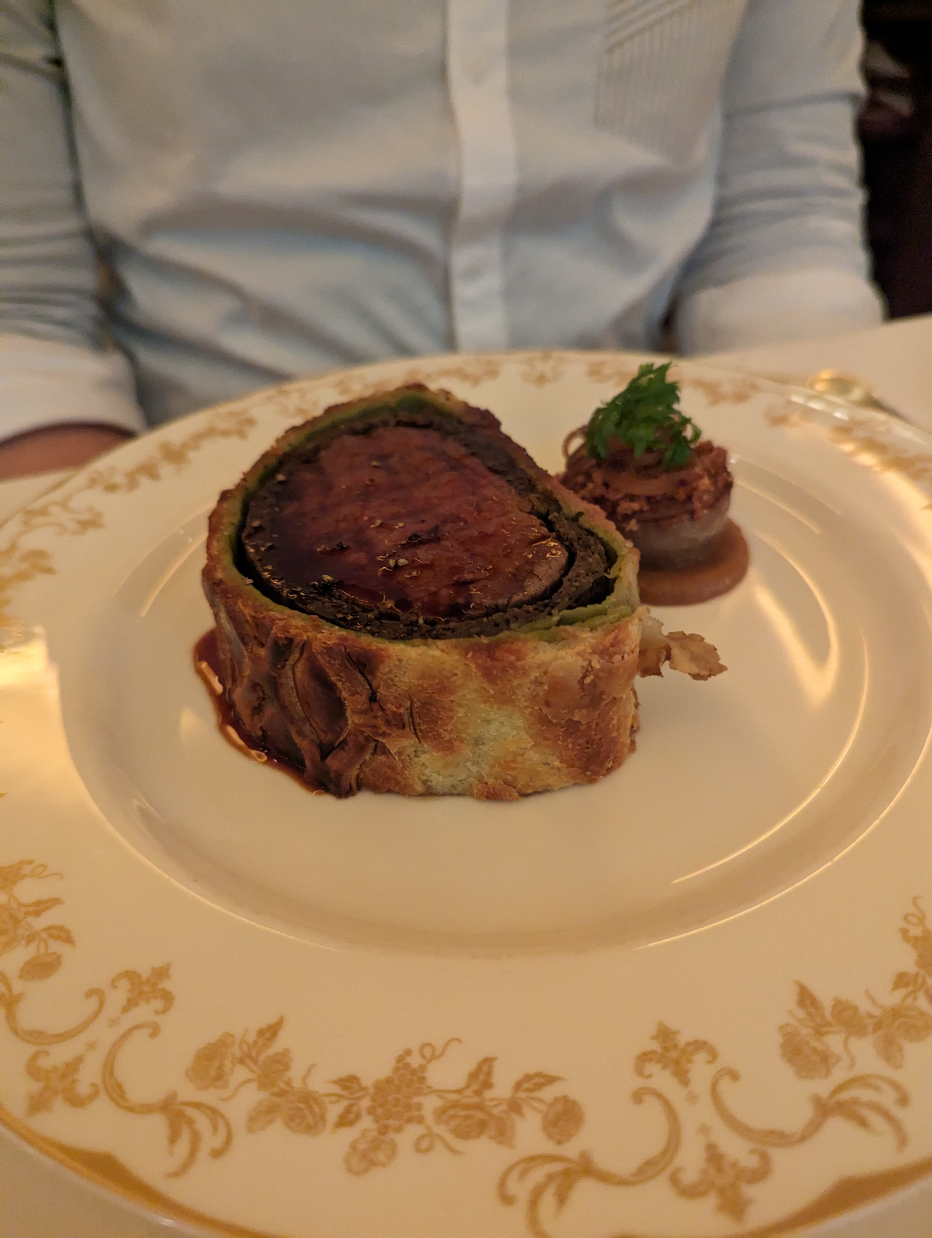 대망의 비프 웰링턴이에요. 가격은 65파운드입니다. 1인당 110파운드 코스메뉴도 있지만 여기서는 정말 궁금했던 메뉴만 먹어보고 나왔어요. 워낙 분위기가 산만해서 코스메뉴를 즐기기 쉬운 상황도 아니었죠.