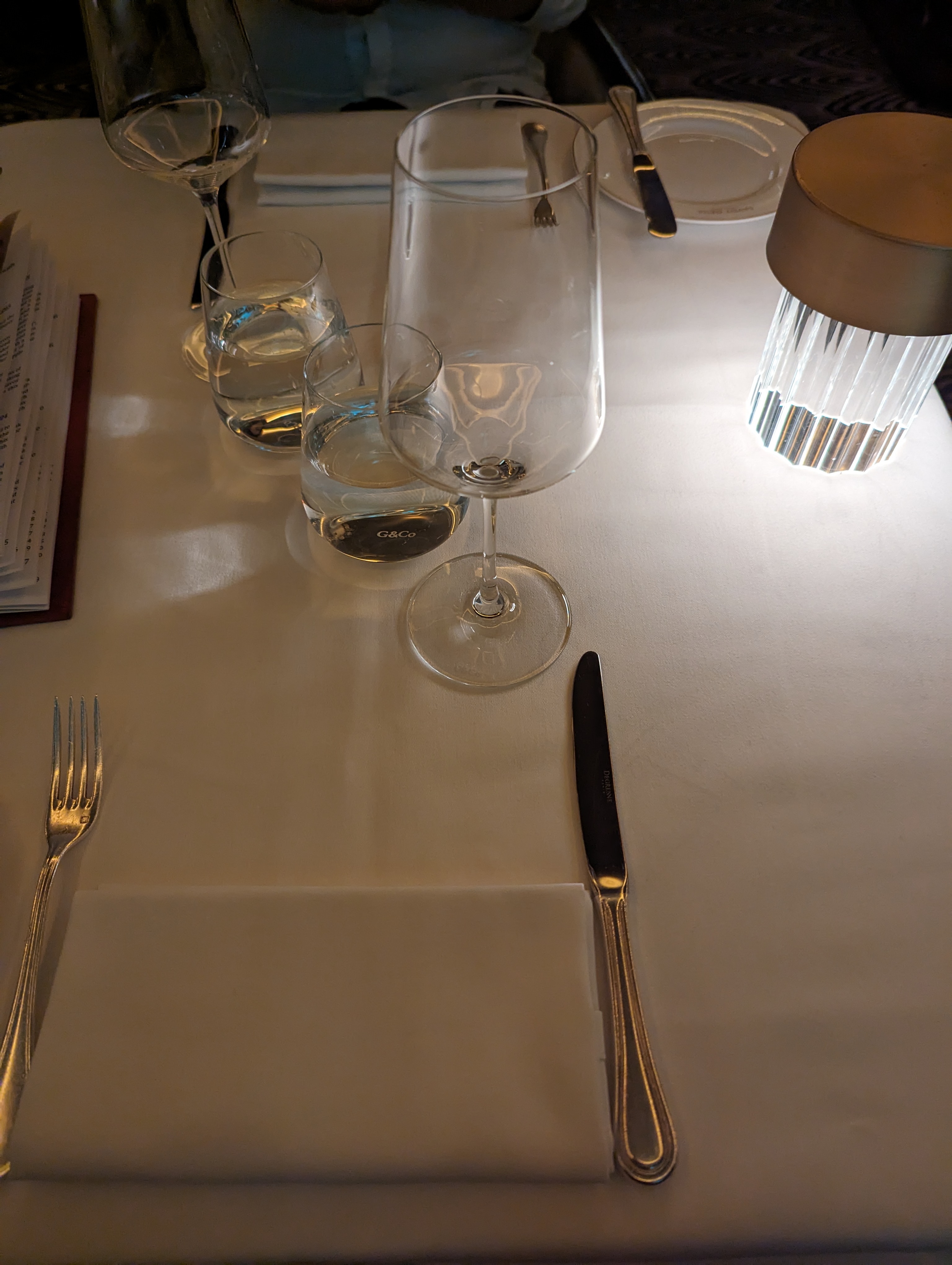 테이블 세팅입니다. 자리는 넉넉하지만 테이블은 좀 작아요. 분위기가 굉장히 캐주얼하고 솔직히 엄청 시끄럽습니다. 저희는 평일 저녁에 가서 더더욱 그랬을 것 같아요. 런던에 출장 온 직장인들이 회식하러 오는 핫스팟이라서 정장차림의 나이든 아저씨들이 많아요. 로맨틱하거나 예쁜 분위기는 아닙니다.
