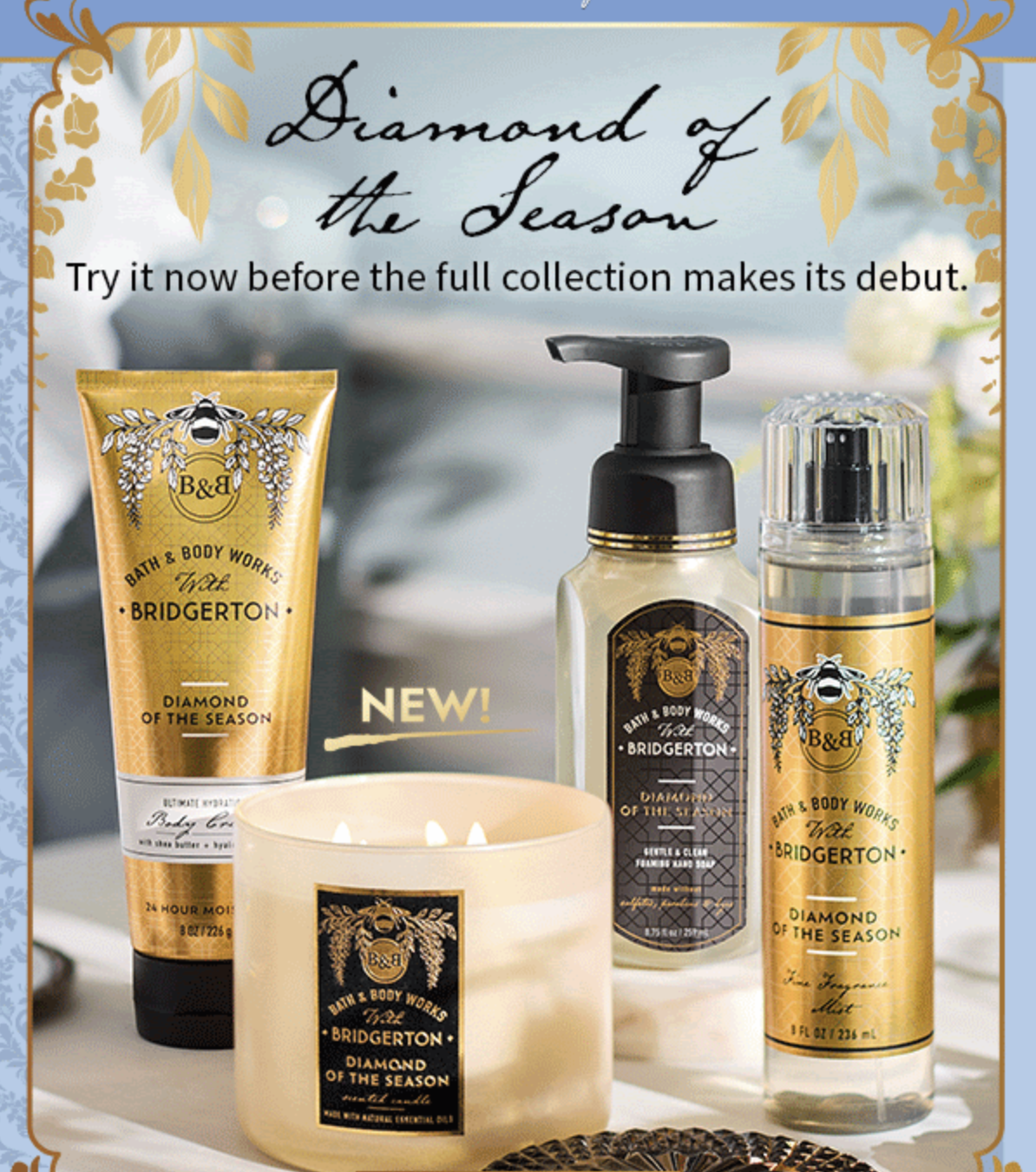 이렇게 회원들에게 전송된 티저 메일 이미지를 보면 핸드워시, 캔들, 바디미스트, 바디크림 및 바디로션이 준비된 것을 볼 수 있어요. 향의 이름은 Diamond of the season이라고 합니다. 브리저튼 좋아하시는 분들은 무슨 의미인지 다 아시겠죠.