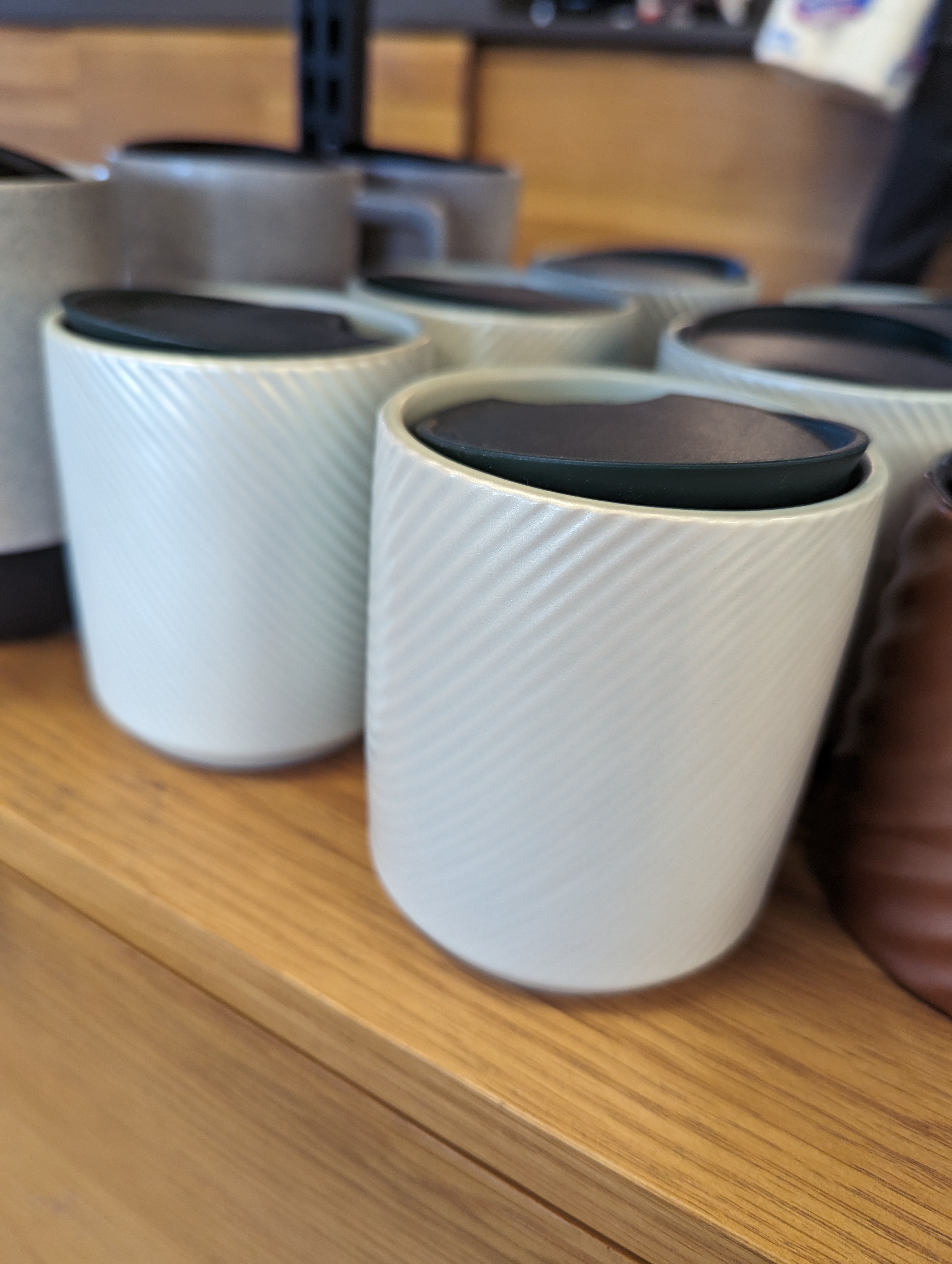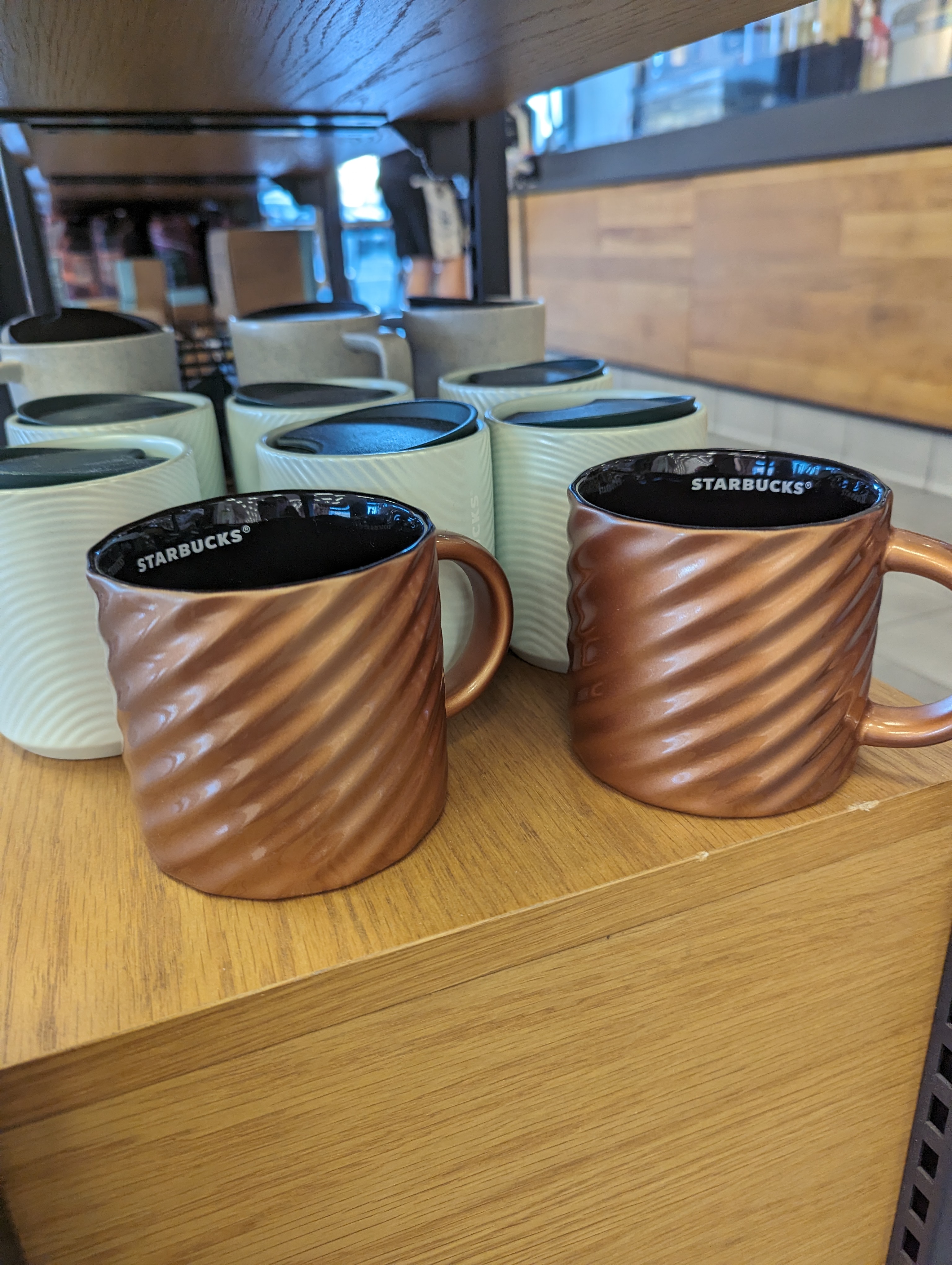로즈골드 컬러의 머그도 있어요. 스타벅스 로고가 대놓고 들어가지 않아서 더 예쁜것 같아요. 뒷쪽에 보이는 흰색 머그 텀블러도 상당히 괜찮아 보였습니다. 둘다 은은한 쉬머가 들어가서 더 고급스럽게 느껴져요.