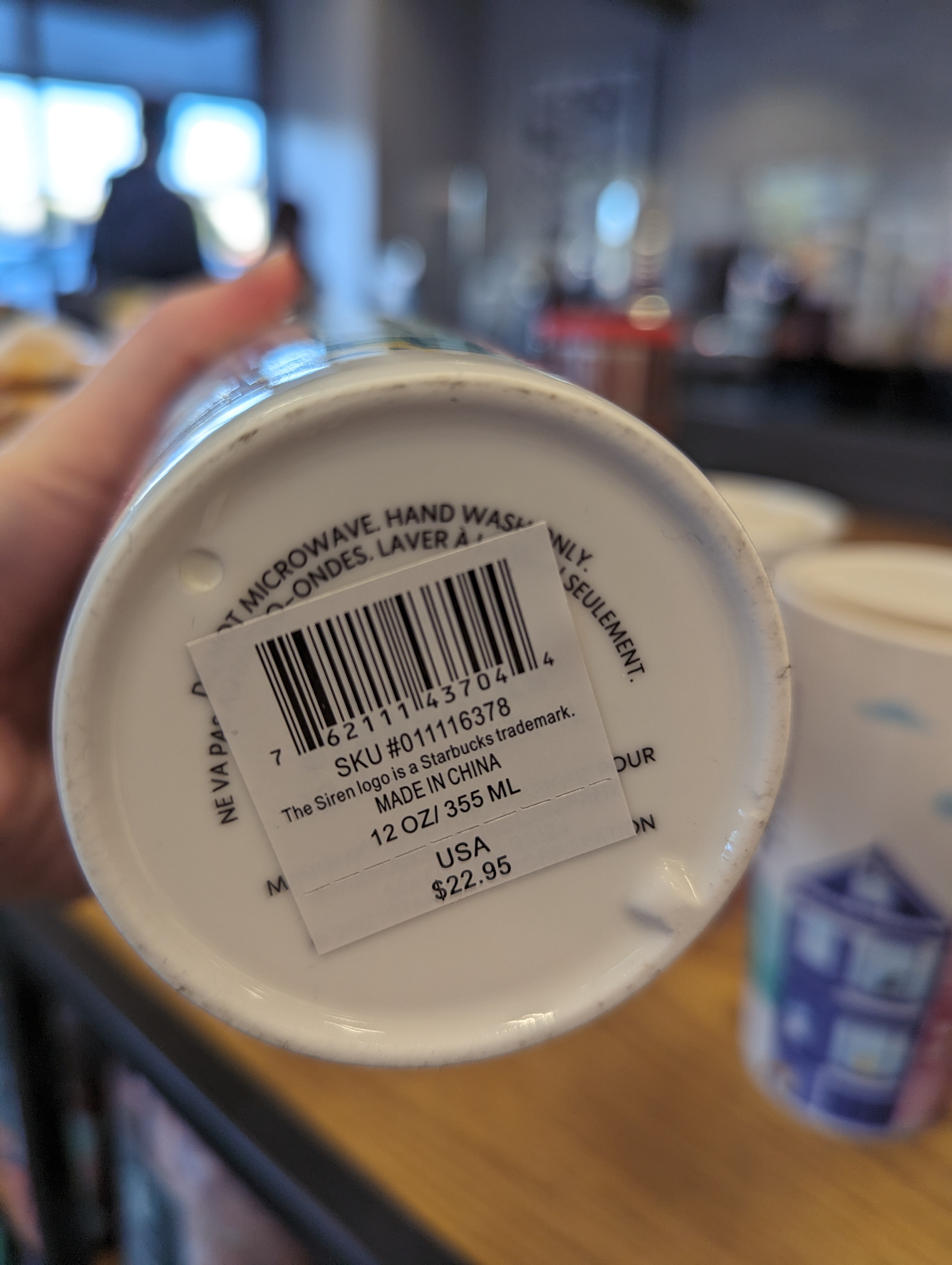 가격은 22.95달러이고 355밀리 사이즈에요. 골드컬러의 폰트가 들어가서 전자레인지 사용은 안된답니다.