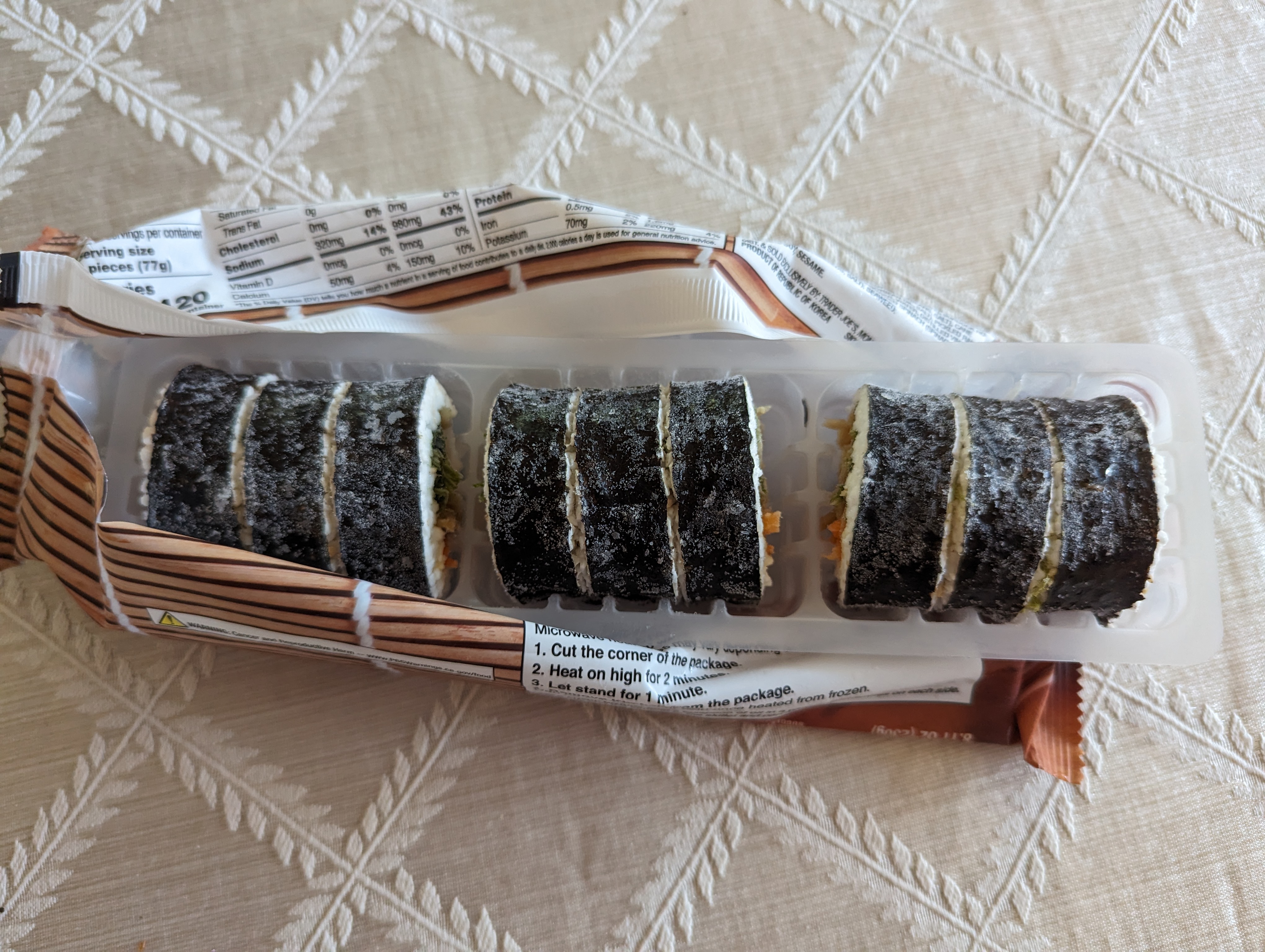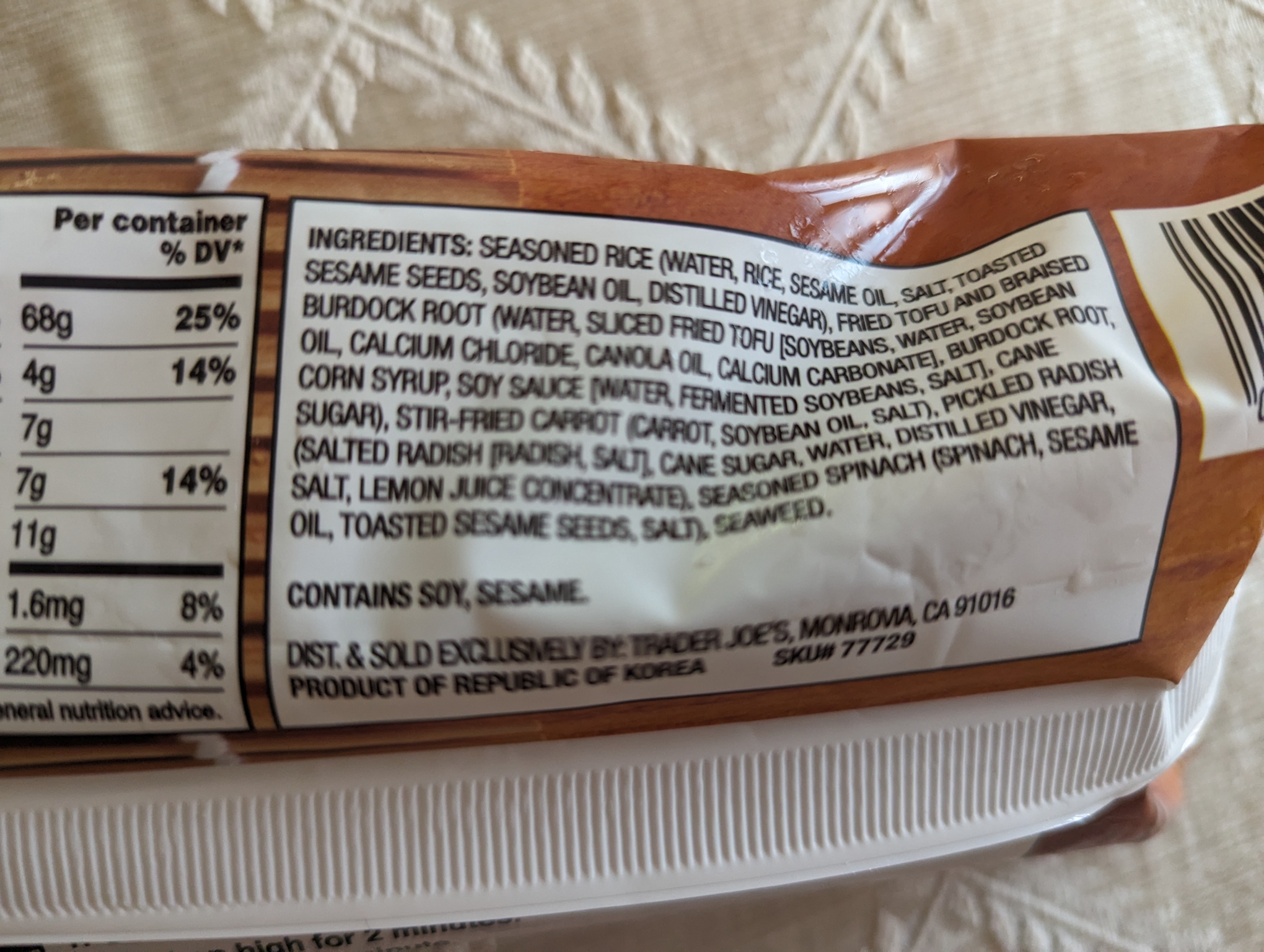 두근두근 너무 신나요. 트레이더조스 김밥이 바이럴 된지 체감상 일년도 더 된거 같은데 이제야 실물을 보네요. 패키징도 센스있게 김밥말이 위에 김밥을 올려놓은 모습이에요. 한국어로 트레이더 조 라고 써있는 로고도 너무 귀엽습니다. 포장에는 두부가 들어있다고 해서 좀 당황했는데 집에 와서 뜯어보니 유부더군요.