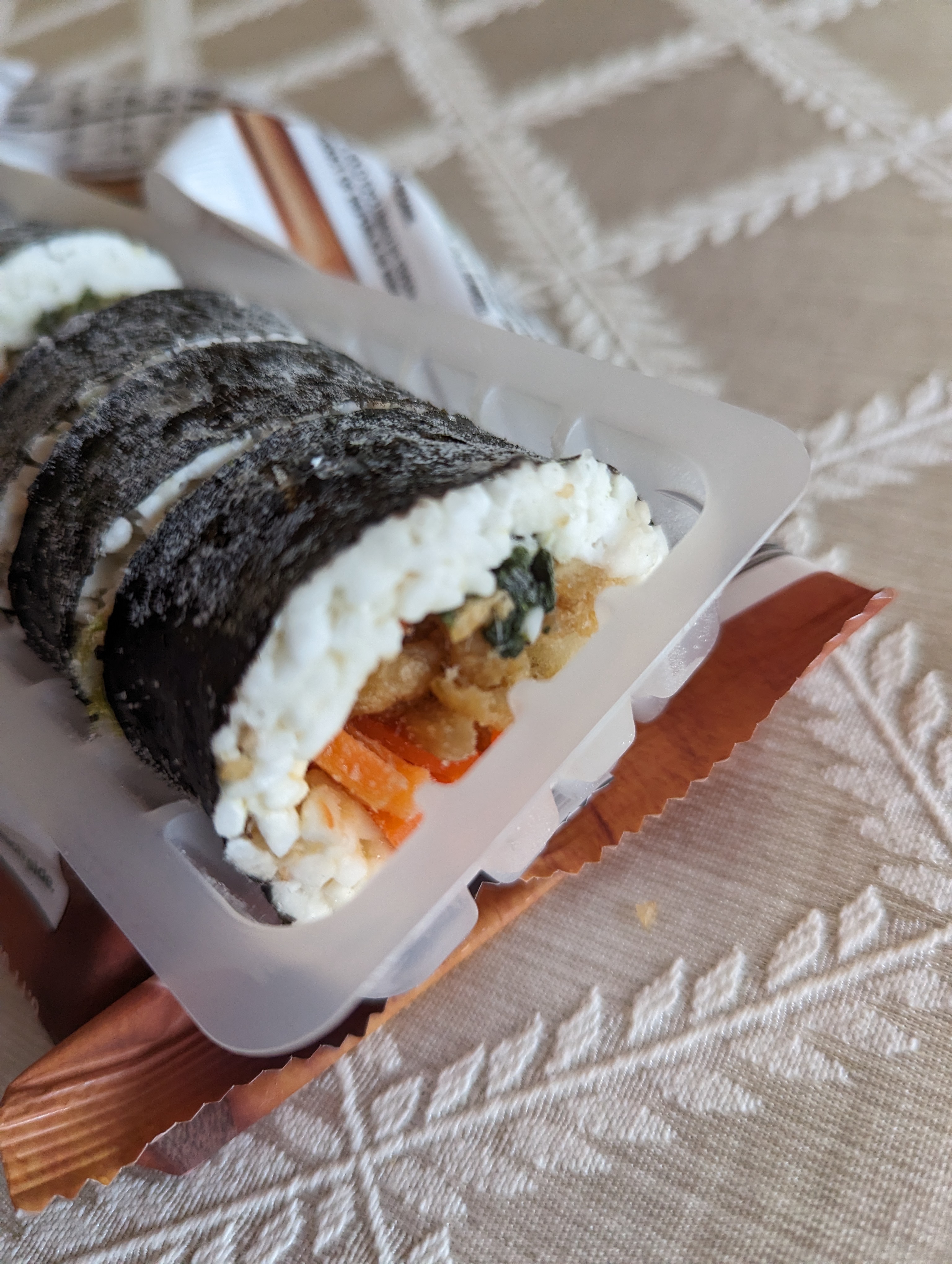 김밥천국보다는 김가네 사이즈에 가까워요. 내용물을 간단히 살펴볼게요. 고기류 및 계란 지단은 없고요, 유부, 당근, 단무지, 우엉, 시금치 이렇게 심플한 구성이에요. 사실 미국에서 우엉도 유부도 찾기가 쉽지 않기 때문에 저는 오히려 좋은 것 같아요. 여기 단무지도 팔긴 하지만 대량으로 김밥 만들 일이 별로 없어서 한번 뜯어놓으면 정말 애매하거든요. 고기, 햄, 계란은 어딜가든 살 수 있으니 따로 준비해서 곁들여 먹을 수 있잖아요.
