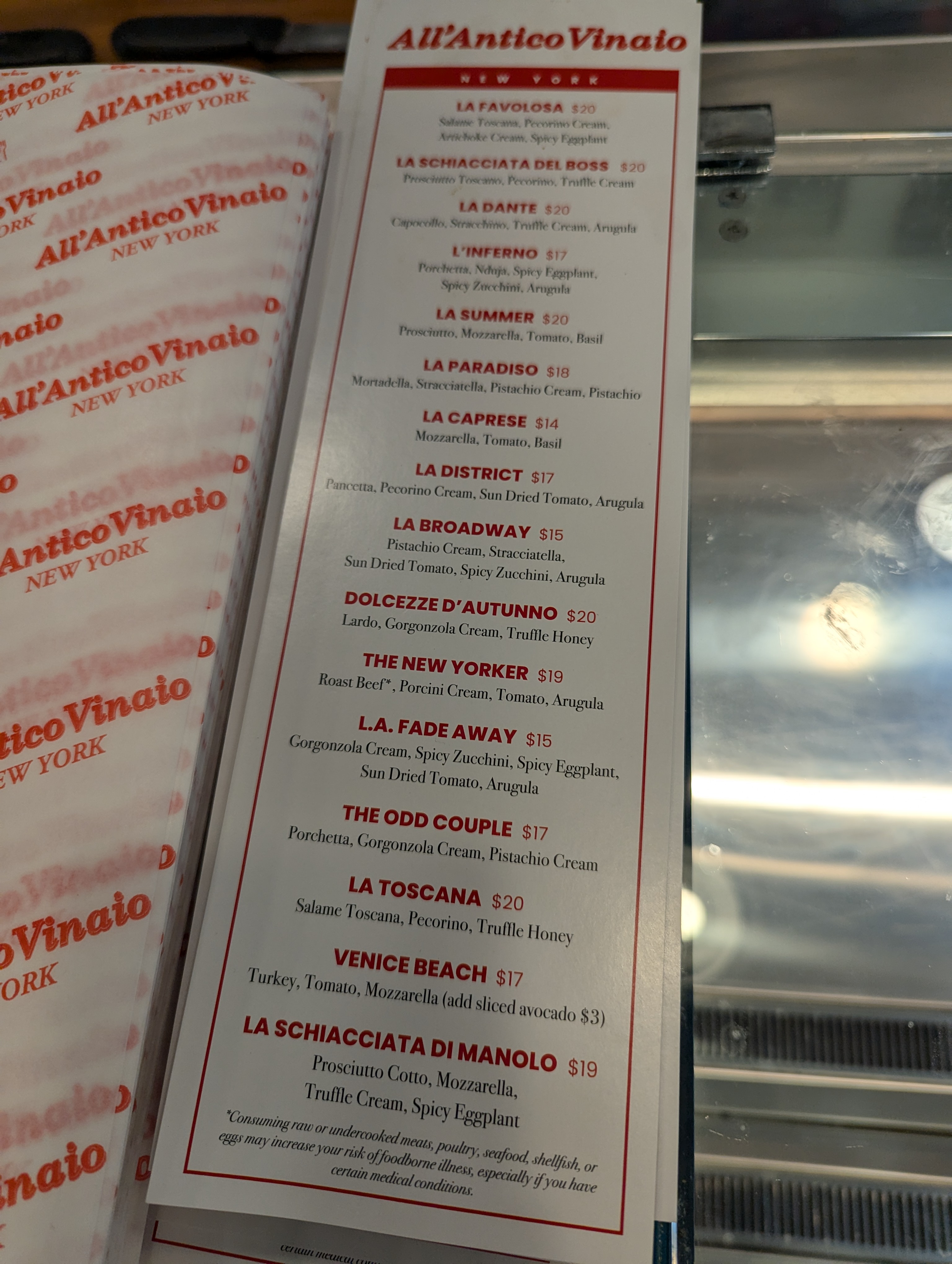 피렌체에서는 한시간 줄서서 기다리는 맛집인데 다행히 뉴욕에서는 아직 사람들이 잘 모르는지 한산했어요. 일부러 평일 오후 다섯시 정도에 방문한 덕도 있는 것 같아요. 샌드위치는 점심메뉴라는 인식이 강해서 저녁시간에는 (7시정도) 빨리 문을 닫는 편이에요.