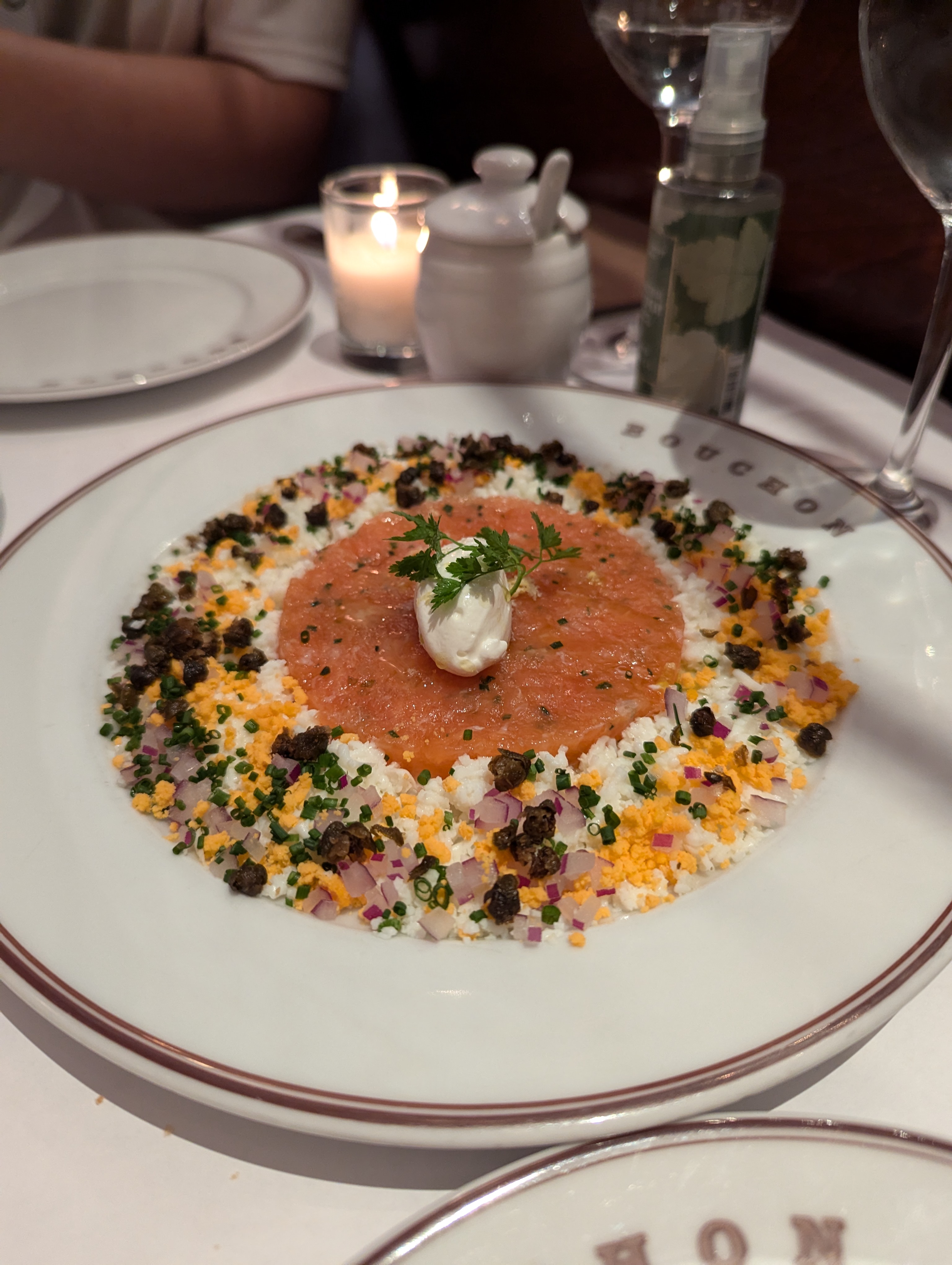 다음은 달팽이 요리 에스카르고 Escargots de Bourgogne 입니다. 바삭한 퍼프 페이스트리 밑에 달팽이가 숨어 있답니다. 가격은 23달러였어요. 어쩌다보니 에피타이저만 세개 시켜서 나눠먹었는데 메인디쉬보다 에피터이저가 더 와닿을 때가 있죠. 메인디쉬는 30-50달러 선이었는데 좀 거하게 먹는 메뉴 (스테이크, 램레그 등) 위주라서 이 날은 패스했네요. 프렌치 런드리 레스토랑과는 당연히 비교하기가 어렵겠지만 현재 미국 파인다이닝 계의 거장으로 꼽히는 토마스 켈러 셰프님의 요리세계가 궁금하시다면 방문을 강추드립니다.