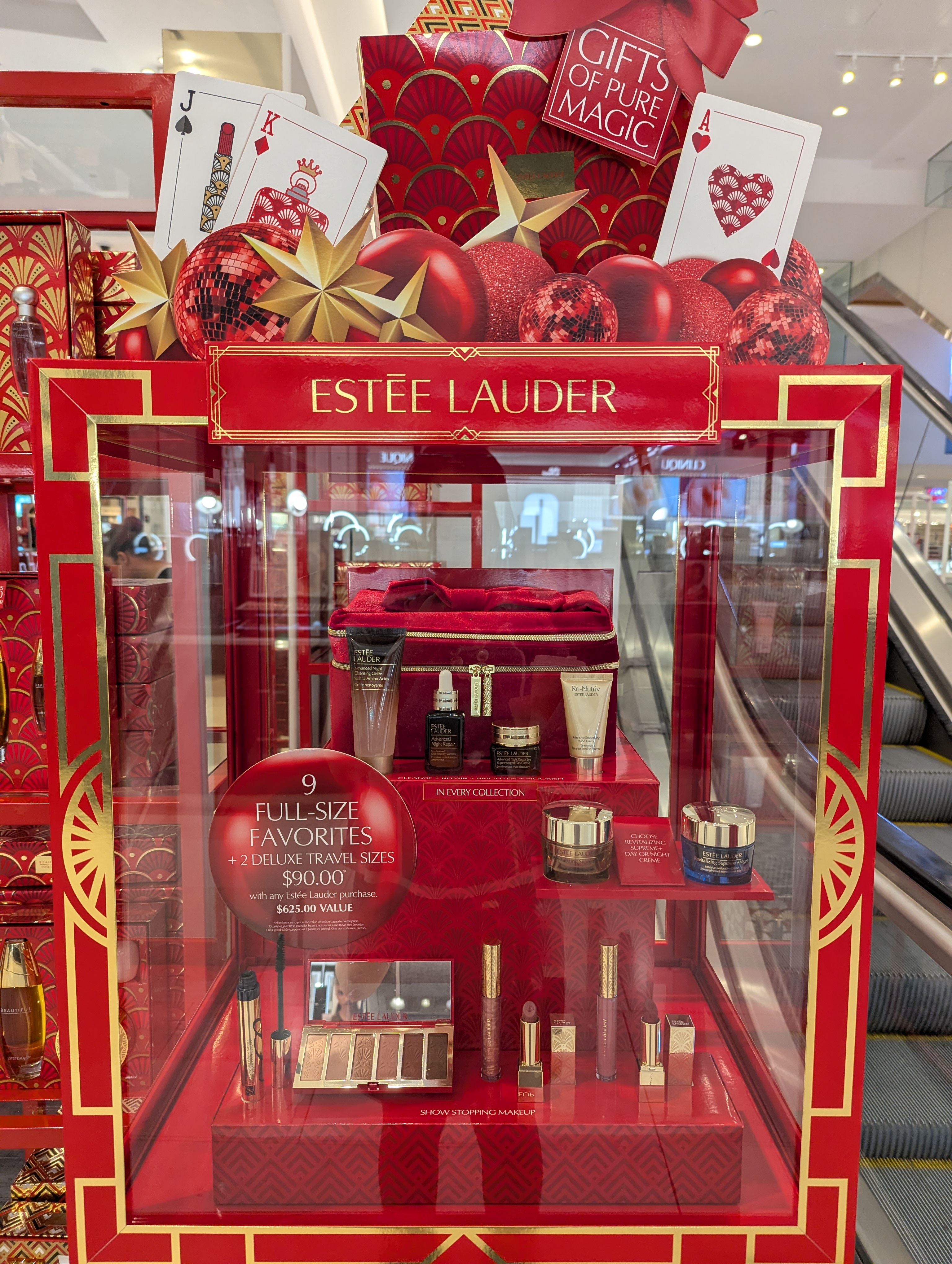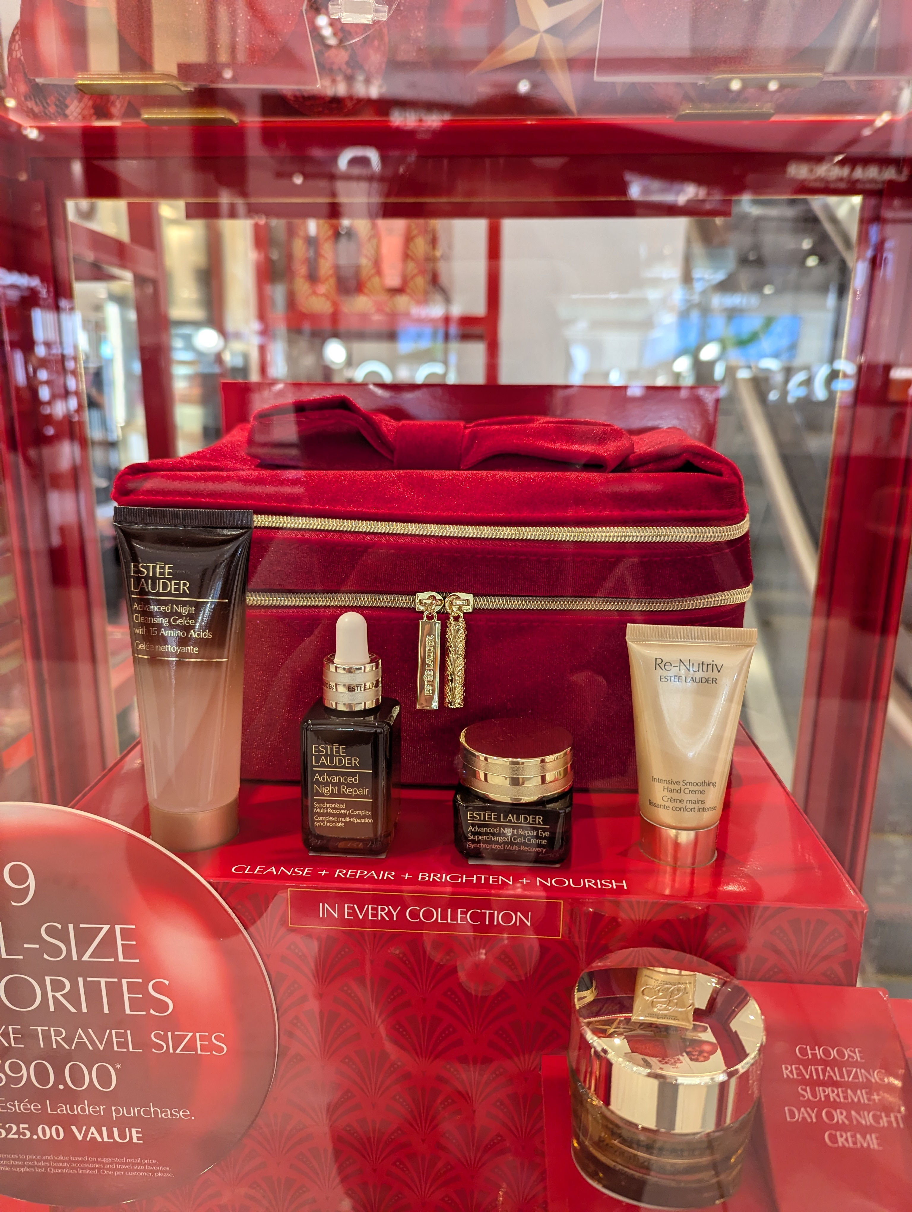 다음은 에스티로더입니다. 디스플레이가 가장 화려하네요. 625달러 상당의 제품들이고 90달러에 살 수 있어요. 랑콤보다 좀 비싼 대신 이건 에스티로더 제품 어느 제품을 사도 바로 구매가 가능하다고 합니다. 립제품울 무려 네개나 주고 매년 달라지는 메이크업 케이스도 한층 고급스러워 보이는게 사실이죠. 립스틱 확대사진이 없어서 죄송한데 무려 패턴이 양각디자인 되어 있어요. 작은 아이섀도우가 조금 아쉽지만 다른 장점이 많은 구성이에요.