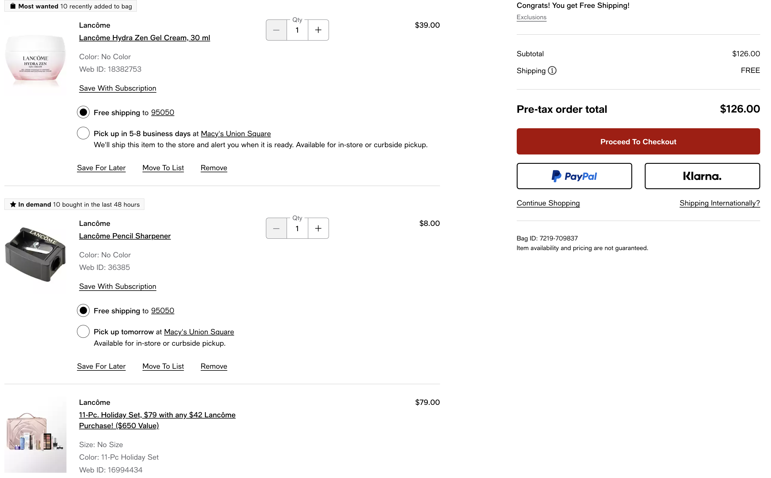 예를 들어, 이드라젠 39달러 + 샤프너 8달러 합치면 42달러가 넘어서 홀리데이 박스 구매가 가능해요.