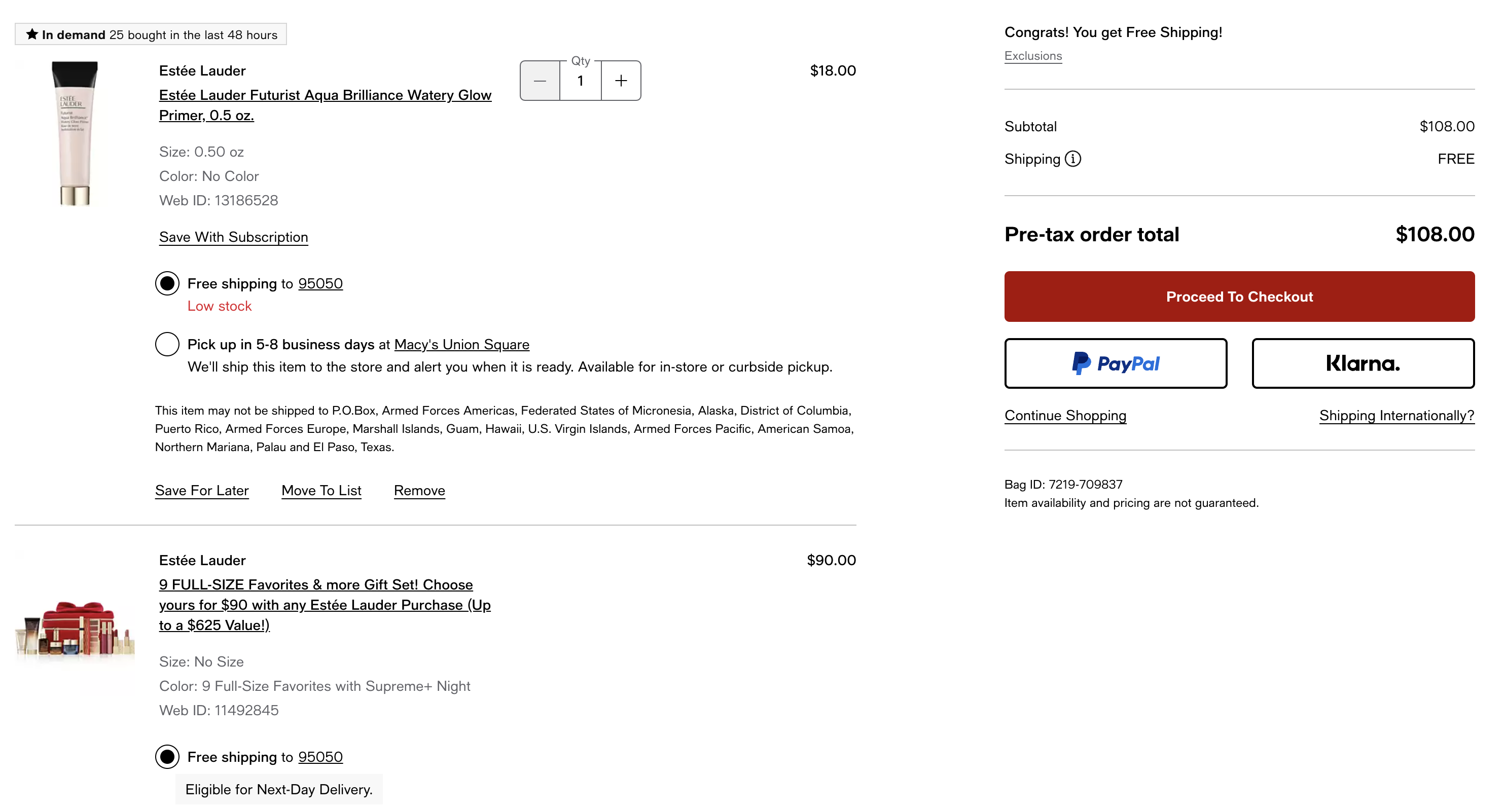 예를 들어, 이렇게 18달러짜리 프라이머를 사도 홀리데이 박스 구매가 가능합니다. 트레블사이즈 제품 구매는 해당이 안되는 것 같으니 홀리데이 박스 구매가 가능한 상품인지 확인하고 계산하시면 될 것 같아요.