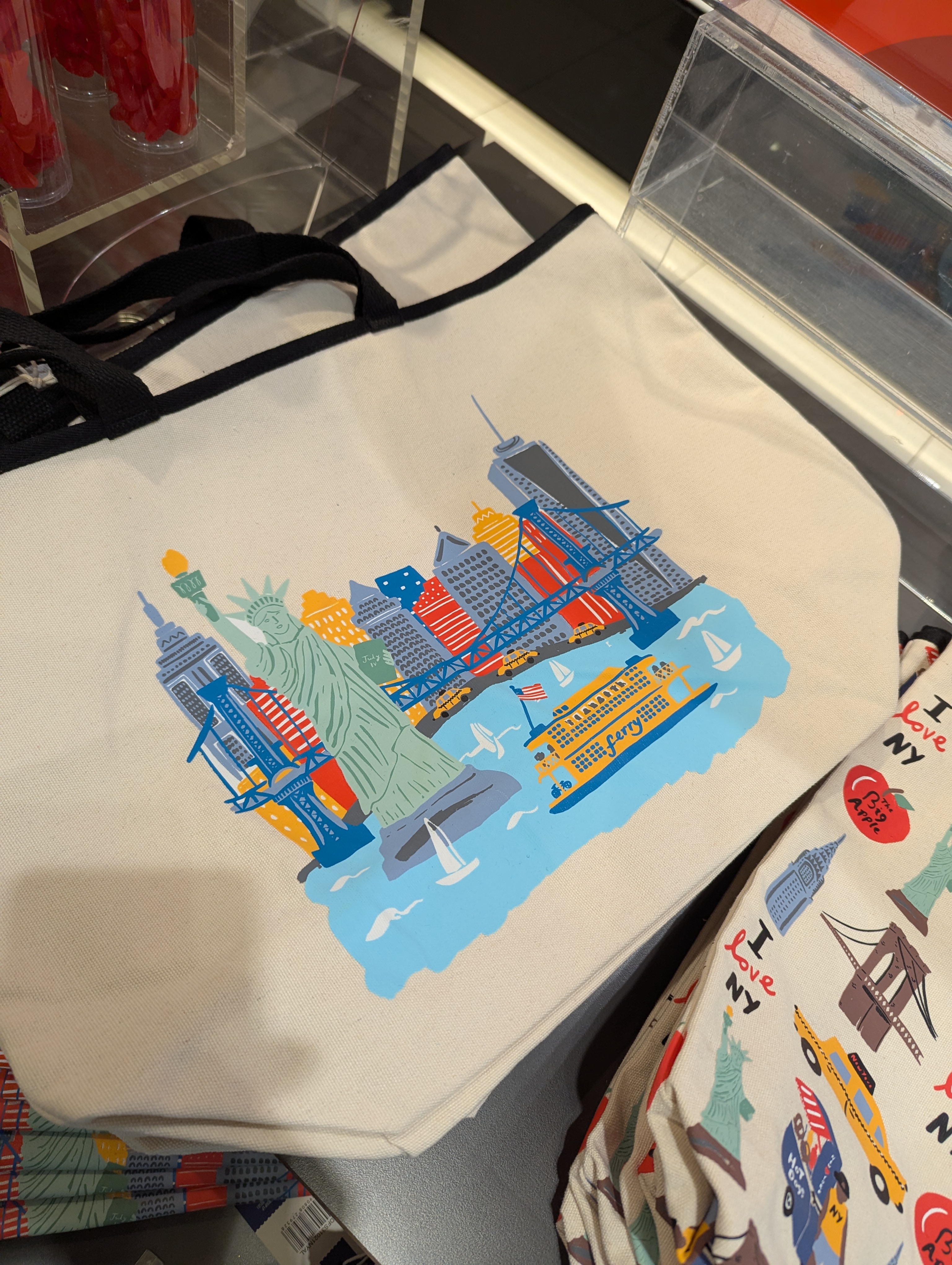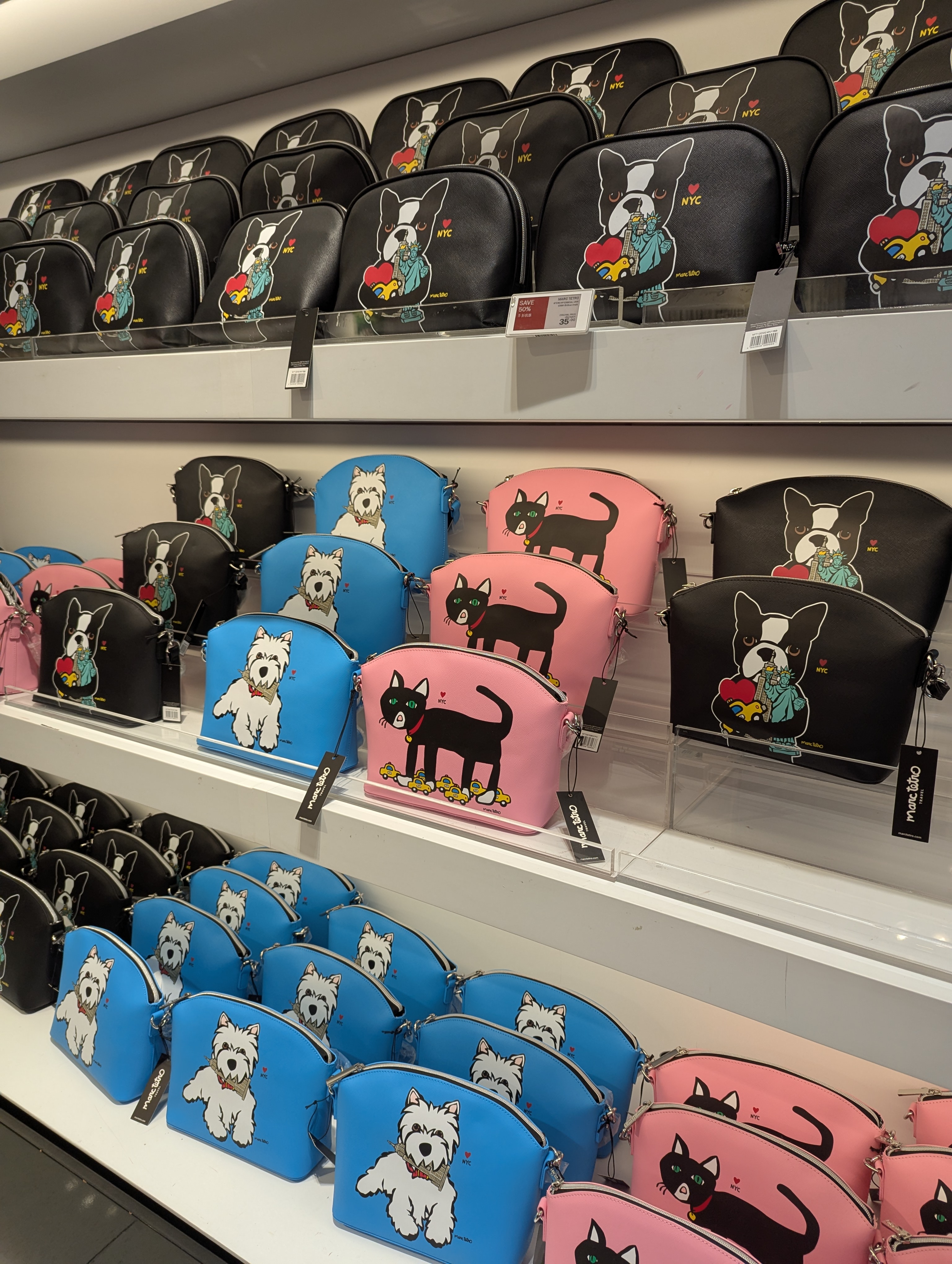 의외로 이번에 세일하는 상품들도 있었어요. Marc Tetro라는 브랜드에서 나온 파우치 제품들이 50% 할인중이었는데요, 35달러의 반값, 즉 17.5 달러이고요, ♥️NYC 라고 작게 써 있는 디자인이 귀엽네요. 대놓고 뉴욕뉴욕 하는 기념품들보다 평상시 쓰기 부담이 적을 것 같아요. 자세히 보시면 강아지가 엠파이어 스테이트 빌딩을 입에 물고 있다던가, 자유의 여신상, 뉴욕 옐로우캡을 품에 안고 있는 등의 위트있는 디자인이 돋보여요.