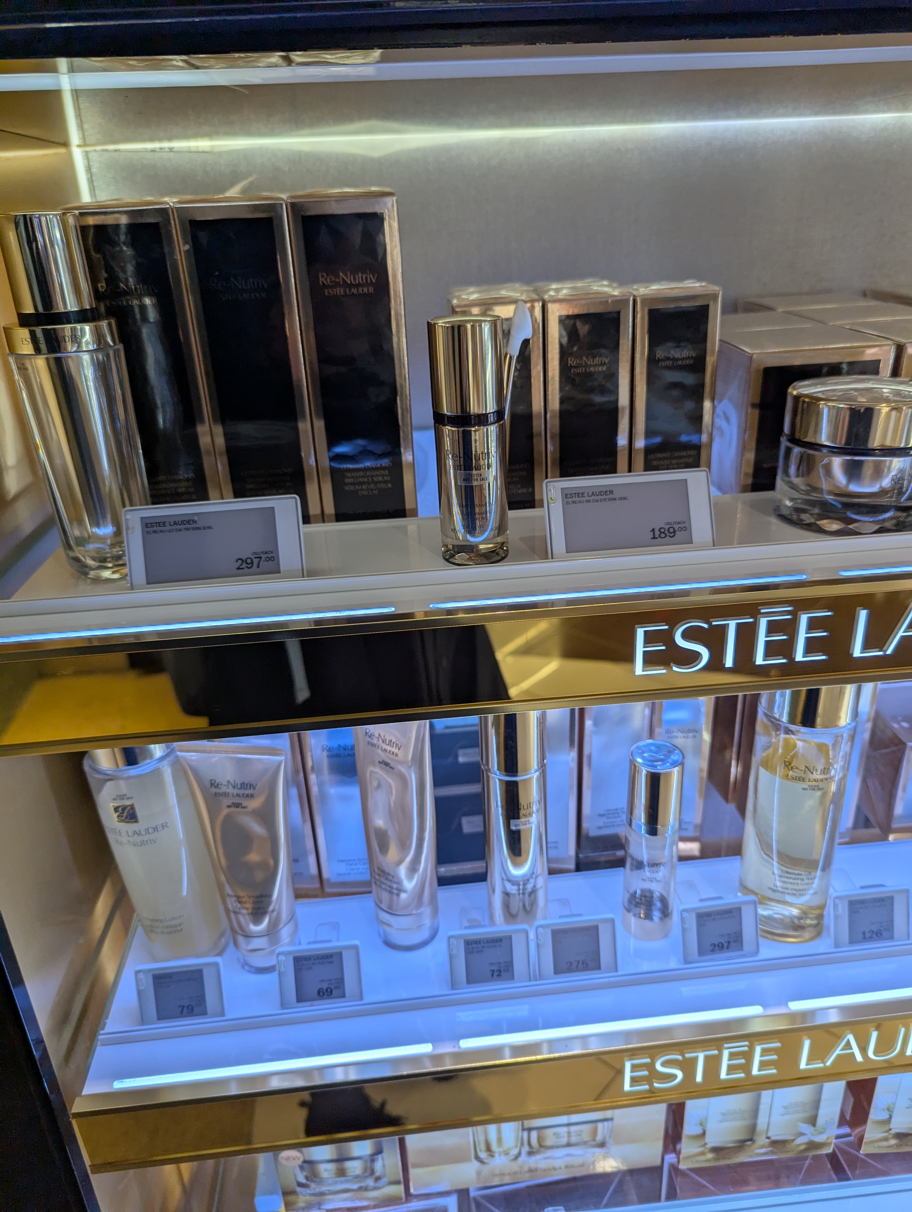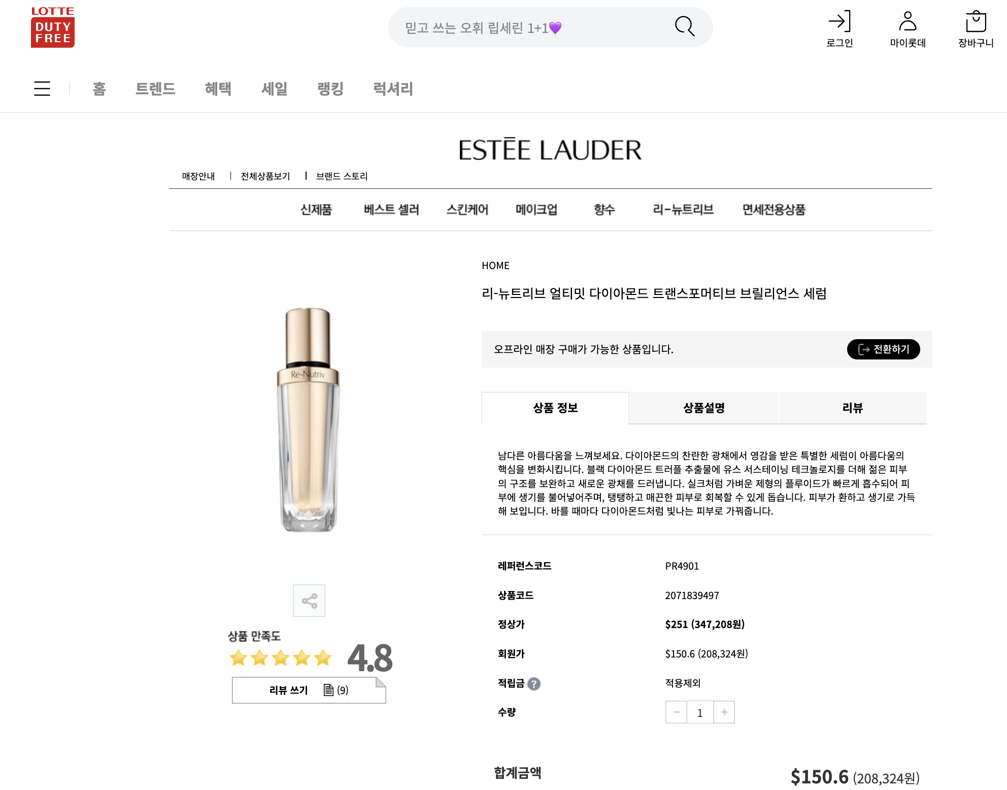 다음은 에스티로더 보여드릴게요. 고급라인 Re-Nutriv Ultimate Diamond 리-뉴트리브 얼티미트 다이아몬드 트랜스포머티브 아이 세럼이 뉴욕 면세점에서는 189달러이고요, 같은 제품이 신라면세점에서는 인터넷회원가 115달러에요.