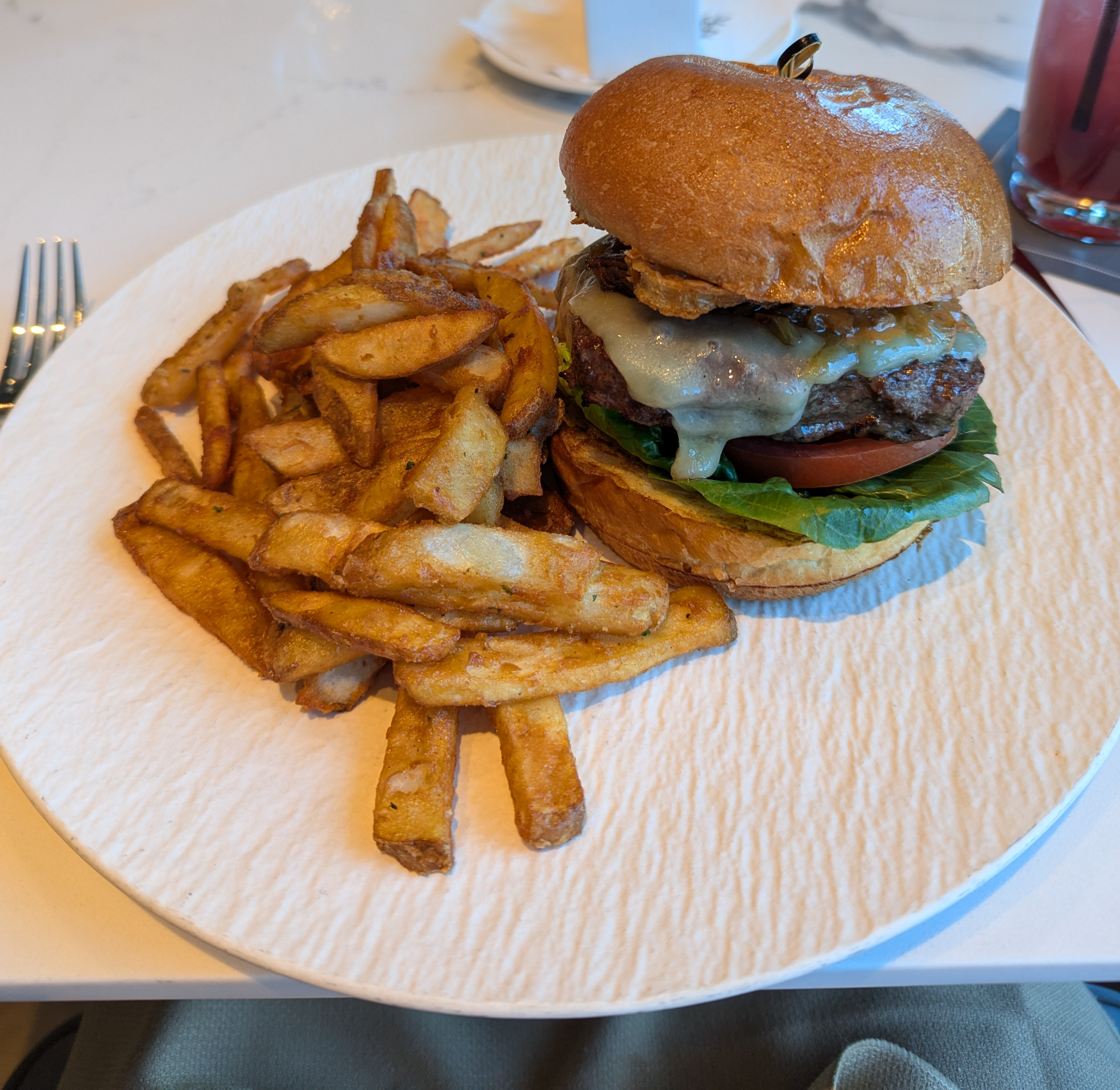 햄버거는 28달러 (+세금, 팁)였고 맛있었습니다. 감튀도 좋았고요, 다만 양이 정말 많아서 다 먹지는 못했어요. 미디움 레어로 부탁드렸는대 만족스러웠어요.