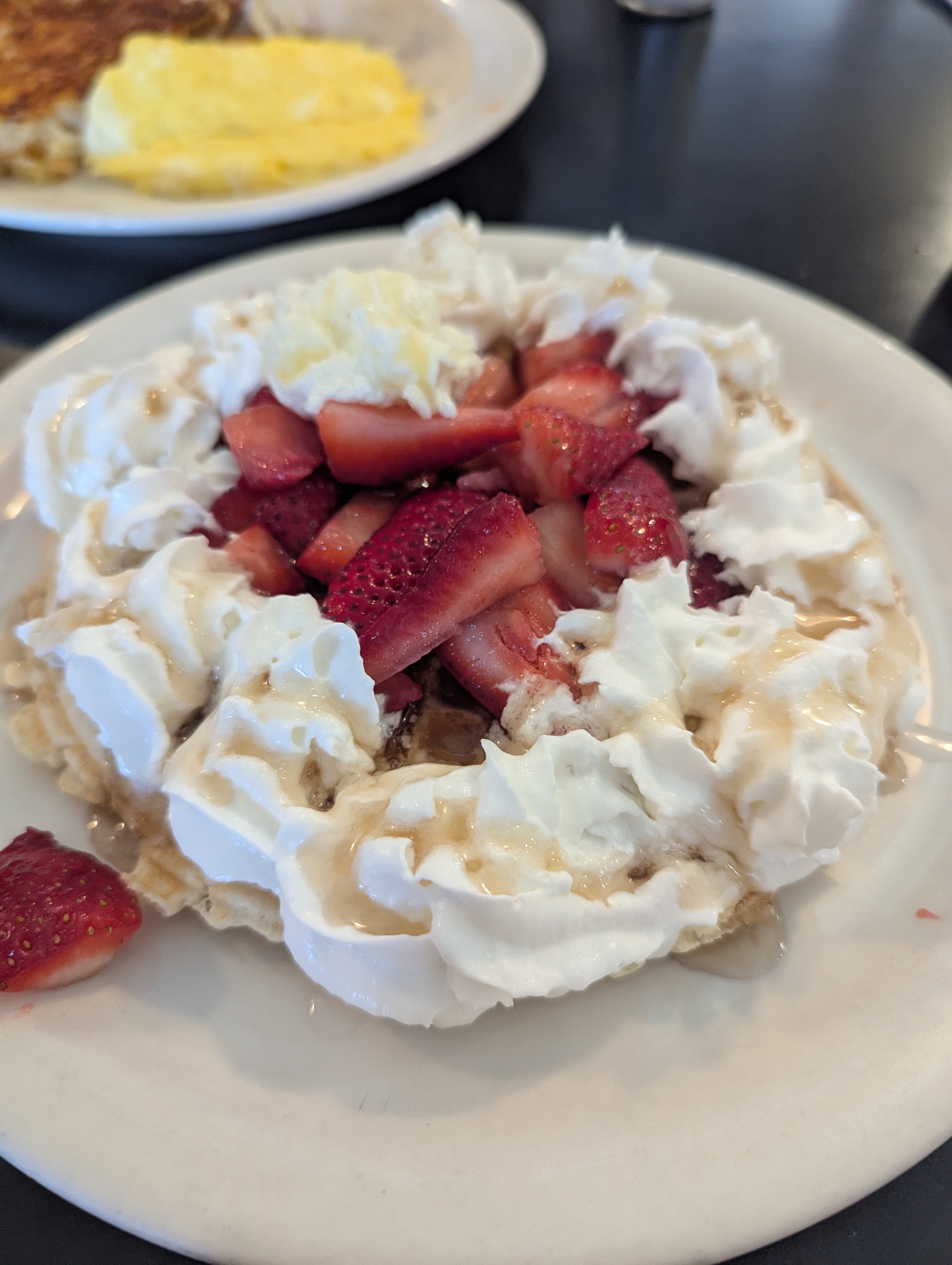 타호 호 지역에 세 가게나 있는 레드헛 카페입니다. 아침식사 위주로 운영되고 있어서 오후 두시에 닫아요. 전형적인 미국의 아침 및 브런치 메뉴를 다양하게 맛보실 수 있어요. 비스킷 앤 그레이비, 해시브라운 및 에그 스크램블 (계란은 마음대로 주문가능)이 나오는 The Usual 이라는 메뉴는 단돈 10달러였고요, 제가 주문한 딸기 와플은 12달러였답니다.