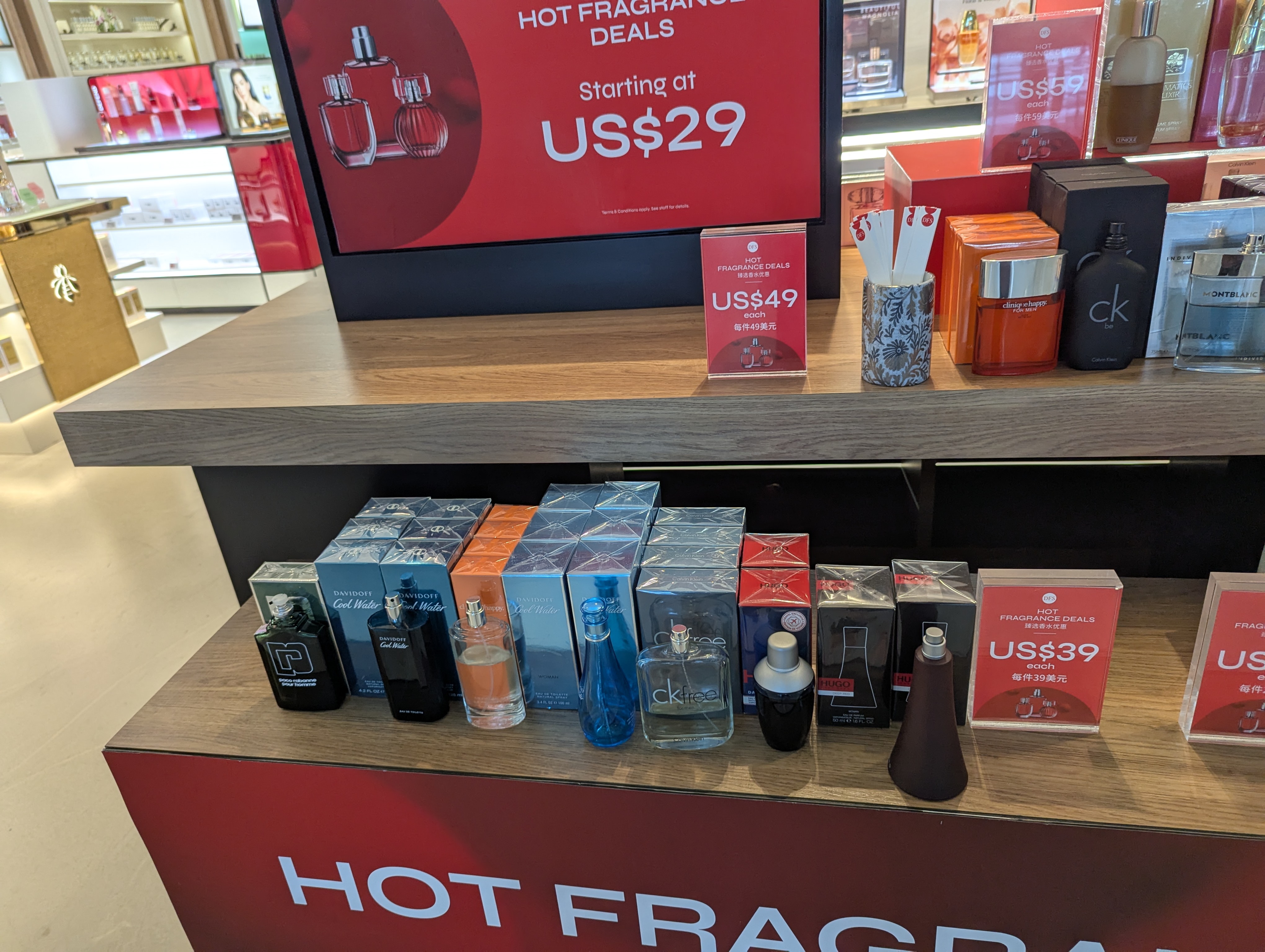 향수 폭탄세일 느낌의 매대입니다. 대놓고 가격표를 전면에 내세워서 29달러부터 시작하는 합리적인 가격을 강조하고 있는데요, 유행이 조금 지난 향수들이지만 잘 보시면 취향에 맞는 제품을 건지실 수도 있어요. 샌프란시스코 공항에서는 잘 안보였는데 돌아오는 길에 보니 샌프란 공항에도 구석이긴 하지만 동일한 Hot fragrance deals 매대가 있더라고요.