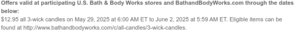 그리고 오늘 (5월 31일 토요일) 하루만 진행되고 있는 룸스프레이 프로모션도 있어요. 이건 딱 하루만 진행되는 프로모션인데, 이런 정보는 메일 등록을 해두면 아침 4시 (동부시간으로 7시)정도에 메일이 옵니다. 미국에서 배쓰앤바디웍스를 많이 구매해가고 싶으시다면 메일링 리스트에 가입하셔서 여행기간 매일매일 세일정보를 실시간으로 받아보시는 게 가장 편하실거에요. 제가 아는 모든 BBW 프로모션 총정리를 해드리고 싶었는데 3+3만 소개해도 이렇게 길어졌네요. 다음번에는 제가 정말 좋아하는 품목별 5.95달러 프로모션 소개를 해드릴게요. 도움이 되셨으면 좋겠고요, 즐거운 쇼핑 되세요.