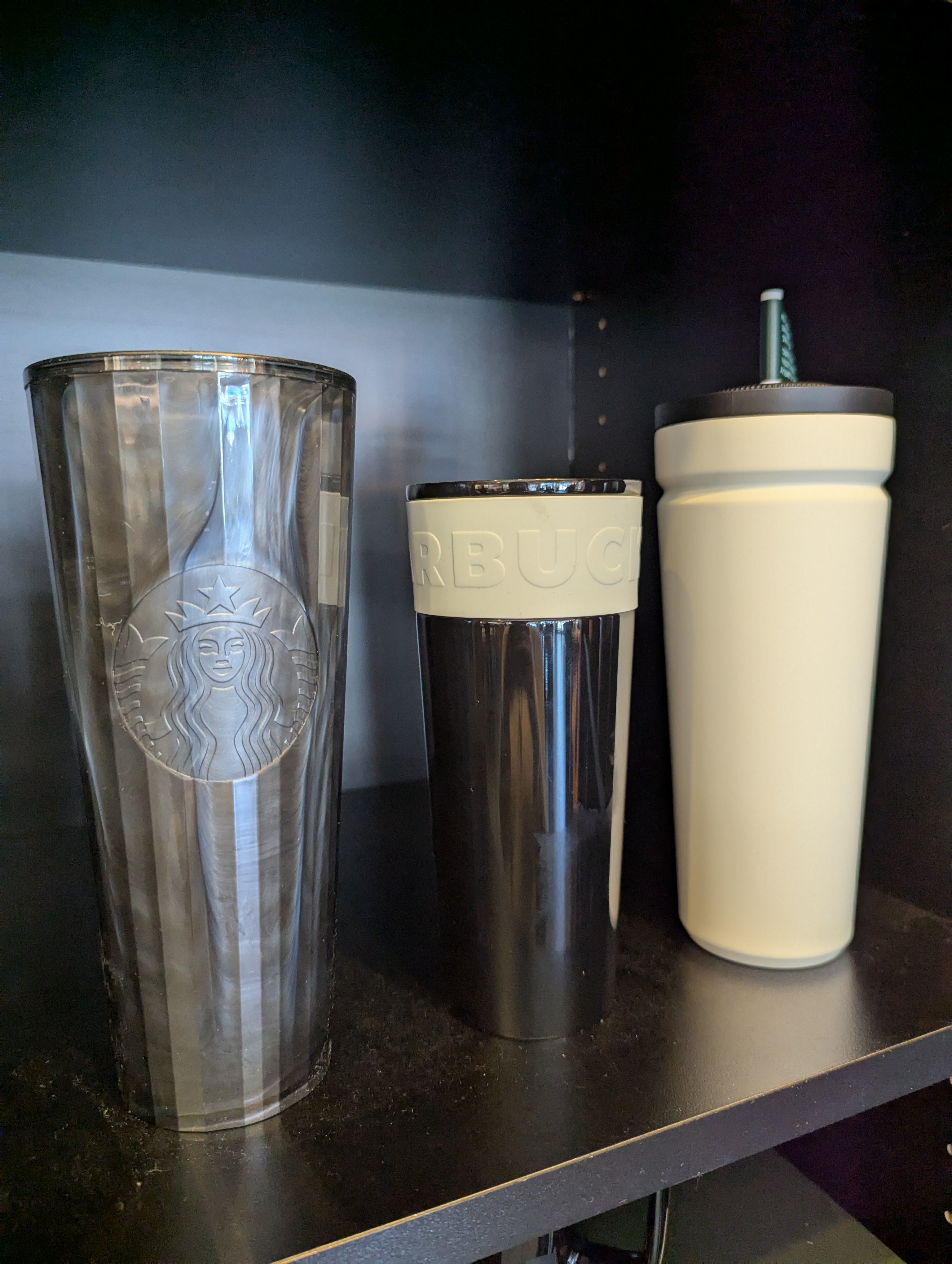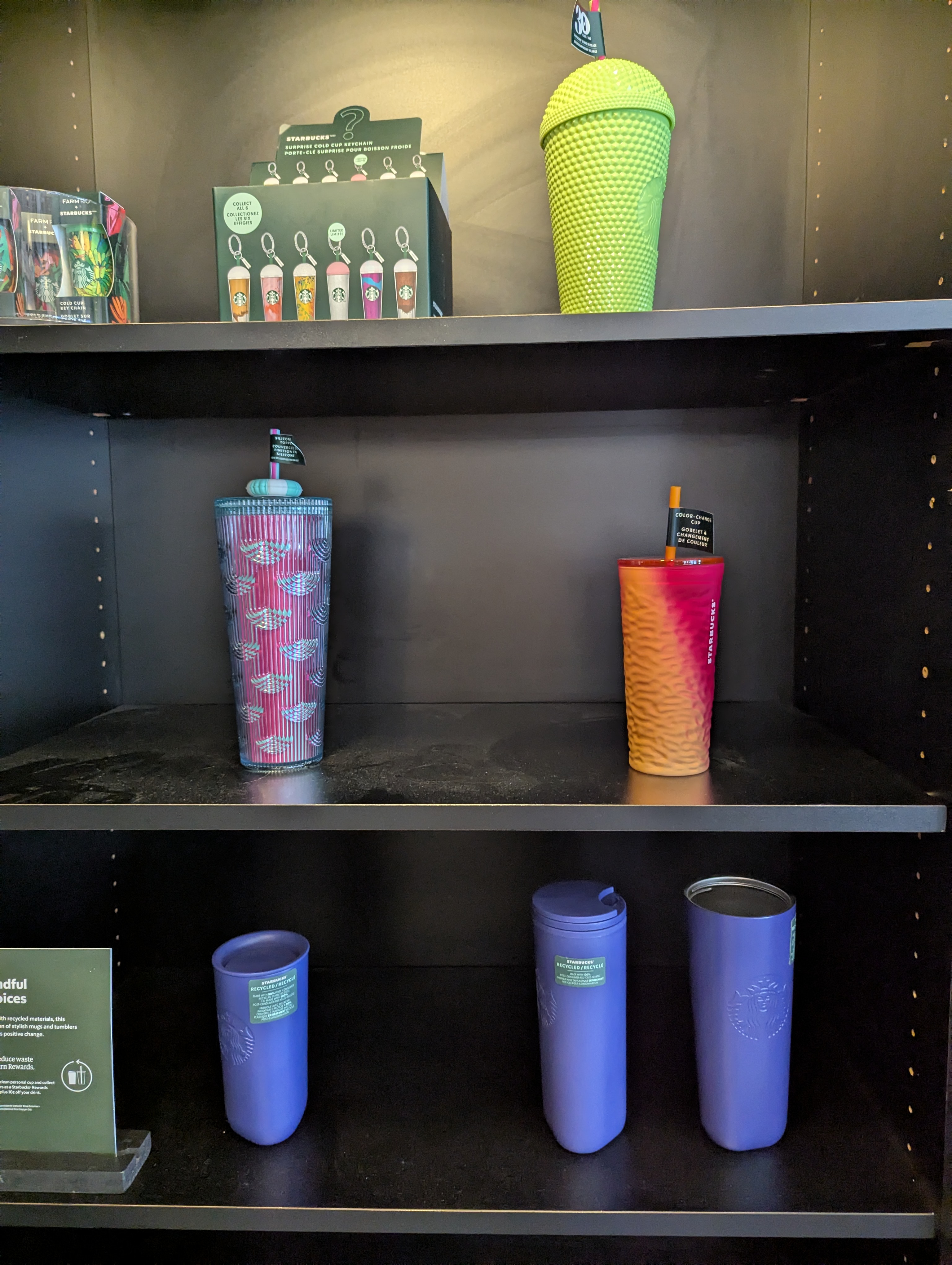 가격은 25달러(+세금)부터 시작이고요, 한화로 하면 3만4천원이 훌쩍 넘네요. 가끔 연말에 텀블러 세일을 하는 지점도 있긴 하던데 이번엔 세일하는 제품은 없었어요. 결코 저렴한 가격은 아니지만 요즘 스탠리 오왈라 등 브랜드 텀블러들이 고급, 고가로 출시되고 있어서 상대적으로 스타벅스는 일반적으로 보이기도 해요. 오왈라 텀블러는 30달러, 스탠리는 35달러 정도 하니까요.