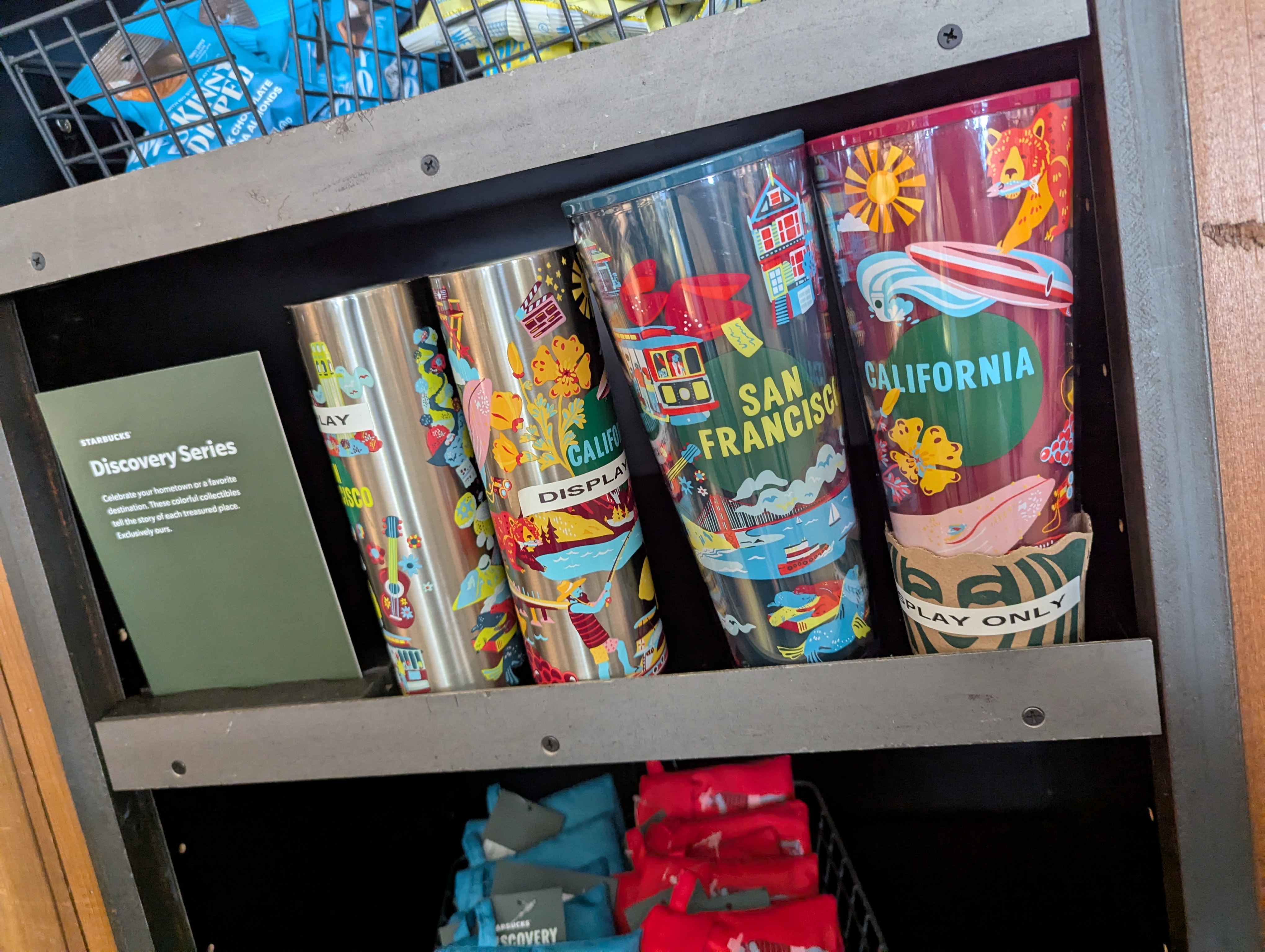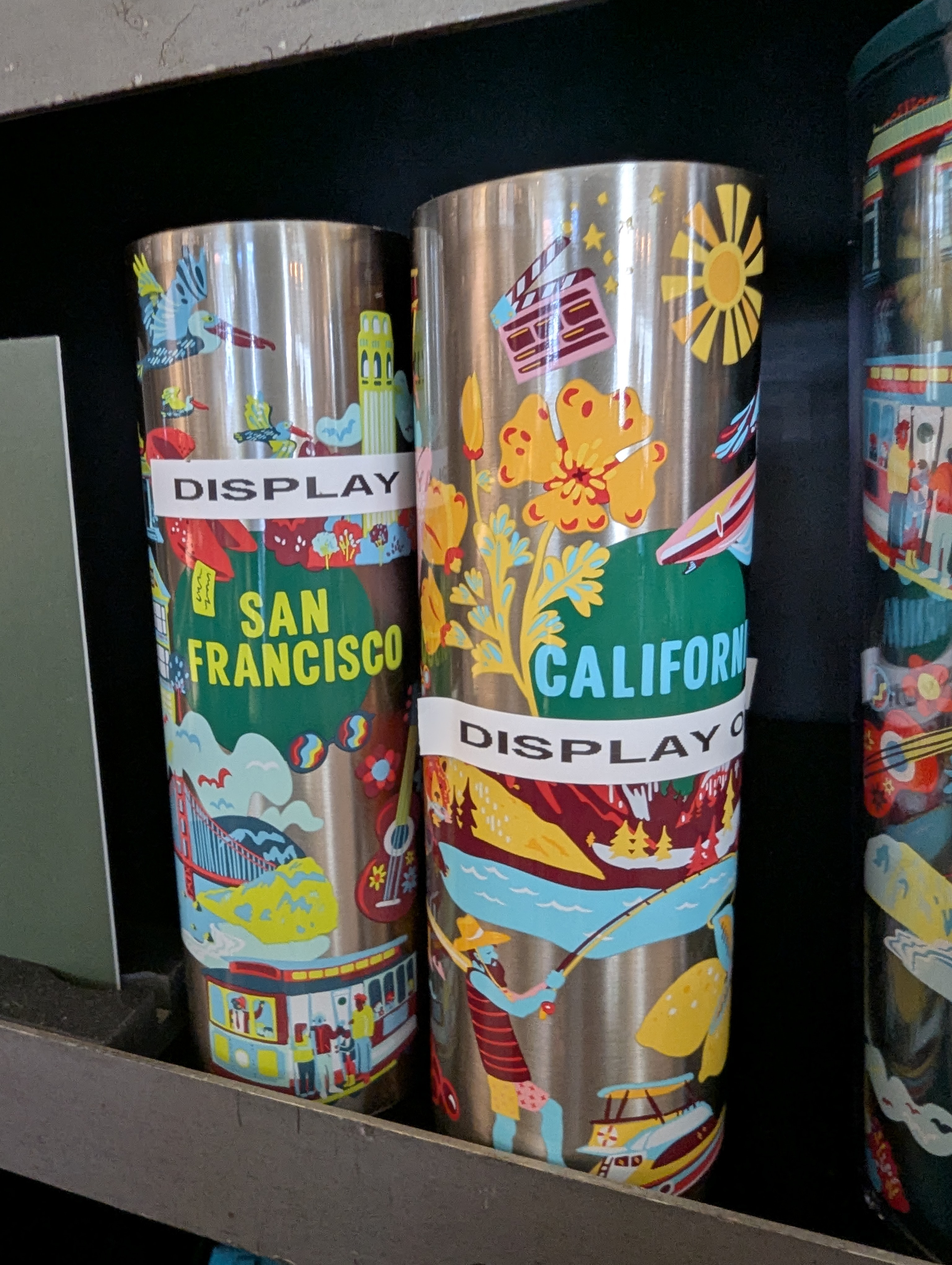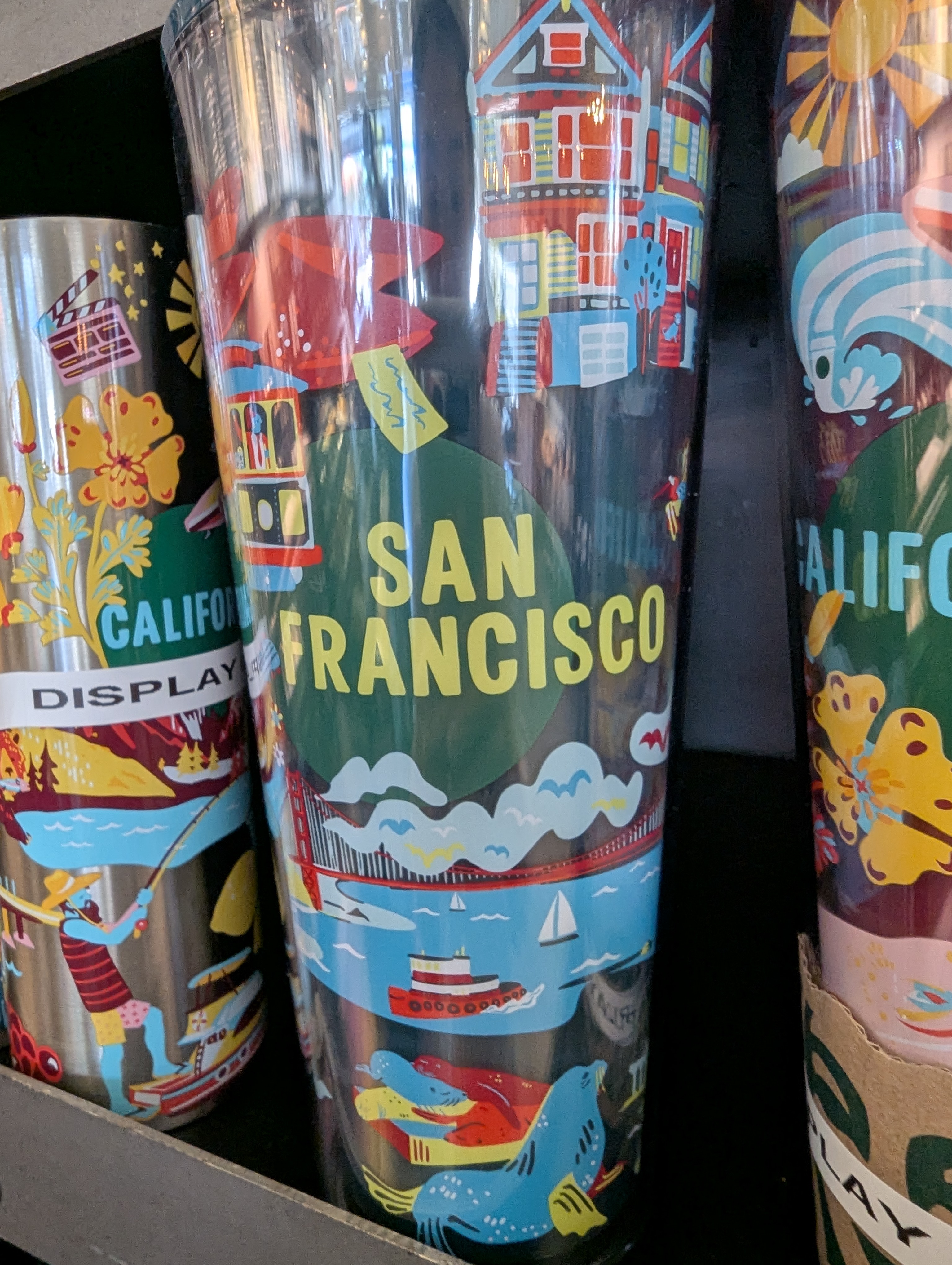그리고 오늘의 하이라이트, 샌프란시스코 및 캘리포니아 한정 디자인 텀블러들이에요. 각각 틴 재질에 프린트된 제품도 있고 투명한 플라스틱으로 둘러진 디자인도 있어요.