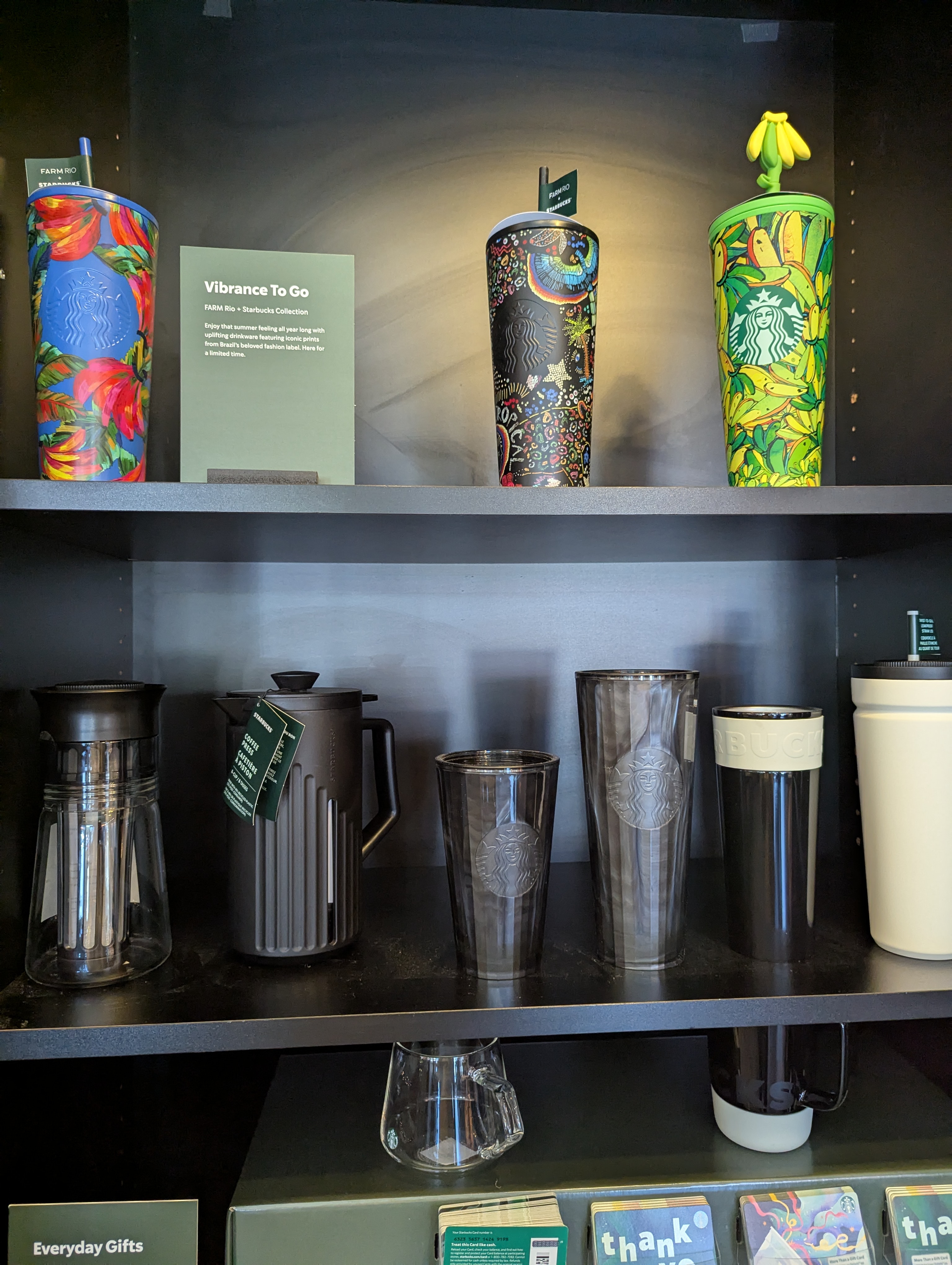 안녕하세요 오들입니다. 스타벅스에 오랜만에 갔다가 업데이트된 텀블러 및 머그 구경하고 왔어요. 봄/여름기간인데도 블랙컬러 제품이 많아서 신기하네요. 작년에는 큐빅이 무더기로 박힌 디자인이 유행하더니 올해는 극적으로 어른스럽고 조용한 분위기로 바뀌었나 봅니다. 유행이 돌고 돌아야 장사가 되는거겠죠. 화려한 형광색 및 신나는 패턴이 돋보이는 Farm RIO라는 브라질 브랜드와의 협업상품도 보여요.