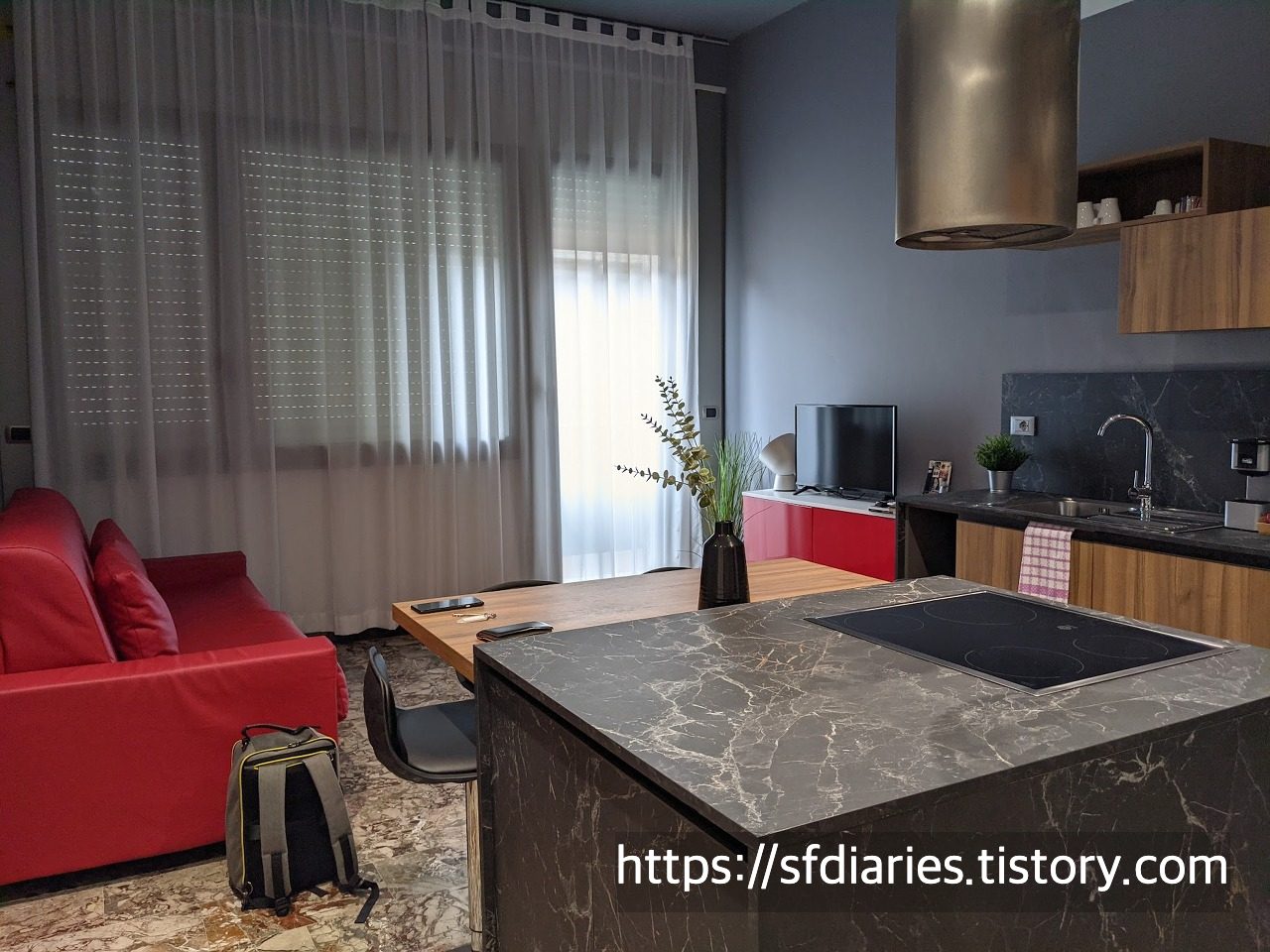 - 룸 컨디션: 사진 그대로여서 좀 놀랬던 곳이에요. 가구도 주방 시설 및 화장실도 다 최근에 인테리어 공사 하신 것 같더라고요. 저희가 묵은 방은 엔조(ENZO) 방입니다. 엔조 페라리에게 영감을 받아 디자인했다고 해요. 저는 이 아일랜드에 반해 덜컥 이 방을 골랐지만 이 외에 다른 디자인도 몇 있답니다.