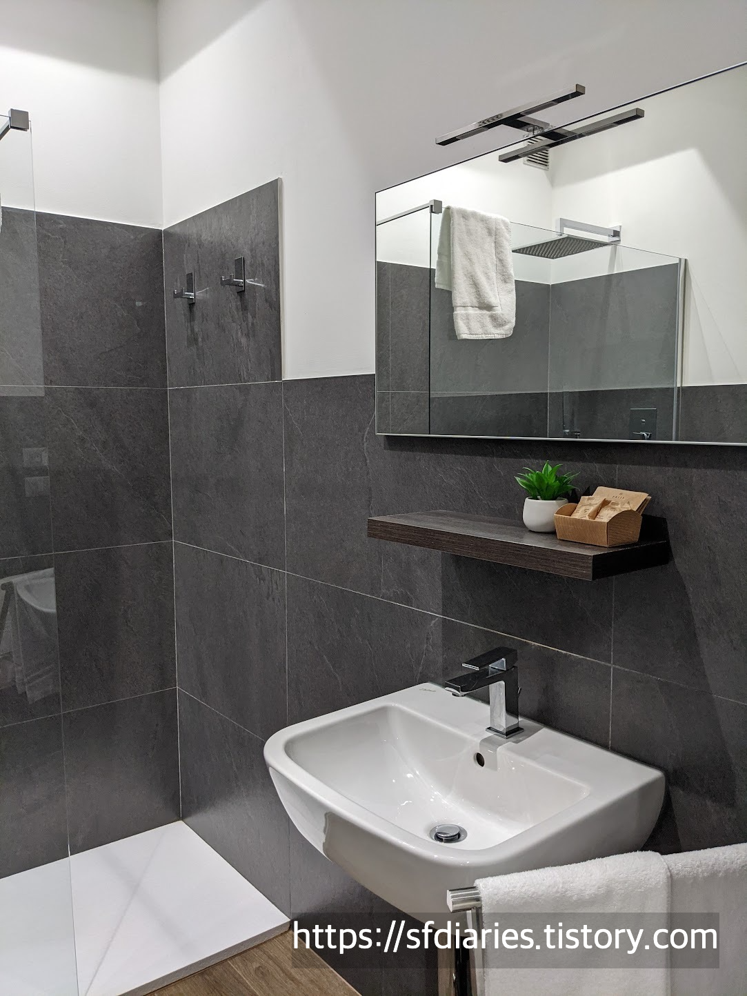 - 화장실: 여기 화장실이 정말 좋았어요. 방 크기에 비해 매우 넓고 샤워도 큼직했고 수압도 좋습니다. 어메니티는 무려 에트로 제품입니다. 소형 어메니티가 아니라 대형 리필용기가 벽에 걸려있는 형태에요. 심지어 세면대도 감각적인 나무상판으로 꾸몄습니다. 남편이 집 화장실도 이렇게 인테리어 하고 싶다고 말할 정도였네요. 저희가 가본 이 가격대의 유럽 호텔 중 화장실 중 최고 수준 같아요.
