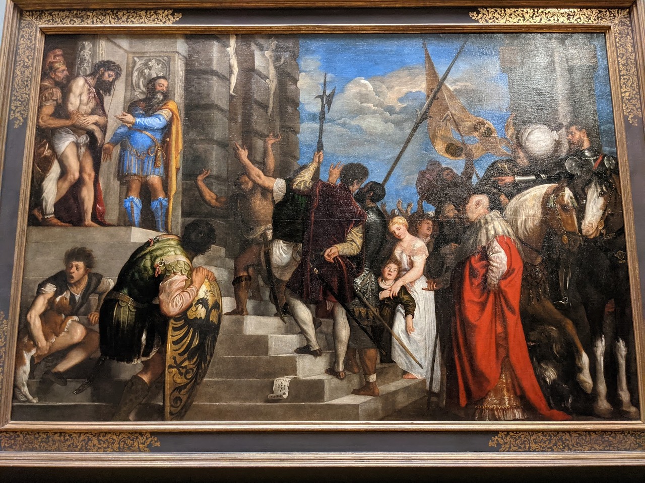 '에체 호모(보라, 이 사람이로다)' 라는 그림입니다. 이탈리아 화가 티치아노 베첼리오 작품이래요. 예수님이 잡혀가시는 모습을 생생히 묘사하고 있어요. 개를 보는 행인, 아이를 보호하는 엄마, 손가락질 하는 사람들의 모습이 그 당시의 모습을 생생하게 그리고 있네요.