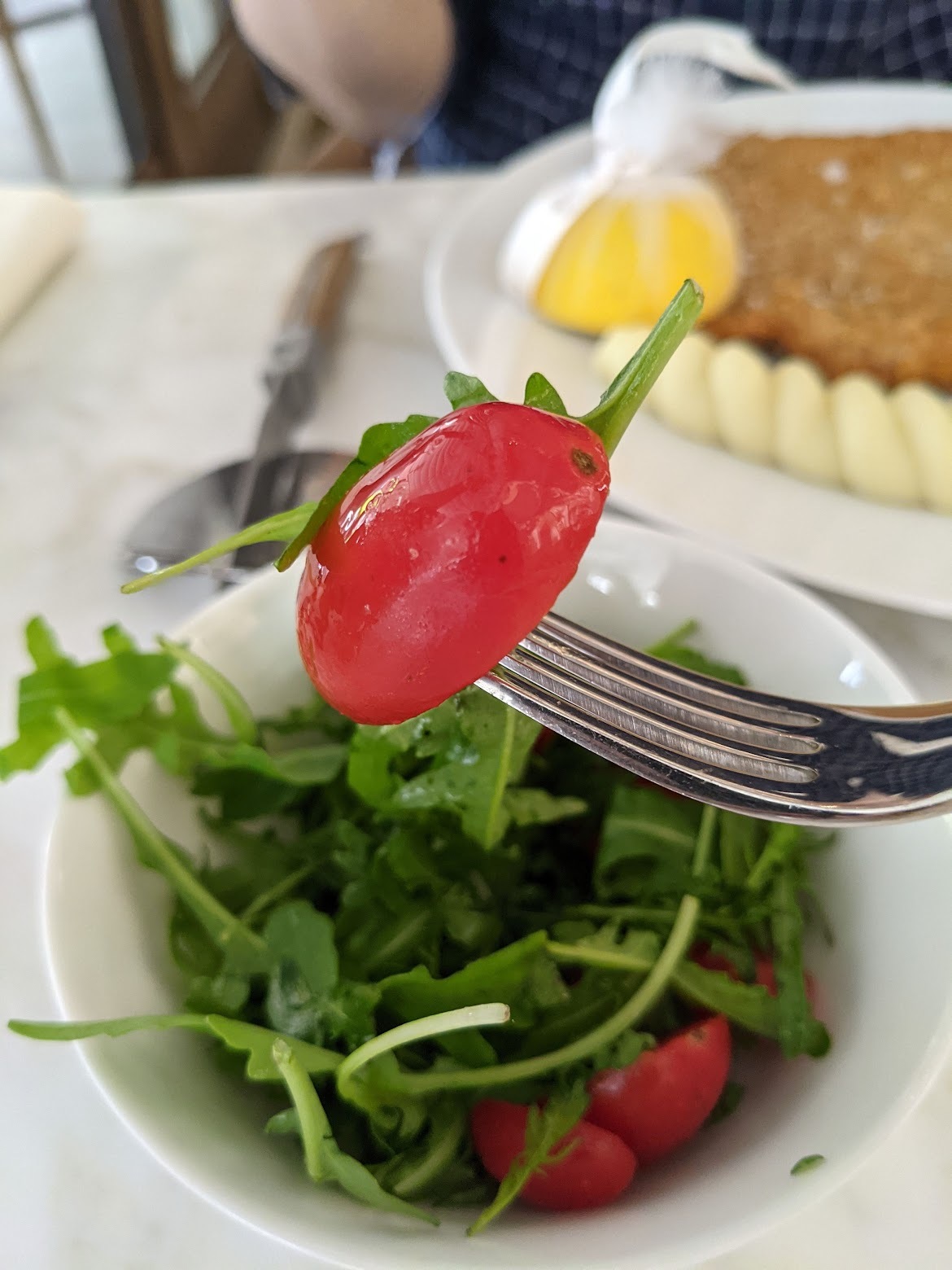 식사에 포함된 식전 샐러드의 토마토가 너무 맛있어서 찍어 놓은 사진입니다. 달콤하고 농축된 토마토의 맛이에요. 이거 어디서 파는지 궁금하다고 남편이 자꾸 물어보고 싶어했습니다.