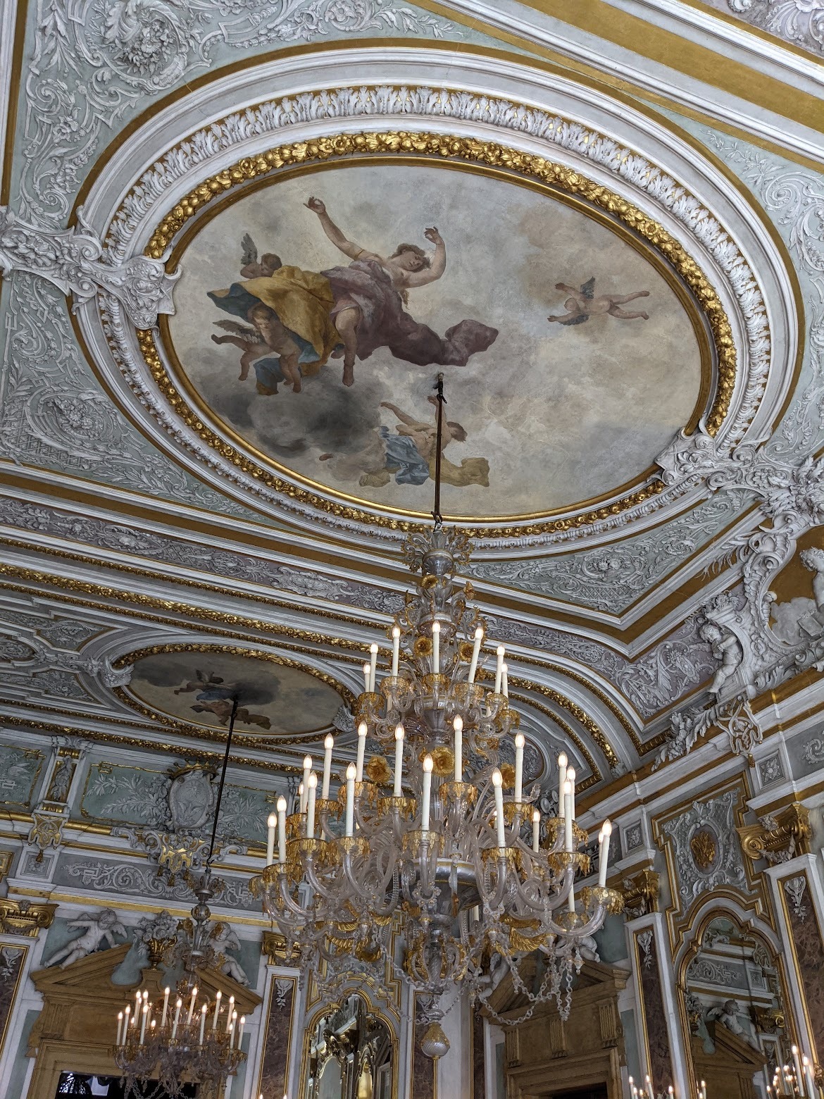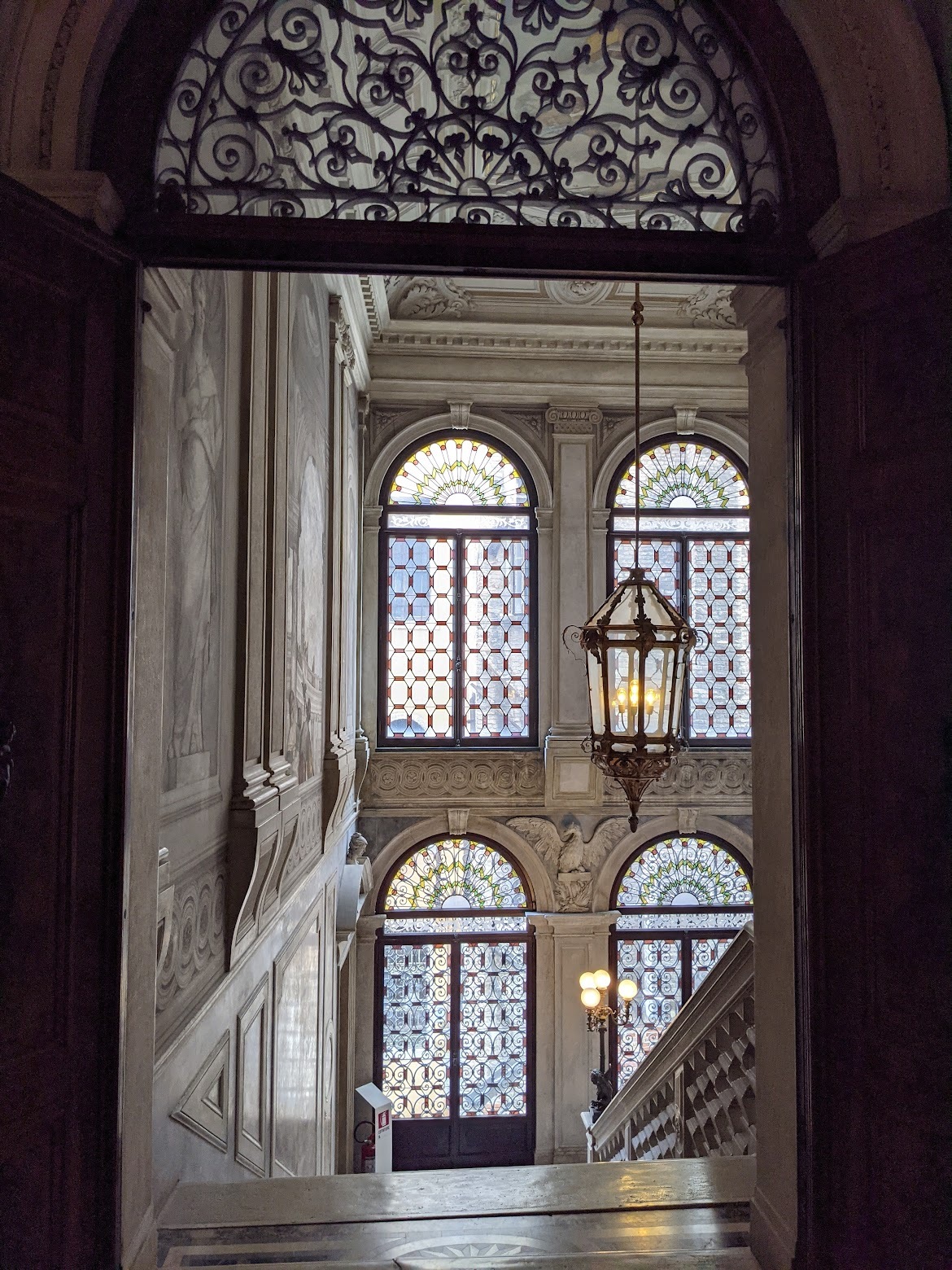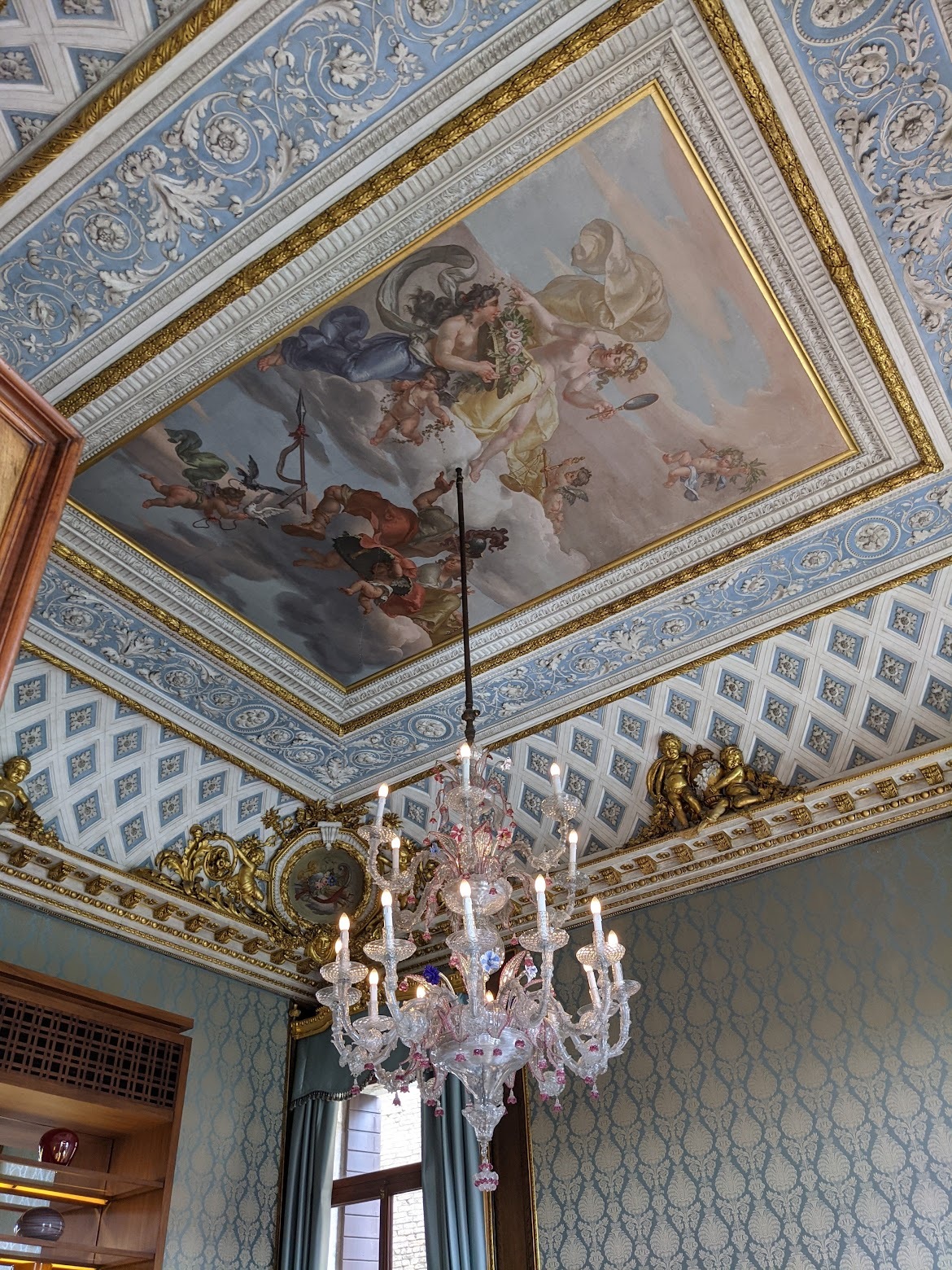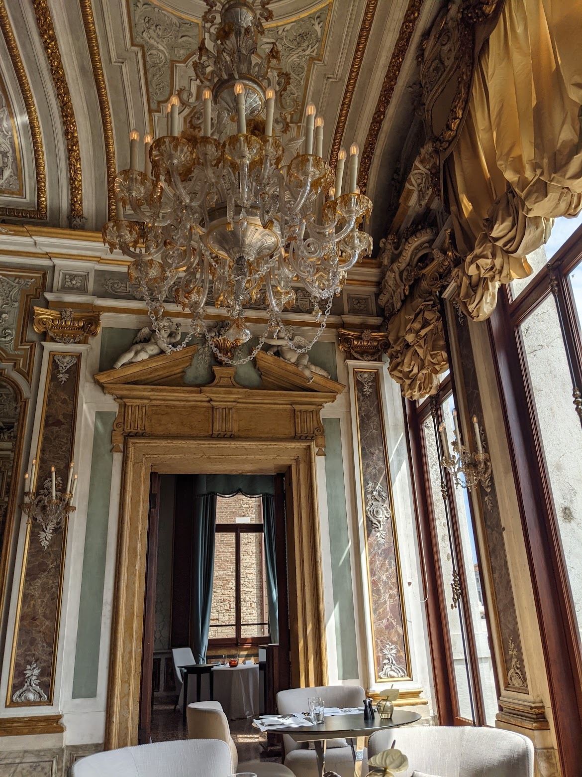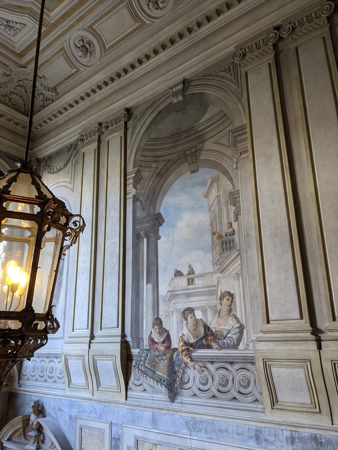 베니스의 유명한 유리공예를 자랑하는 듯한 유리 샹들리에와 오브제도 공간을 빛내주었어요. 천장 벽화도 벽화를 둘러싼 화려한 문양도 어느 부분 하나 허투루 지은 곳이 아니네요.