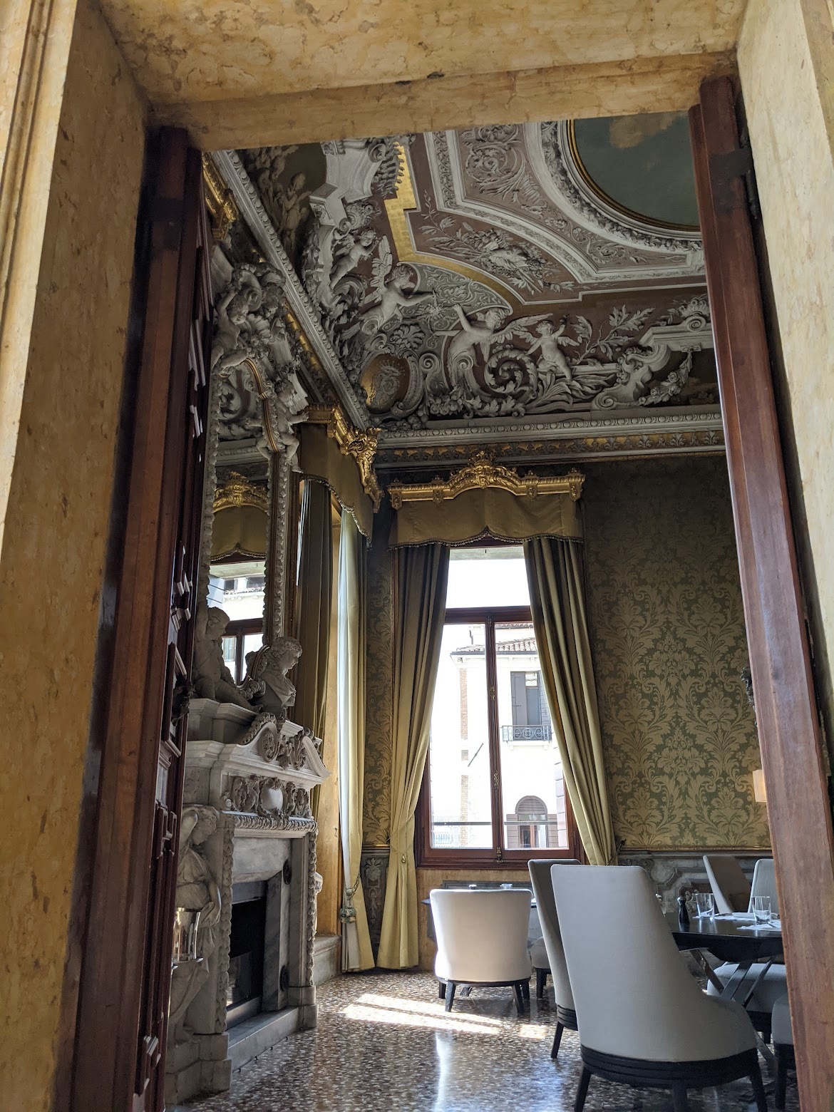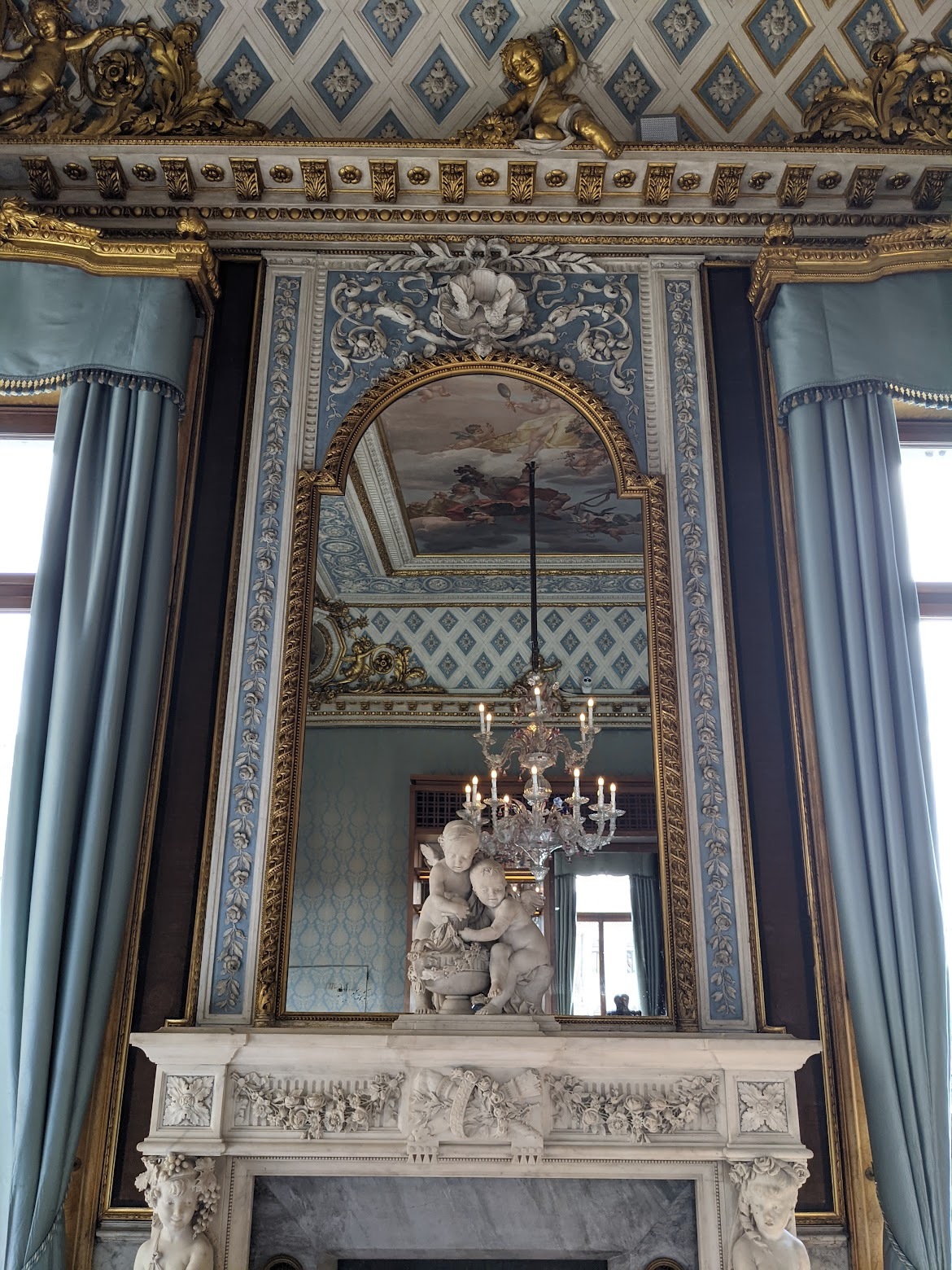 대리석 난로도 있고 거울도 많아서 원하시는 인생사진 다 찍을 수 있습니다. 이 벽은 웨지우드 느낌도 나는군요. 여기는 베니스에 가져오신 옷 중에 가장 마음에 드는 옷을 입고 오세요.