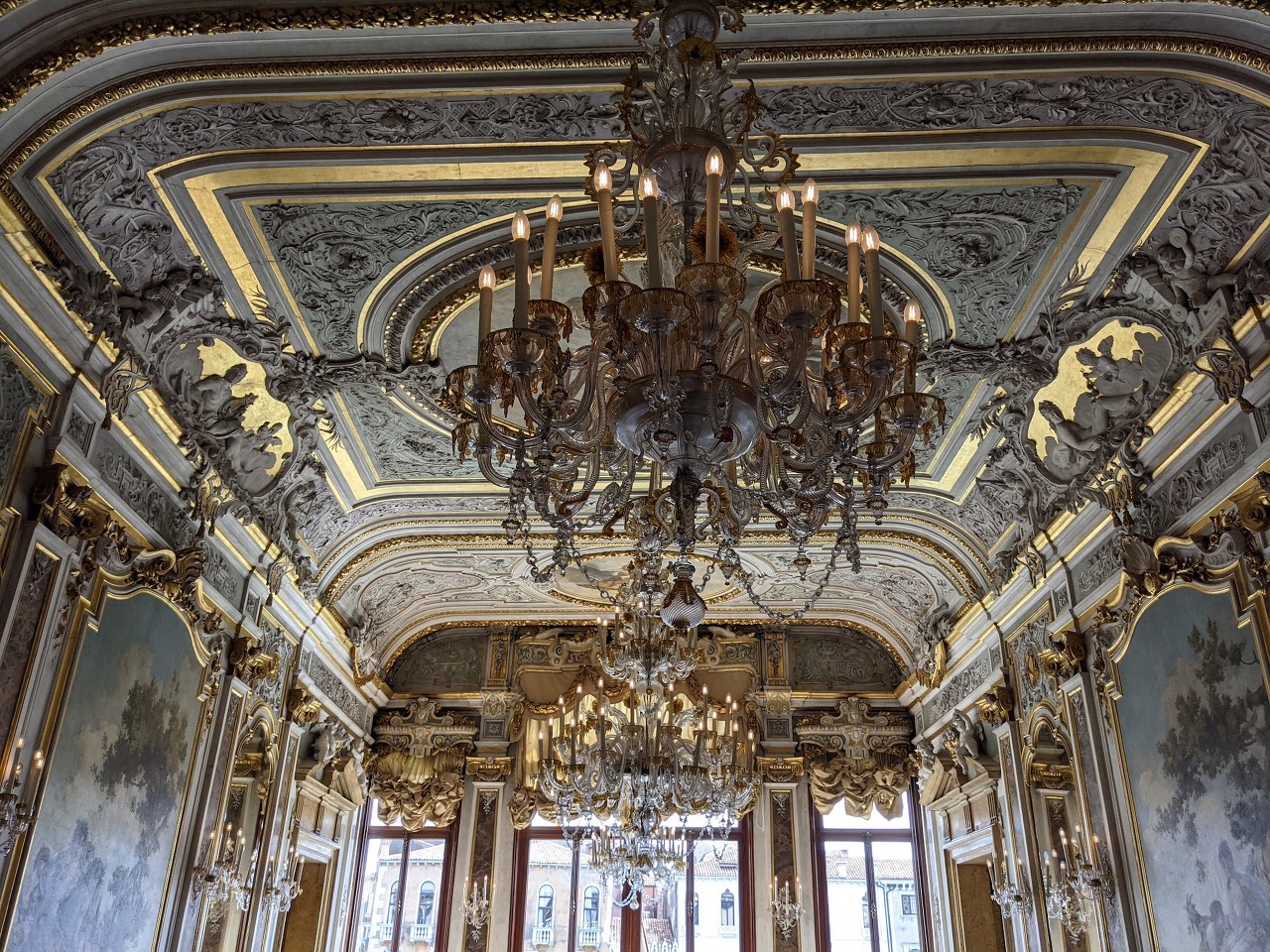 베니스의 유명한 유리공예를 자랑하는 듯한 유리 샹들리에와 오브제도 공간을 빛내주었어요. 천장 벽화도 벽화를 둘러싼 화려한 문양도 어느 부분 하나 허투루 지은 곳이 아니네요.
