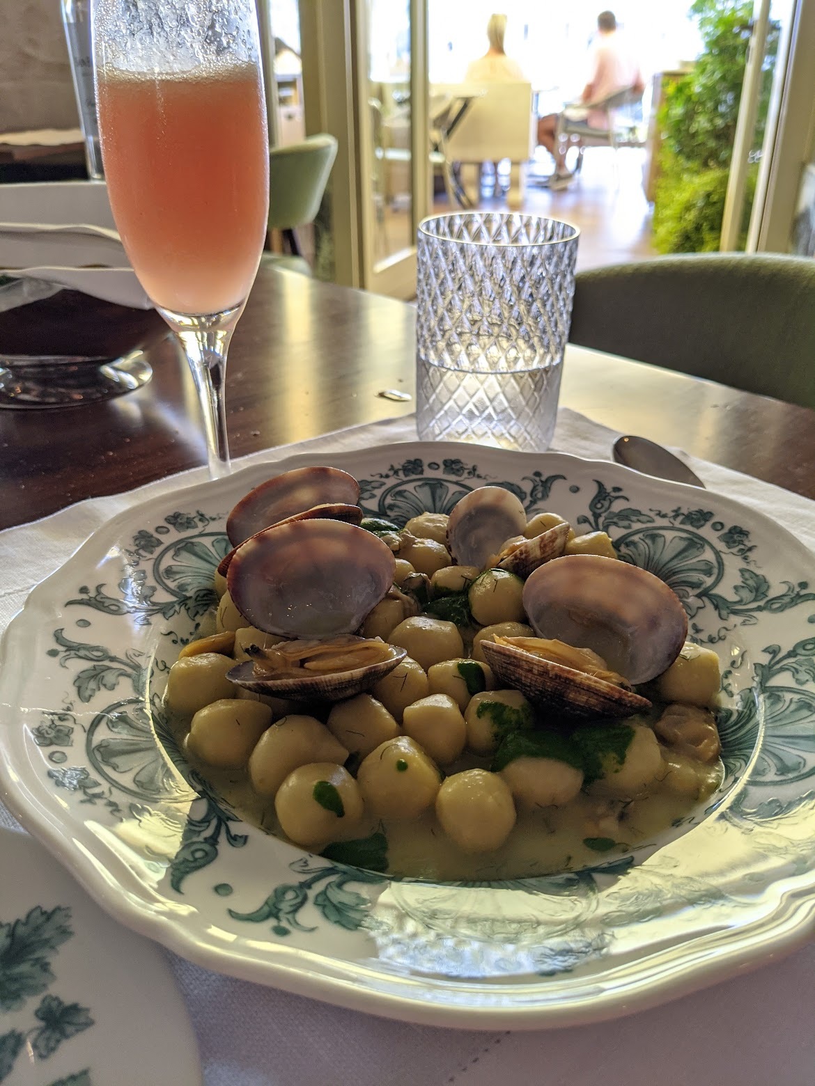 식사는 단새우 리조토와 조개를 곁들인 감자 뇨끼 같은 파스타를 주문했고요, 다 맛있게 잘 먹고 왔습니다. 참고로 여기는 런치 커버차지가 있어요. 지금은 6유로입니다.
