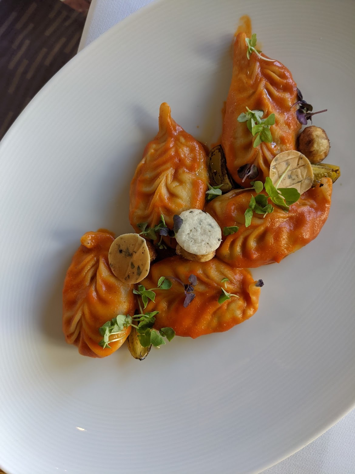 이 만두처럼 생긴 아이도 스타터 메뉴인데요, 이탈리아도 그렇고 동유럽도 만두 요리가 발달한 것 같더라고요. 만두 요리가 생소한 문화에서 온 사람들에게는 굉장히 신선하겠지만 한국 분들은 굳이 주문하지 않으셔도 되는, 평범한 맛입니다. 만두피가 좀 두껍고 소스는 토마토 스파게티 느낌이에요. 맛이 없는 건 아닙니다만 굳이 프라하까지 가셔서 드실 필요는 없어요. 물론 제가 본 만두요리 중 플레이팅이 가장 잘 된 요리 중 하나이긴 합니다.