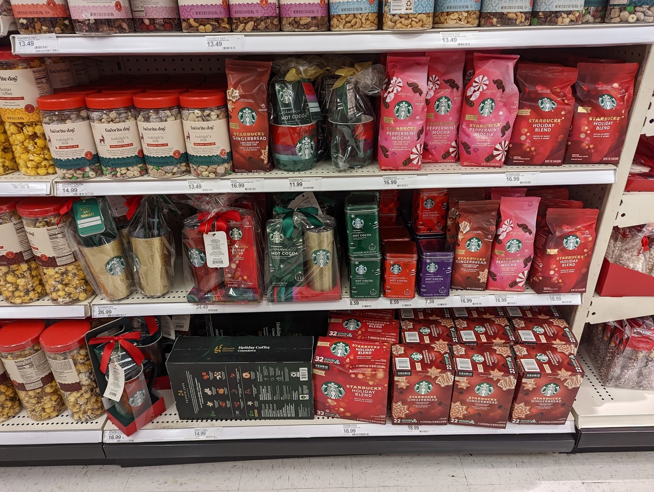 스타벅스 제품도 타겟에서 사실 수 있어요. 스타벅스 매장에서 파는 제품과 구성이 조금 다릅니다. 텀블러 세트는 25-7달러 정도 하네요. 크리스마스 기간 한정 코코아도 있어요.