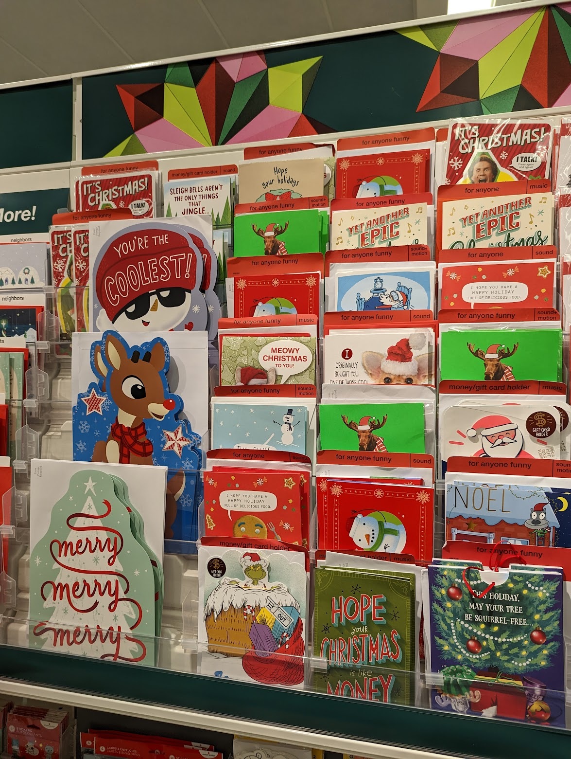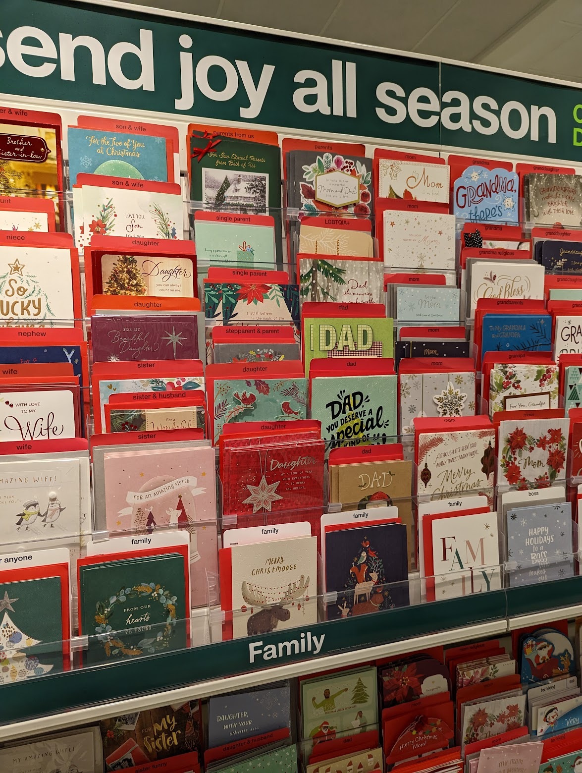 하지만 이렇게 특정 상대를 위한 카드를 파는 것을 보면 마음이 좀 흔들리기도 하네요. 아빠를 위한 카드, 엄마를 위한 카드, 할머니 할아버지 및 아들 딸, 심지어 며느리와 사위를 위한 크리스마스 카드도 다 따로 나옵니다. 이건 크리스마스 카드만 그런 건 아니고요, 생일 카드나 발렌타인 카드 등에도 해당됩니다. 재미있는 나라에요.