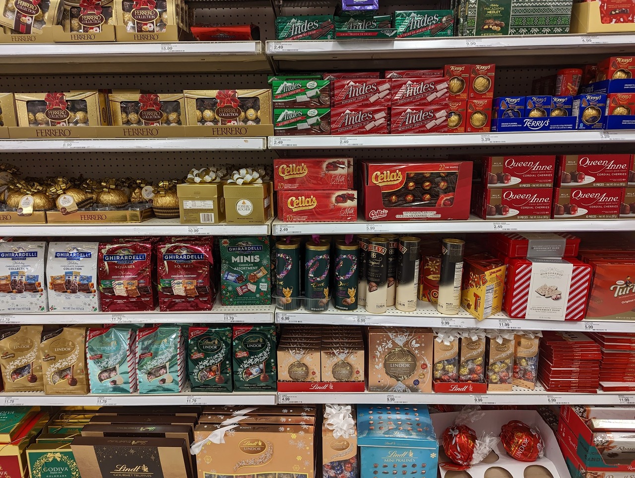 여기도 미국에서 굉장히 대중적인 마트에요, 월마트보다 조금 더 정리가 깔끔하게 되어 있는 타겟(Target)입니다. 앱을 다운받으시면 더 많은 쿠폰을 사용하실 수 있는데, 이메일 주소만 주면 가입이 가능했던 것 같습니다. 미국에서 과자 많이 사가시는 분들은 참고해주세요. 위 사진은 크리스마스 한정 페퍼민트 맛, 슈가쿠키 맛, 진저브레드 쿠키 맛, 스니커두들 쿠키 맛 등 다양한 린트 및 기랄델리 초콜렛들이에요. 이 정도면 나쁘지 않은 가격이지만 코스트코가 조금 더 저렴하긴 합니다 (코스트코 사진 및 가격정보는 두번째 포스팅에서 보여드릴게요).