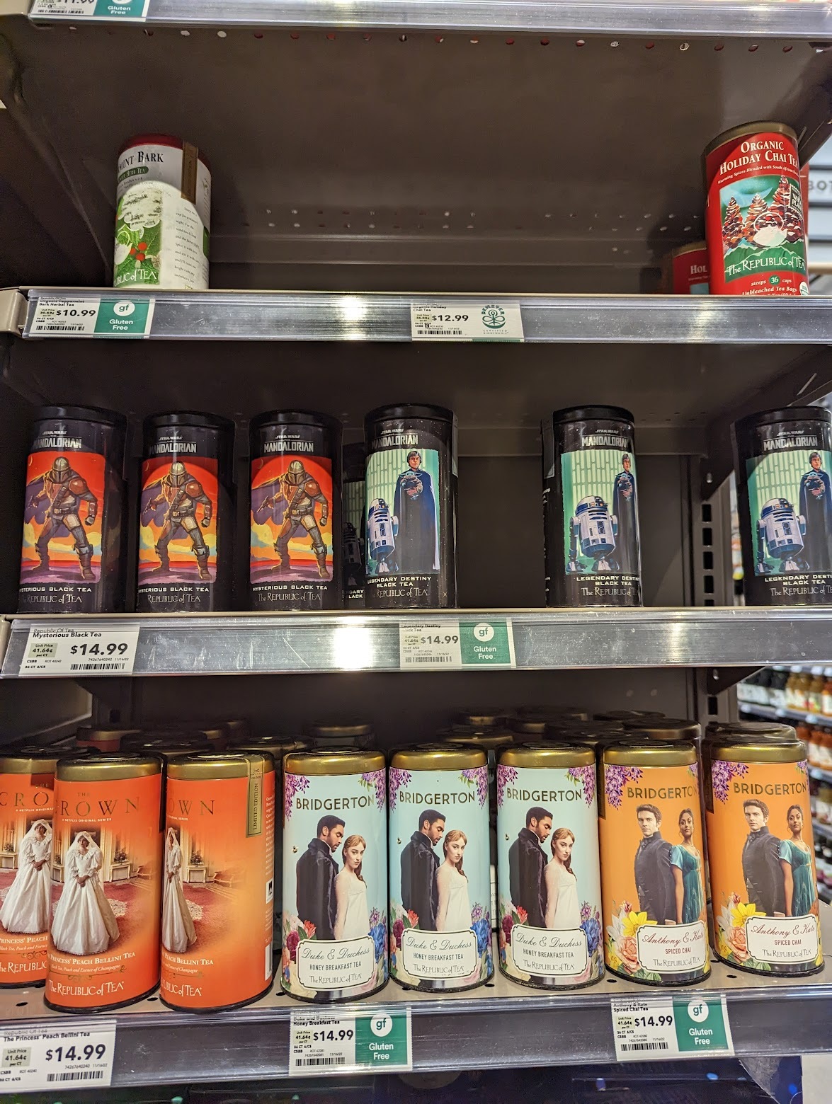 크리스마스 제품은 아니지만 신박해서 찍었어요. 넷플릭스 인기 시리즈 팬들을 위한 차입니다. 크라운은 피치 벨리니 티, 브리저튼 시즌 1은 허니 브렉퍼스트 티, 브리저튼 시즌 2는 인도계 주인공에 맞게 차이티를 담았네요. 만달로리안 블랙티도 있군요. 리퍼블릭 오브 티 라는, 슈퍼에서는 가격이 좀 있지만 괜찮은 티 브랜드입니다.
