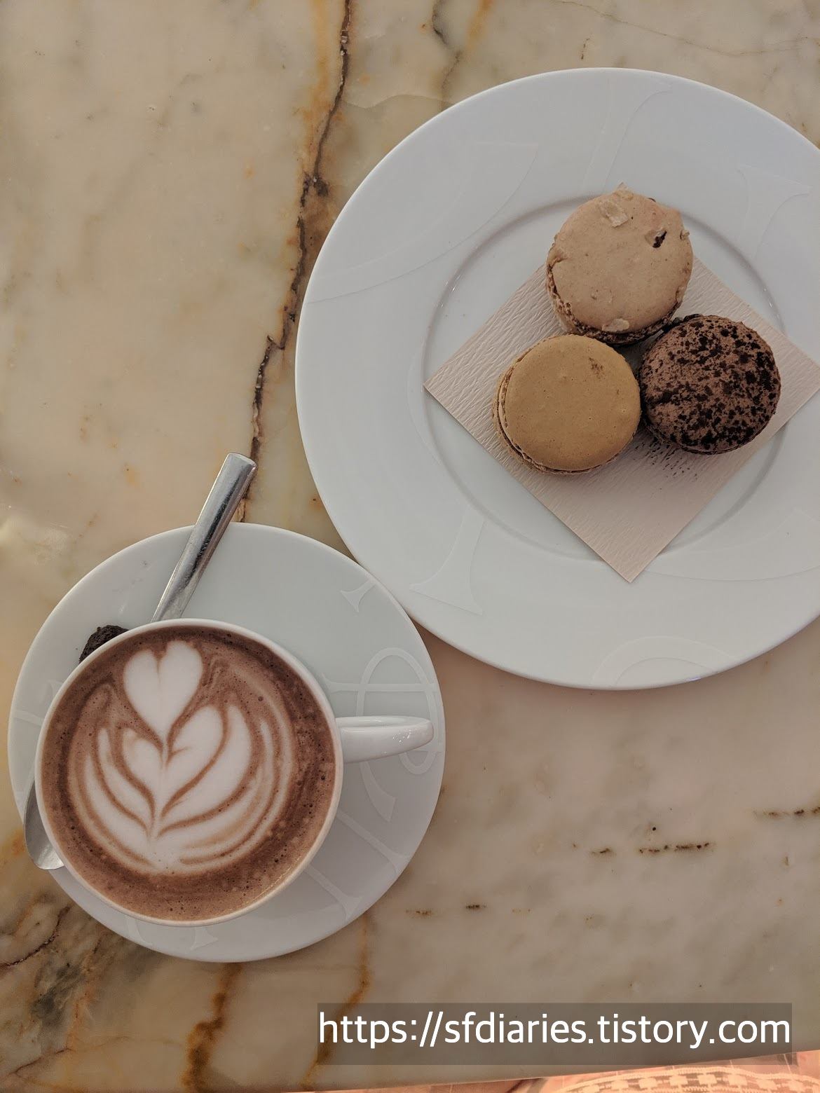 테이크아웃도 가능하지만 앉아서 드셔도 의외로 별로 비싸지 않습니다. 저희는 마카롱 3피스와 카페모카 한잔 시켜서 나눠먹고 왔어요. 두명이 20유로 이하로 맛보고 왔던 것으로 기억해요.