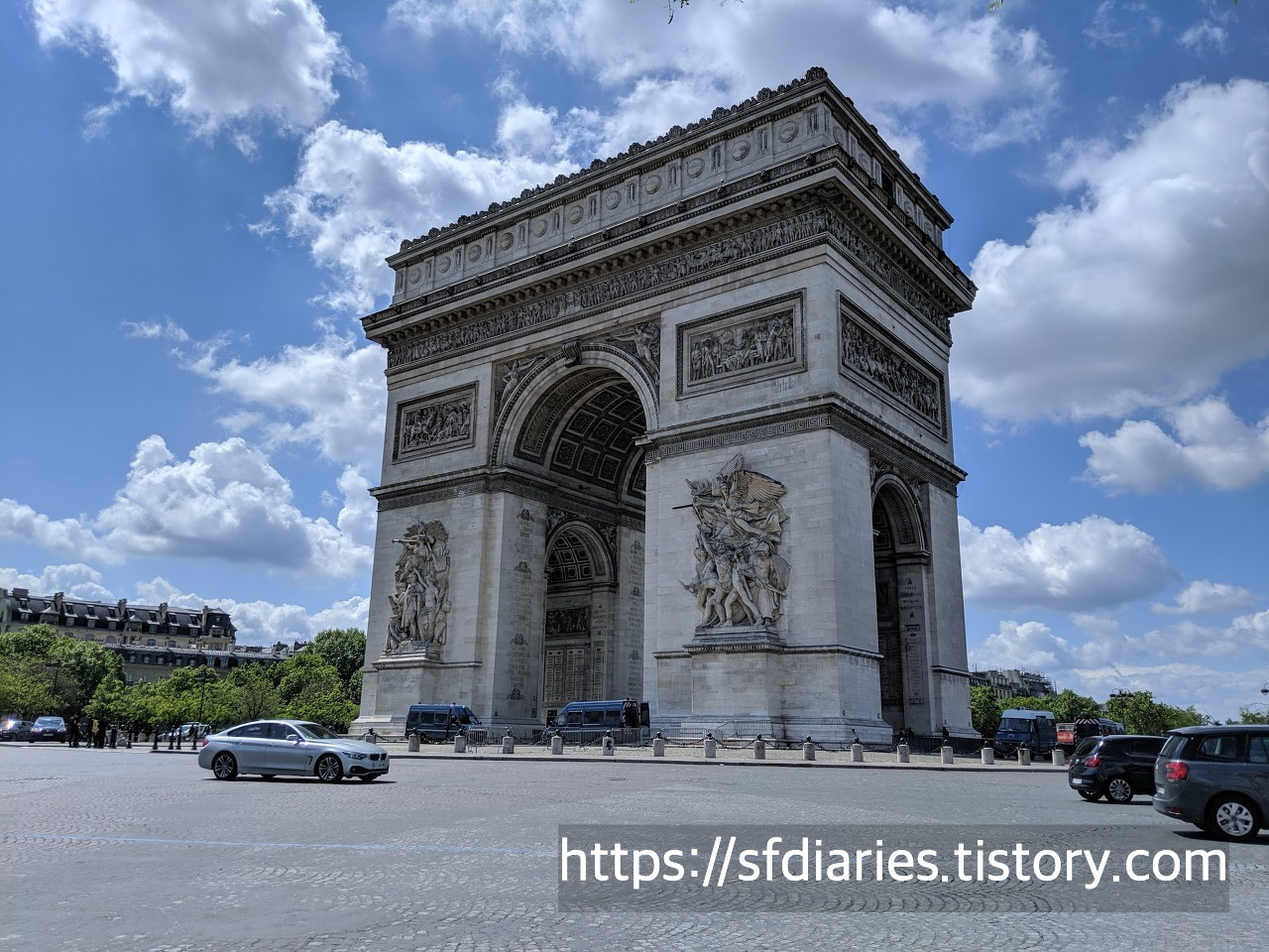 다음은 다들 잘 아시는 개선문(Arc de Triomphe, 지도)으로 향했습니다. 유명세만큼이나 사진이 잘 나오긴 합니다만 주변이 좀 복잡하기도 하고 딱히 할일은 없어서 사진만 찍고 호다닥 나왔어요. 파리의 관광명소에 소매치기가 많다는 이야기를 들어서인지 굳이 오래 머물고 싶지는 않더라고요.