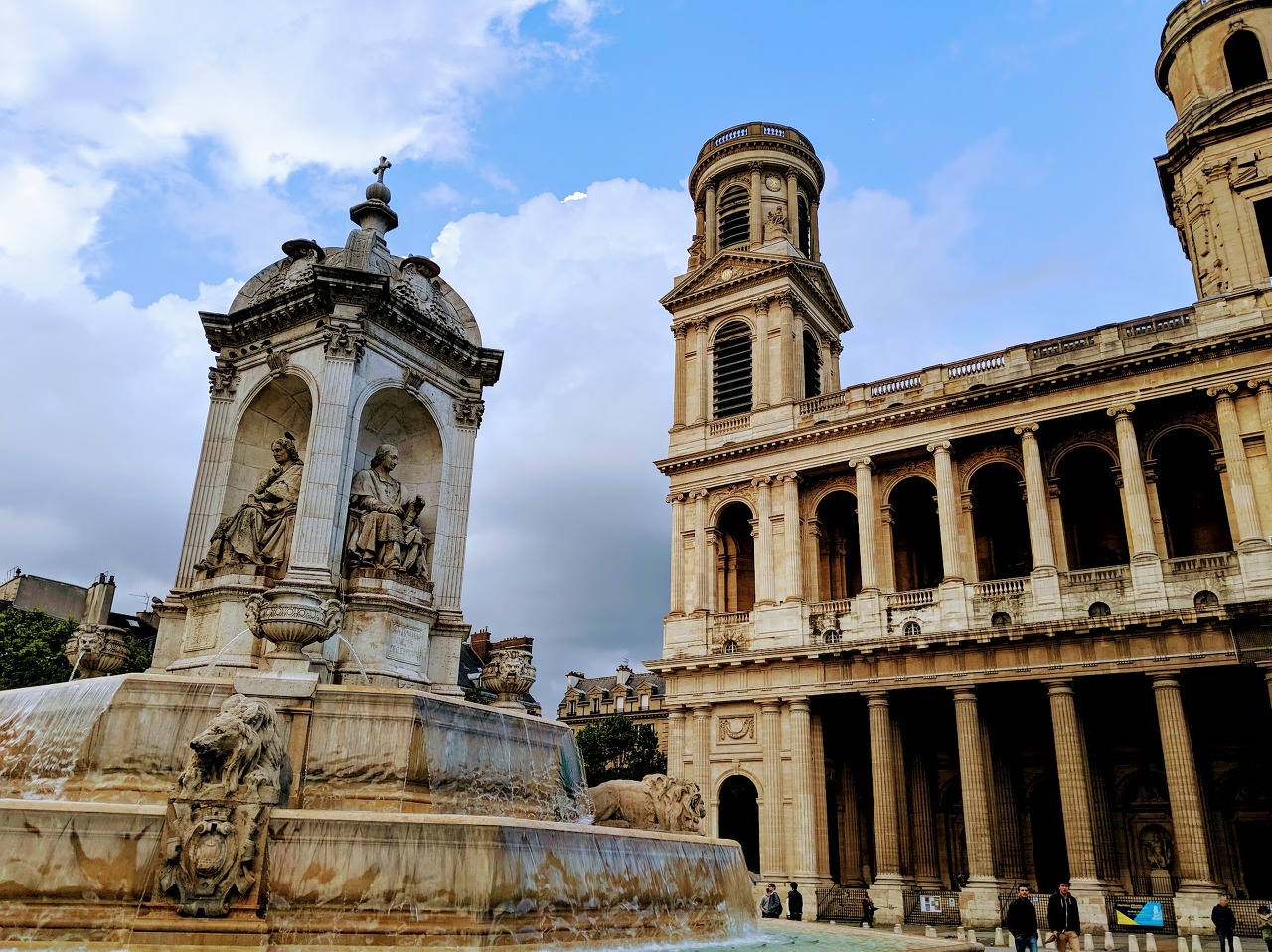파리를 걸어다니며 구경하시기를 간곡히 권해드리는 이유가 바로 이렇게 많이 알려지지 않았지만 보석같은 풍경들이 소소하게 숨어있어서인데요, 이 어여쁜 분수도 아마 관광책자에서는 찾지 못하실 거에요. 생 쉴피스 성당 앞에 있는 생 쉴피스 분수(Fontaine Saint-Sulpice, 지도)랍니다. 다녀와서 찾아보니 다빈치 코드로 더 유명해진 성당이라고 하네요. 저희는 이 영화에 별로 관심이 없어서 생 쉴피스 성당에 일부러 찾아가 보지는 않았지만 길을 걷다 우연히 분수가 예뻐서 찍어왔어요.