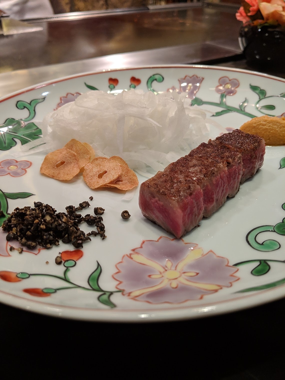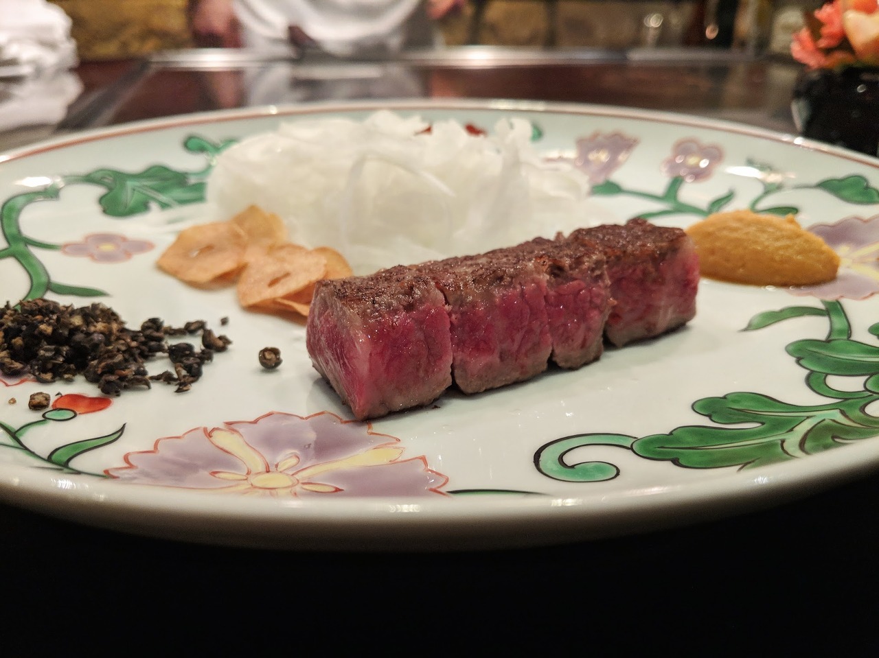 드디어 대망의 와규 스테이크입니다. 오늘 코스의 꽃이라고 할 수 있죠. 양이 적다고 느끼시겠지만 일본에서 이 정도면 매우 당연한 양이에요. 그만큼 비싼 고기이기도 합니다. 정말 버터를 베어 문 듯 풍부한 육즙이 주르르 흘러나오고요, 입에서 그냥 녹아서 사라집니다. 물론 더 먹고 싶긴 하지만 기름기가 매우 많은 요리인만큼 이 정도 먹고 넘어가는 것이 건강에는 좋을 것 같기도 해요. 와규만 실컷 드시고 싶으신 분들을 위해 조만간 도쿄 와규 코스 포스팅도 준비하겠습니다.