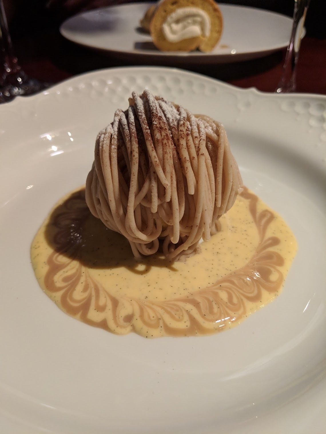 식사를 마치면 자리를 옮길 수 있게 안내해 줍니다. 디저트와 티가 코스에 포함되어 있는데요, 디저트 수준도 상당합니다. 웬만한 고급 베이커리 뺨치는 수준의 몽블랑과 롤케이크, 커스타드 푸딩을 맛봤어요. 우리나라에서 몽블랑, 하면 전혀 다른 빵을 의미하는 것 같은데 일본에서는 밤크림을 얇은 파이핑으로 얹은 부드러운 케이크를 말합니다. 이 몽블랑 케이크 역시 웬만한 양과자점에 가시면 항상 있는 주요 메뉴입니다. 저도 참 좋아해서 자주 사먹었어요.