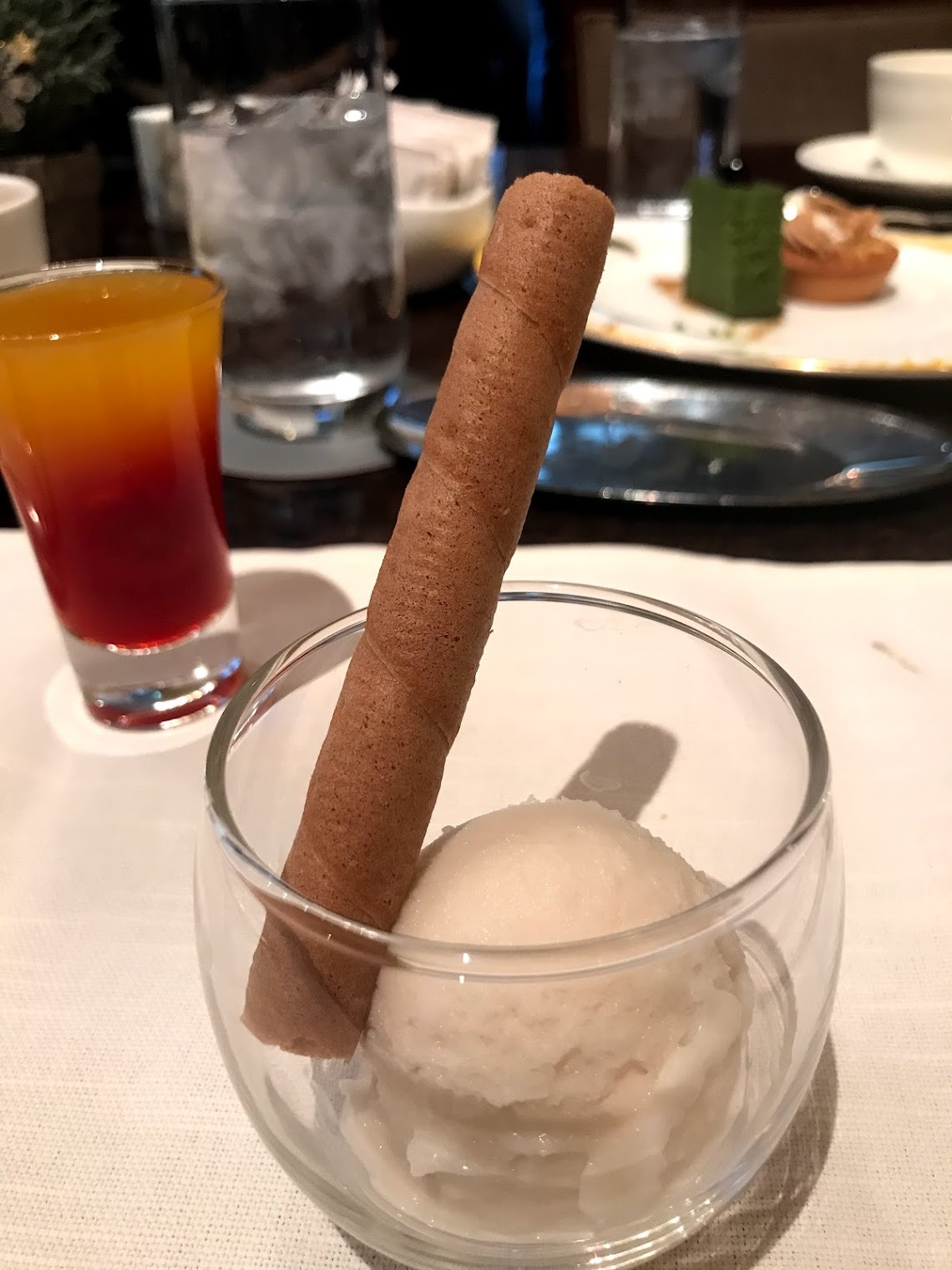 이 아이는 크레미아 아이스크림과는 따로 제공되는 셔벗타입입니다. 작은 유리잔에 담긴 아이는 깔끔한 과일 젤리에요. 일본사람들은 젤리나 무스를 정말 애정하더라고요.