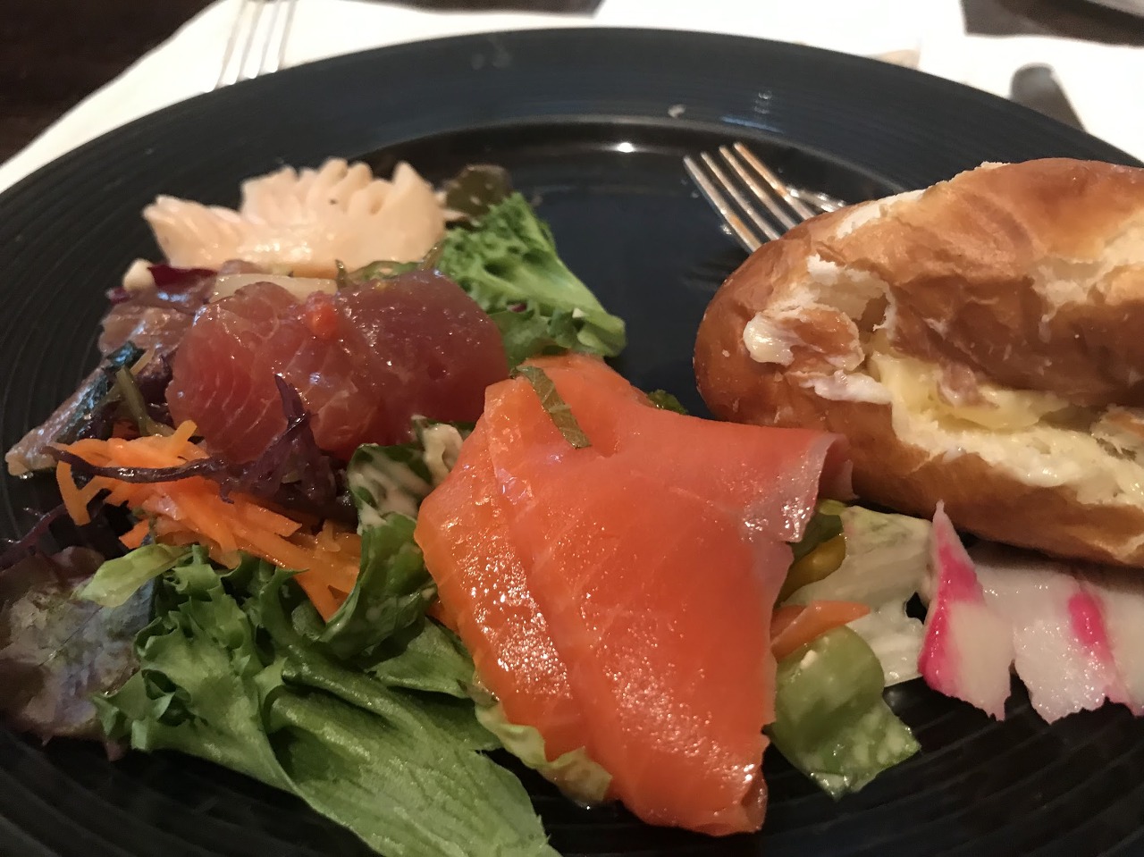 샐러드 조금 위에 연어와 참치 사시미, 및 빵이에요. 도쿄에서 살던 시절이라 사시미는 좀 자제가 됐지만 지금 오랜만에 다시 간다면 스시 및 사시미만 그득그득 담아서 먹을 것도 같네요.