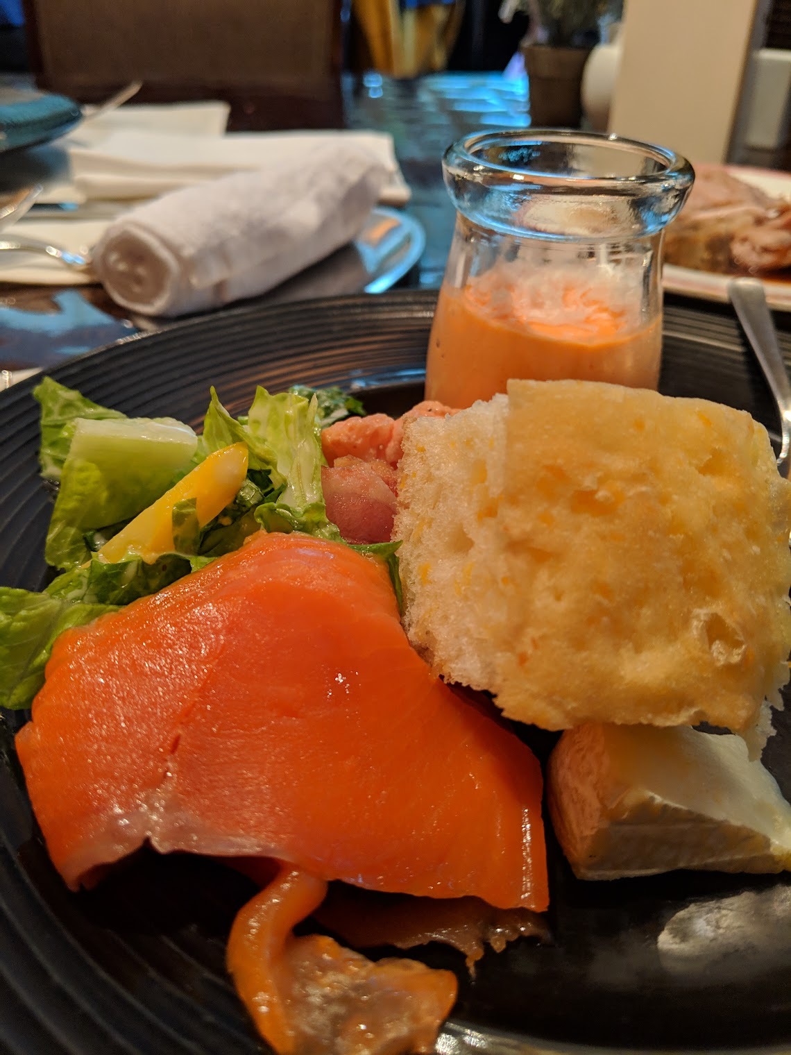 기본적으로 일본의 호텔부페 답게 스시 및 사시미의 수준은 상당합니다. 저희도 이 날 엄청 많이 먹고 왔어요. 다양한 종류의 빵과 치즈도 평균 이상의 훌륭한 맛이였고요. 부드러운 식감을 좋아하는 일본인을 위해 프렌치식 무스도 몇몇 보였습니다. 달콤한 디저트도 있지만 사진에서 보시는 작은 유리병에 담긴 오렌지색 무스는 식사로 드시는 짭쪼름한 전채요리에요.