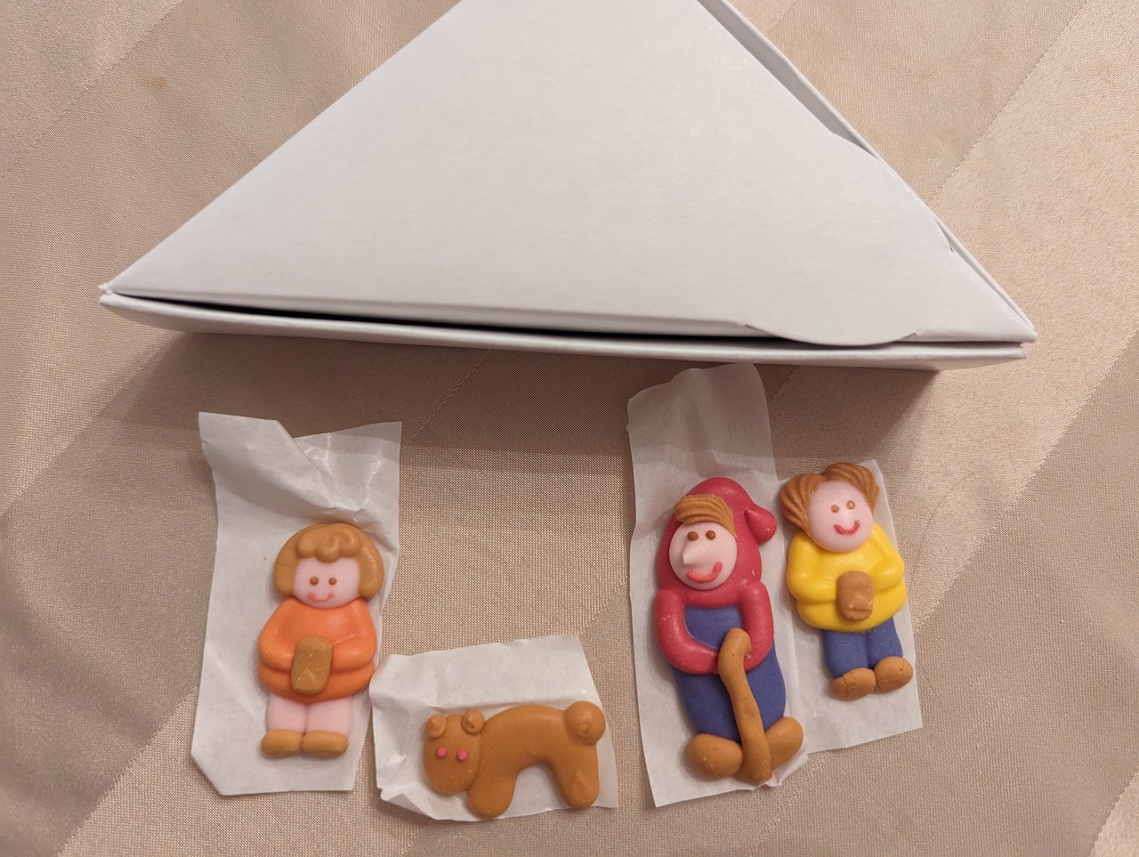 이 삼각형 종이상자는 상자 모양 유지용인지 아님 과자 파손 방지용인지 싶어서 버리려다가 우연히 그 안에서 발견한 귀여운 설탕 인형들입니다. 심지어 강아지도 있어요!