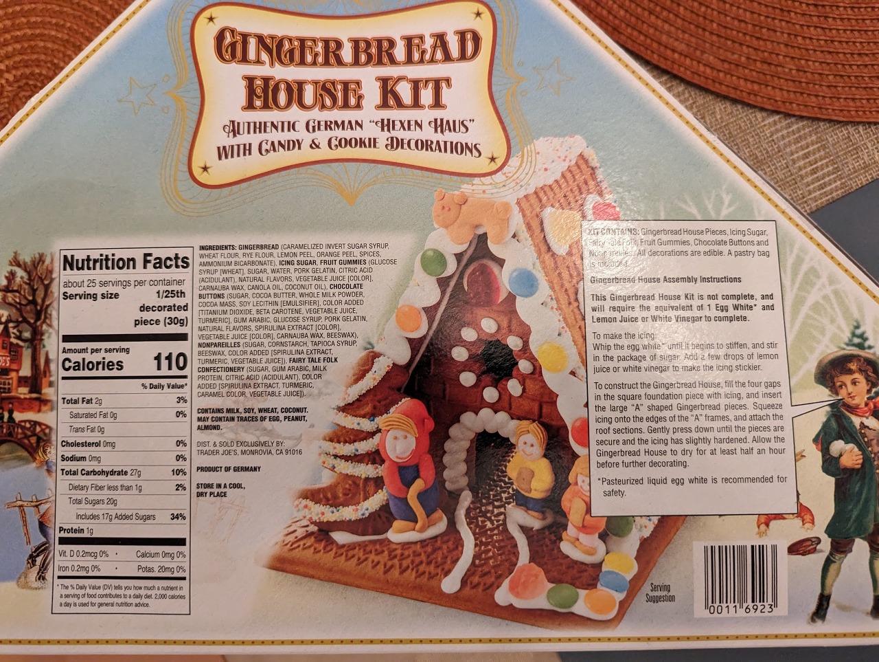 독일에서 만들어 수입해 왔다고 하네요. 진짜 독일식 집 디자인이라고 열심히 써놨습니다. 대체 왜? 라는 생각은 했는데 지금 찾아보니 진저브레드 하우스는 16세기 독일에서 시작된 전통이라고 하네요. 어쨋든 식품이니까 칼로리 및 재료 정보가 적혀 있고요, 가장 중요한 것은 오른쪽에 적힌 조립 방법입니다. 저희는 아이싱 만드는 단계에서 이미 망했어요.